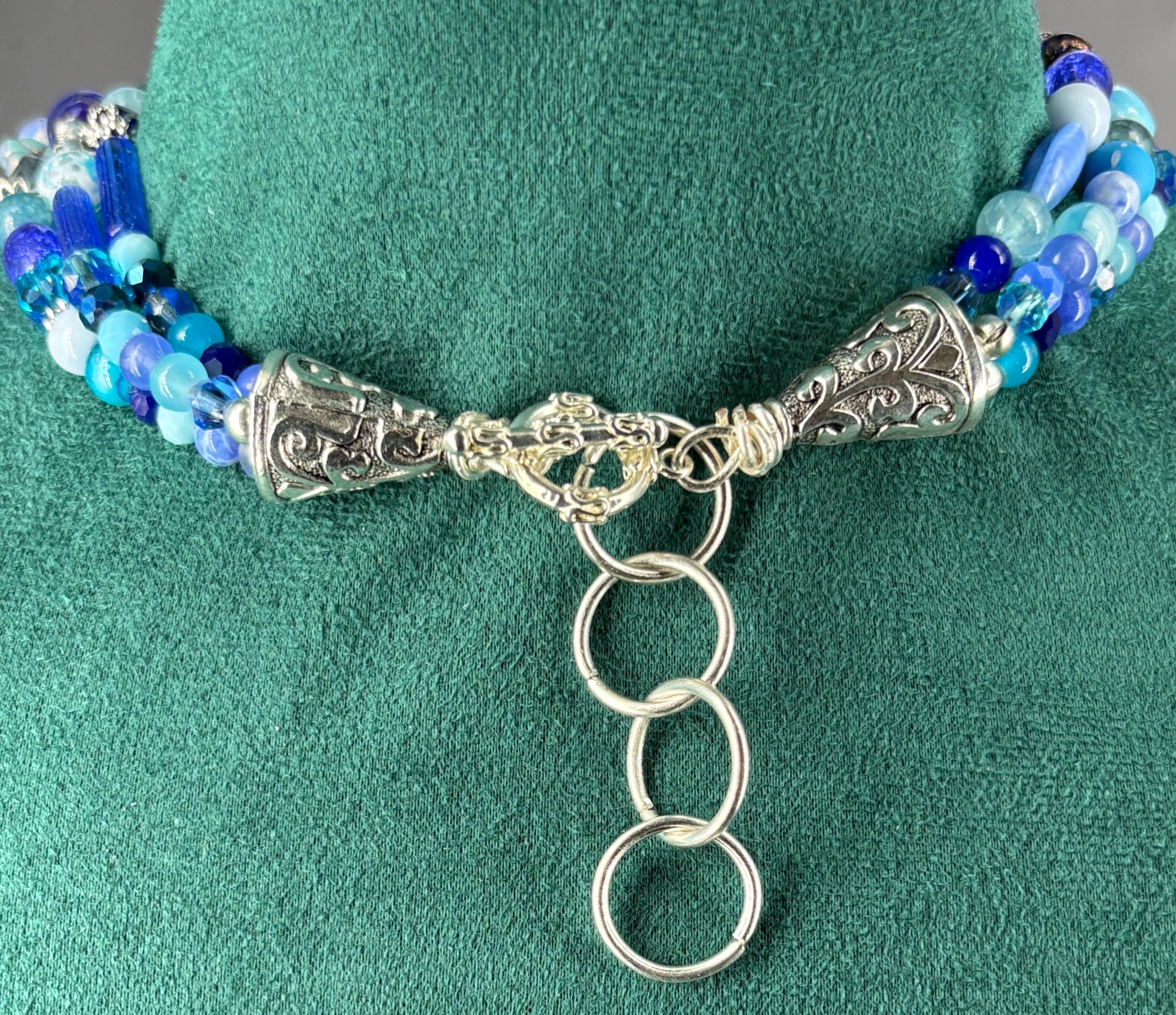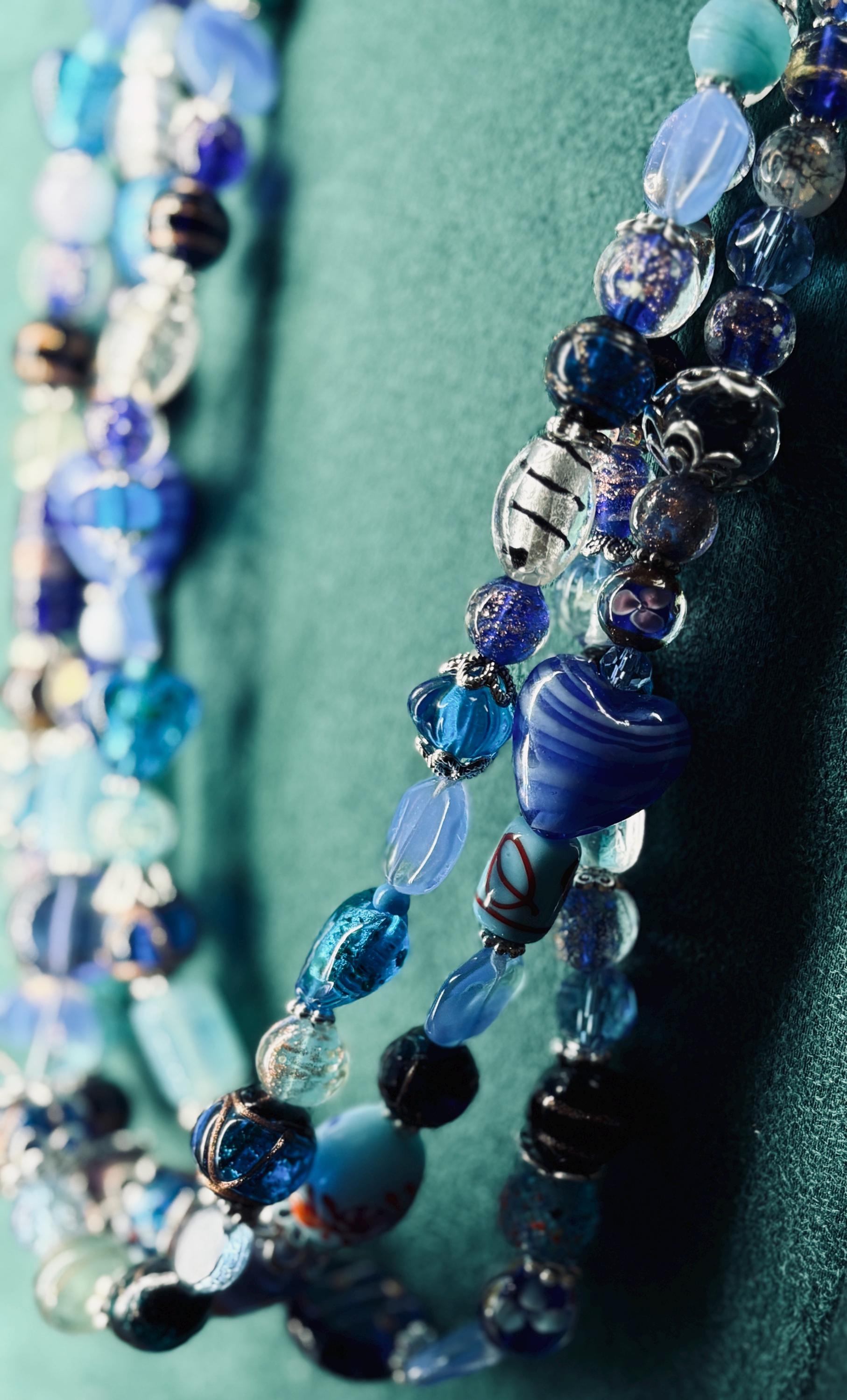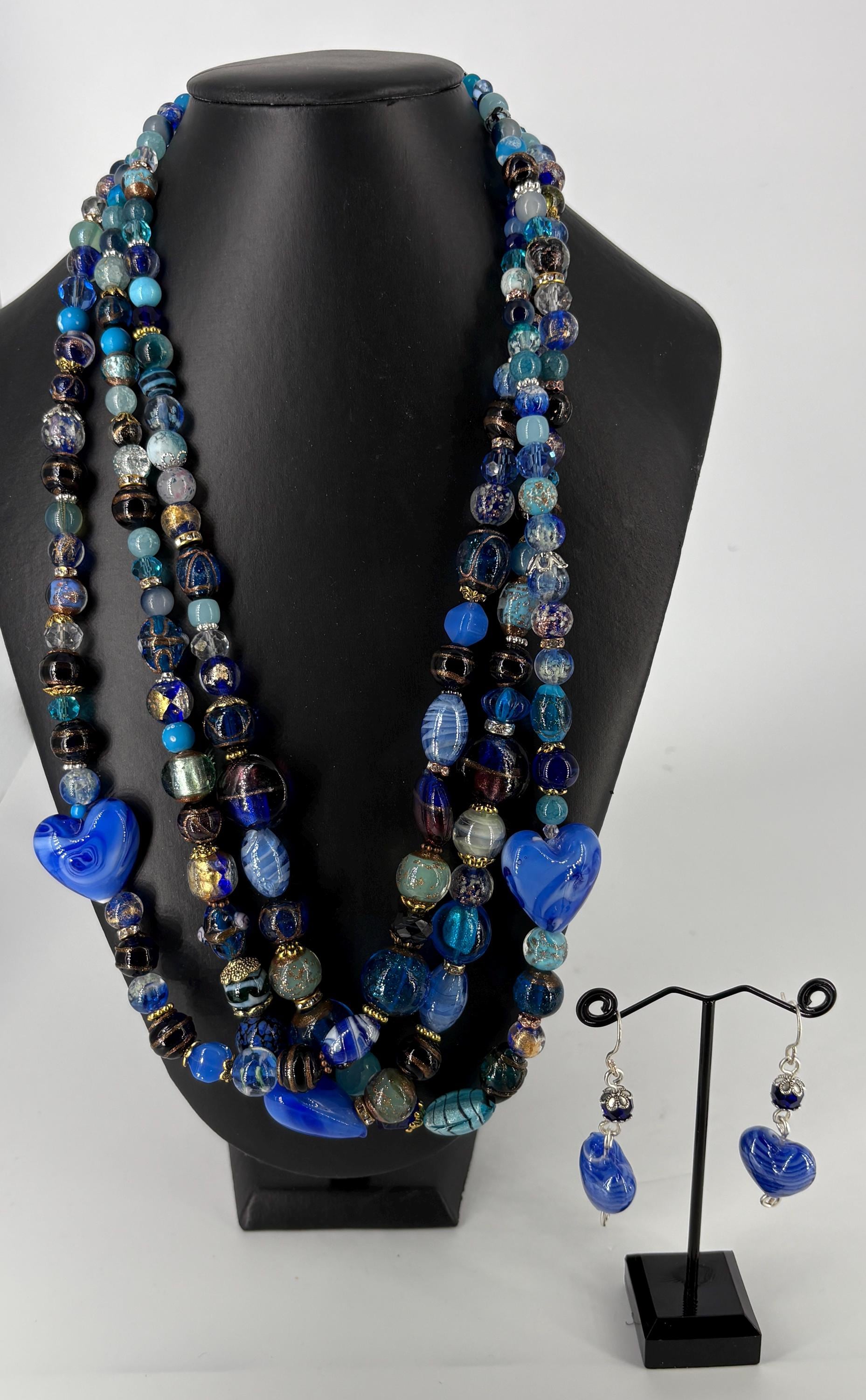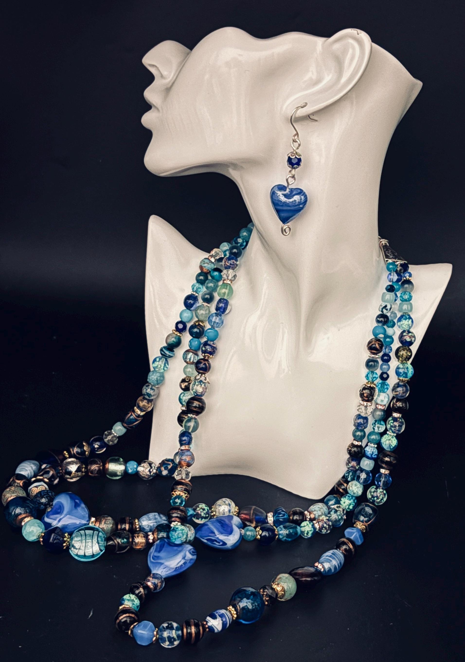 In 2026, if it's not big & bright don't wear it! Biggest fashion jewellery trends of 2026. Big, bold and colourful. Three strand beaded necklace made of crystal and Czech glass beads in different shades of blue. Extends from 72cm to 76cm. There are photos of 2 different styles of earrings, please indicate your preference.