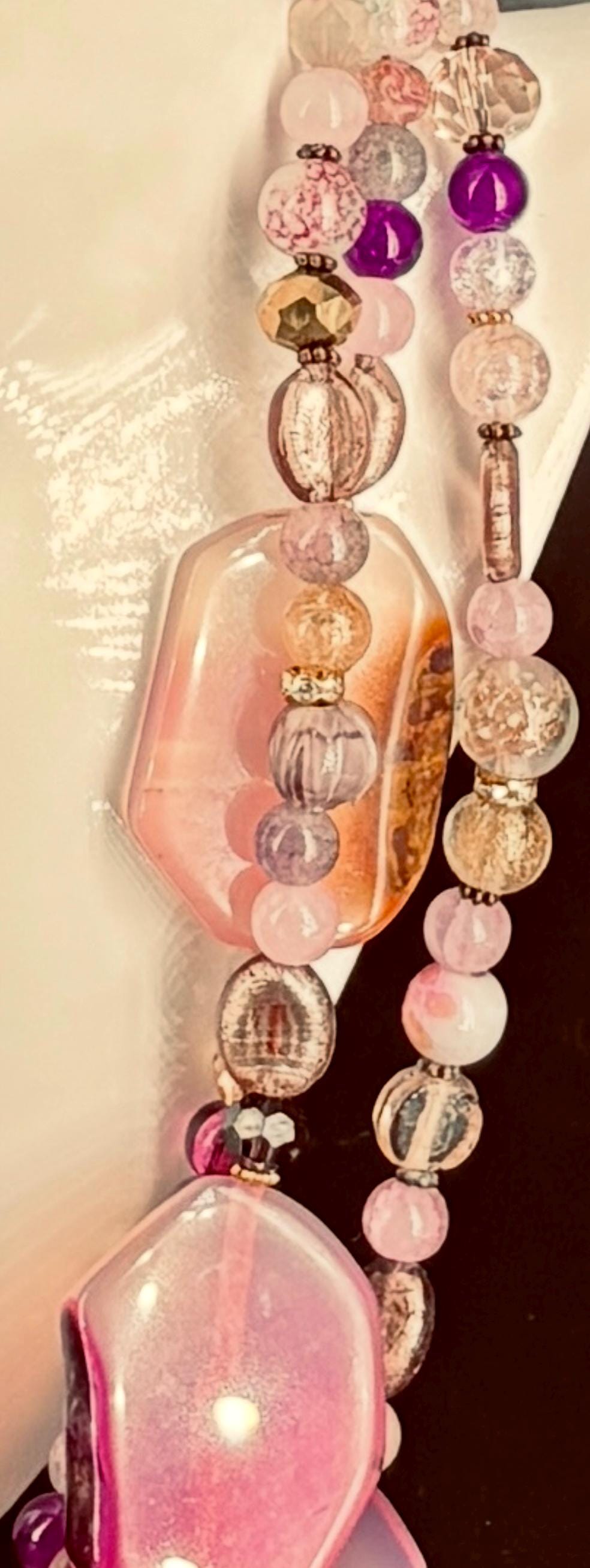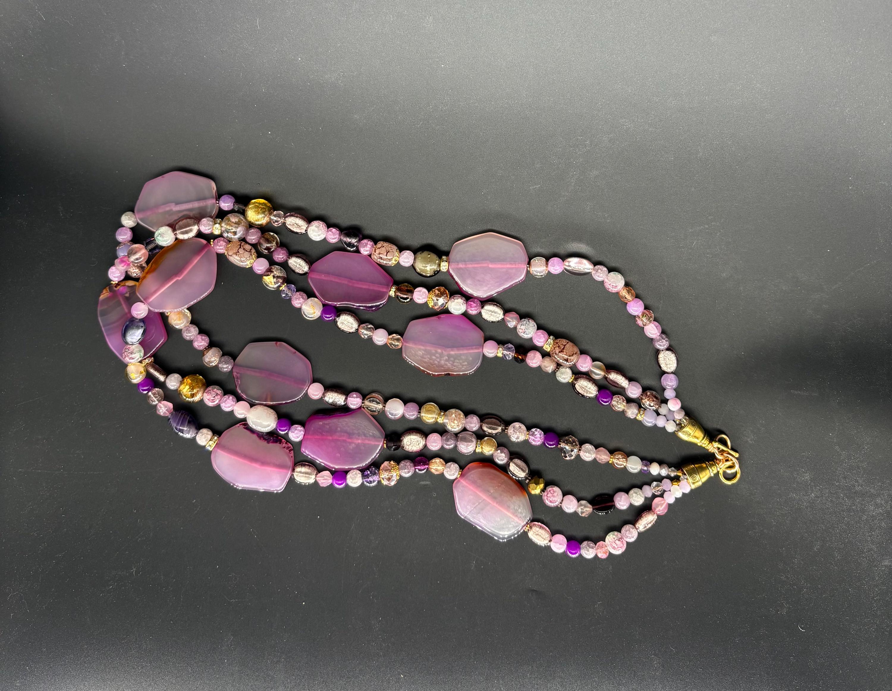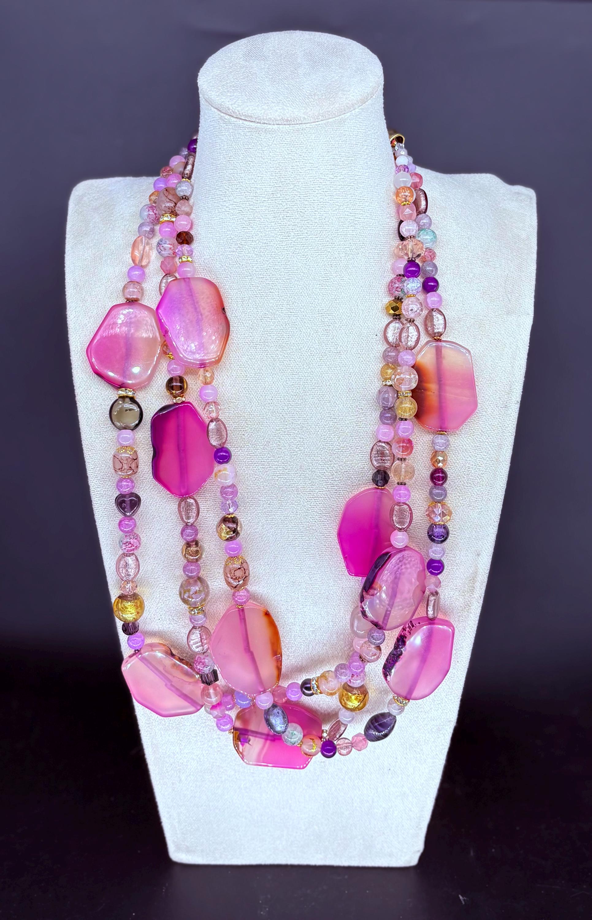 One of the biggest fashion jewellery trends of 2026 is brightly coloured, large beads in statement necklaces. Stand out in this unique multi-strand necklace. Made of large Agate nugget bead 'slices' and Czech glass beads. It measures 74cm(29 inches) extends to 78cm(30 inches). Free earrings.