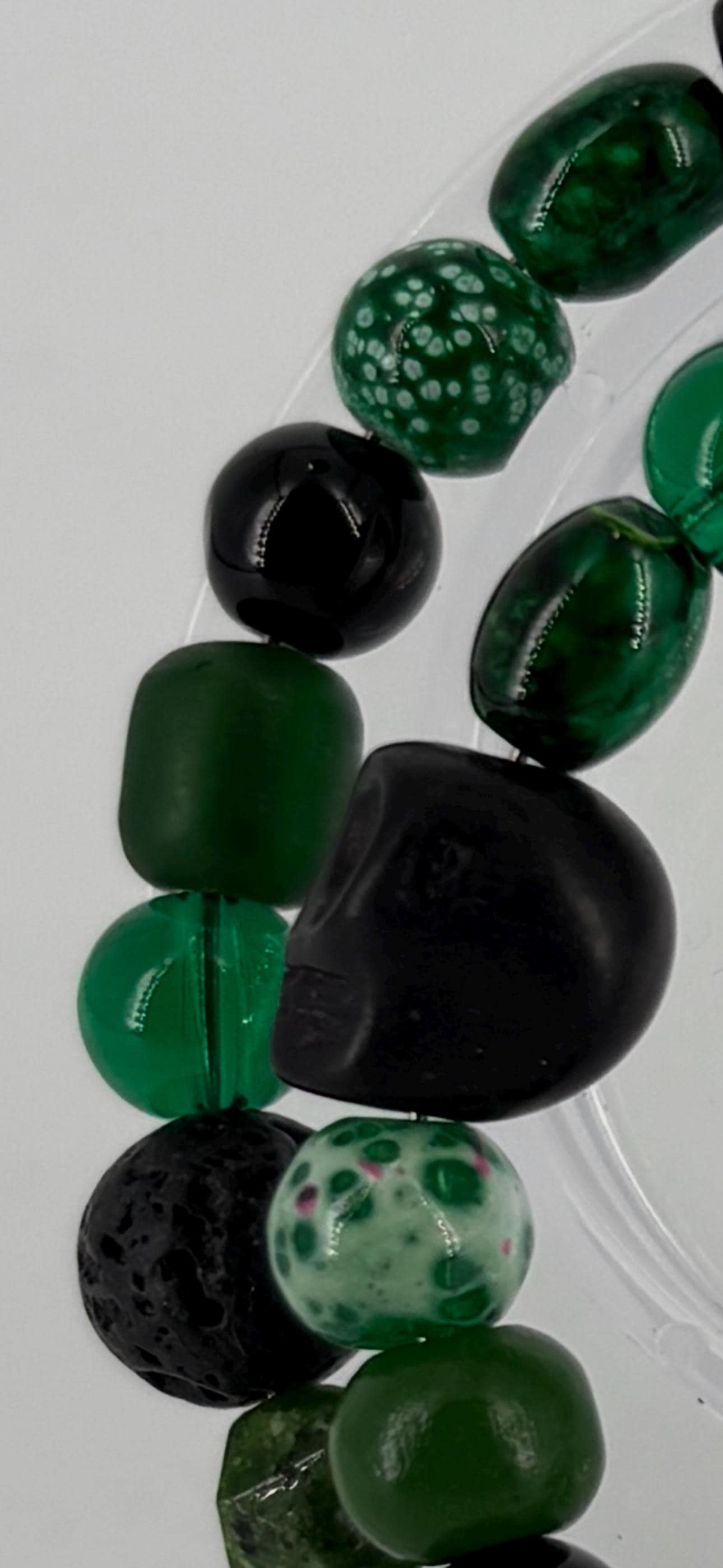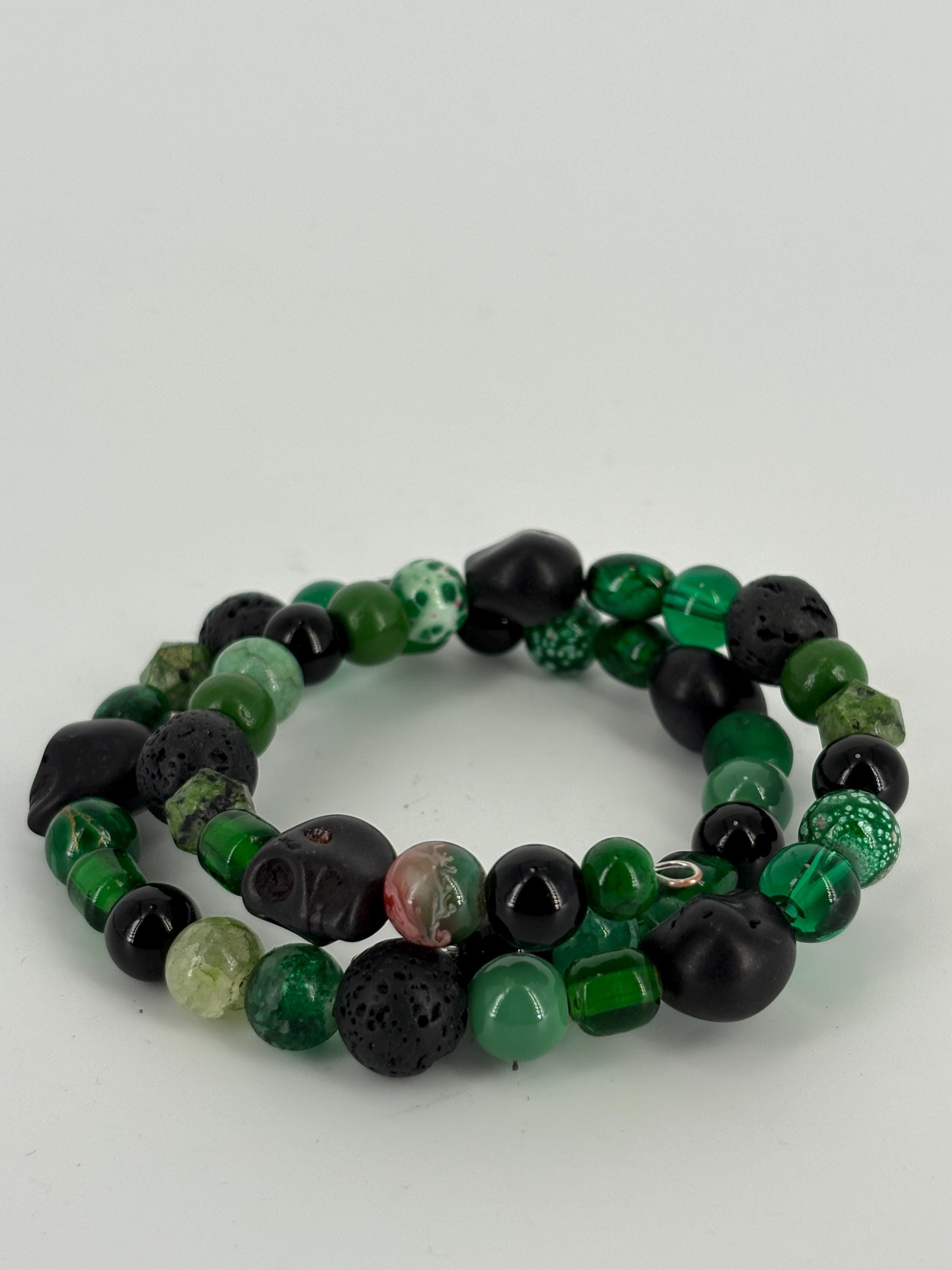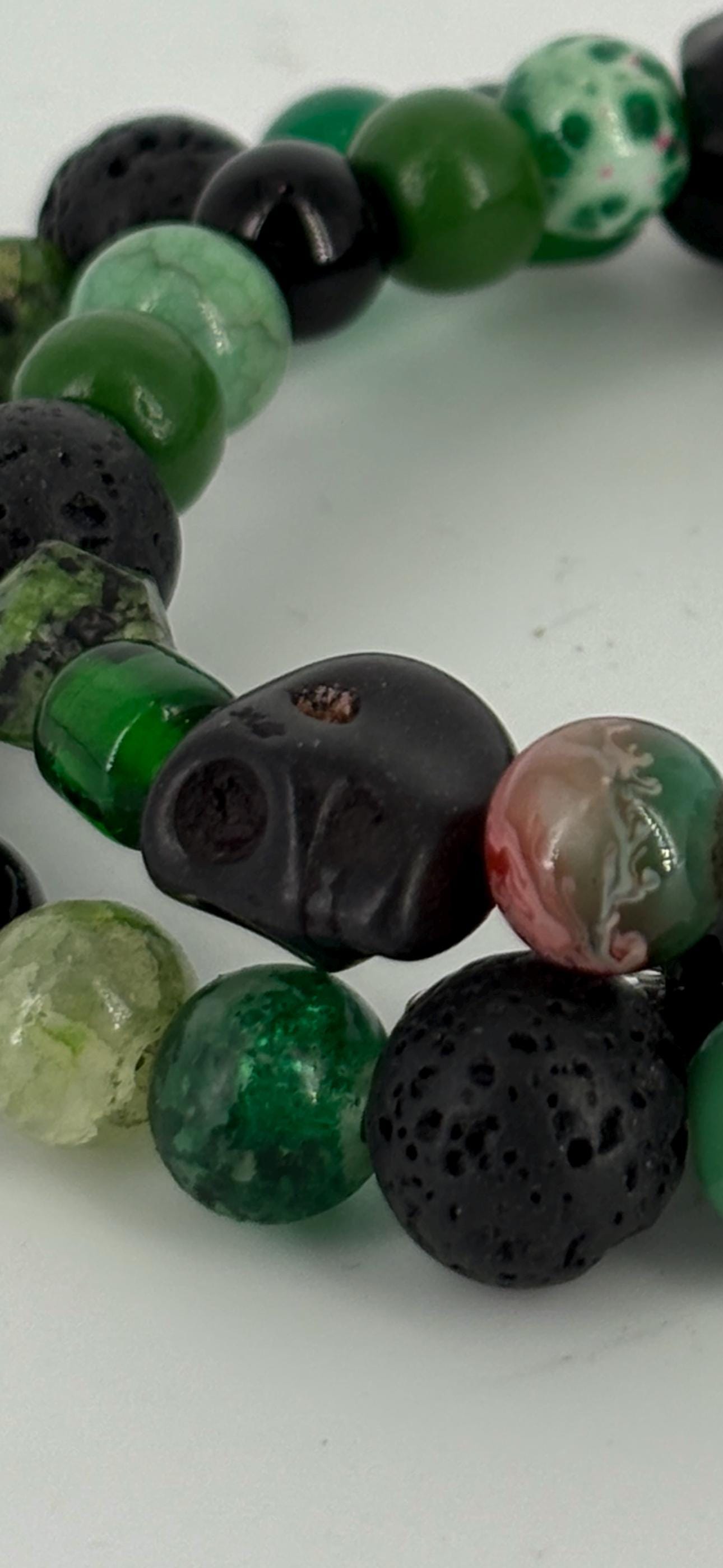 Glass and lava beads with howlite black 'skull' beads make up this unique bracelet. Coiled memory wire – one size fits all sizes and genders. Great gift for men & teenagers.