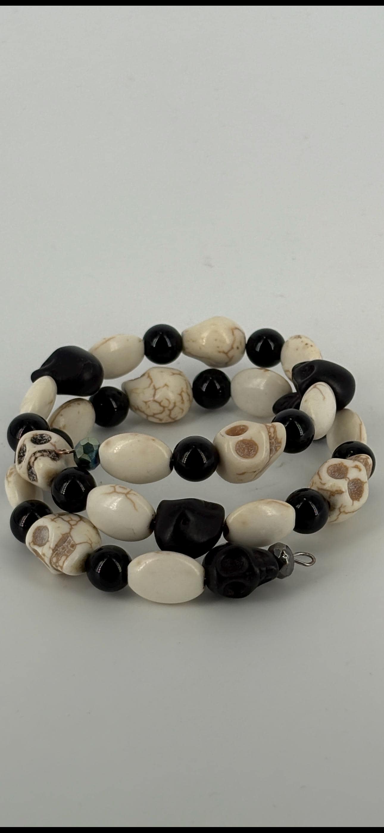 Glass, lava & howlite 'skull' beads make up this unique bracelet. One size fits all sizes and genders - coiled memory wire.