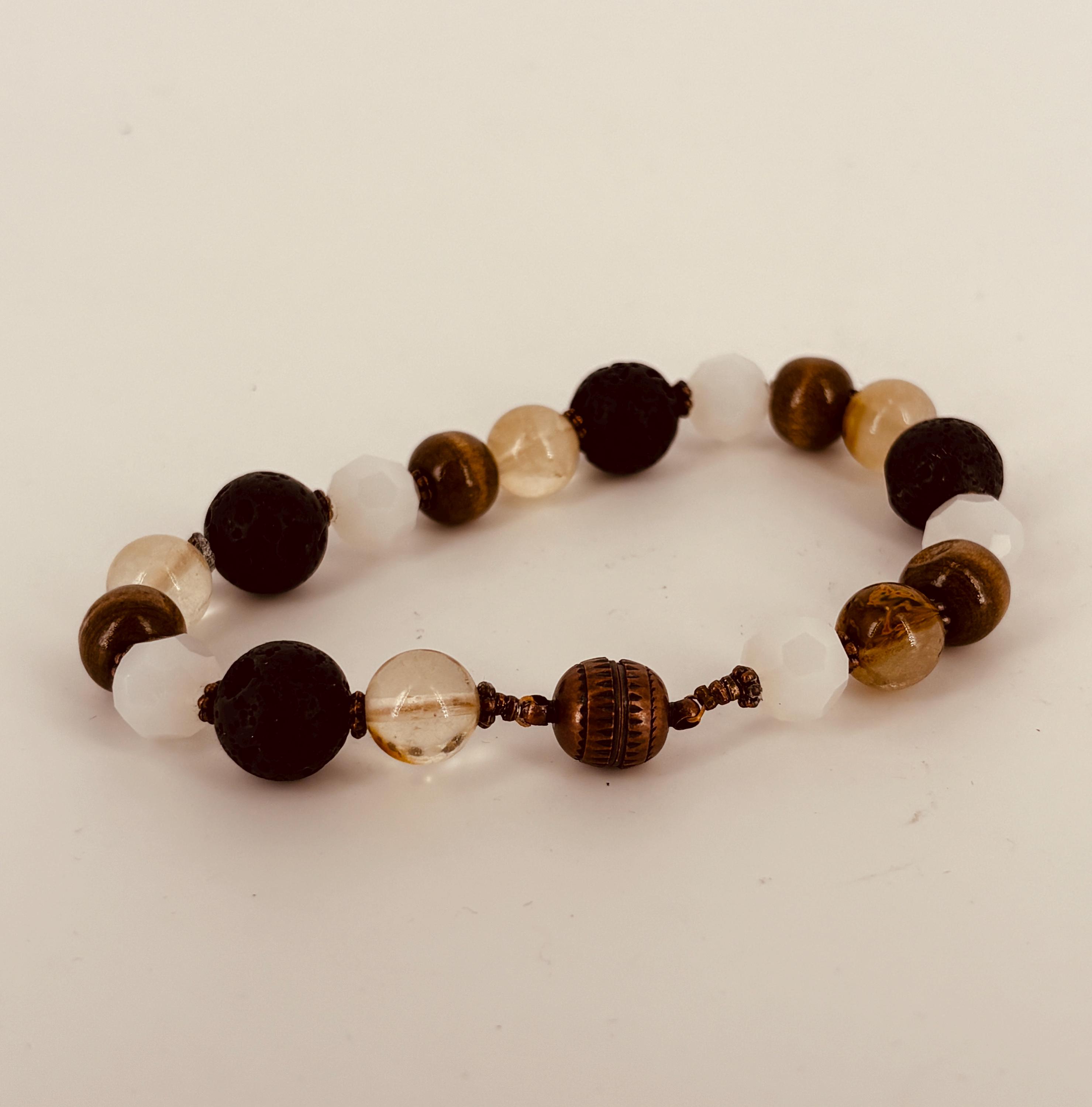 Black, white, cream and brown beads make up this evocative men's bracelet with magnetic clasp. Fits wrist size of 23cm (9.05 inches) or less. Quartz is believed to aid in: manifesting & amplifying other stones’ qualities