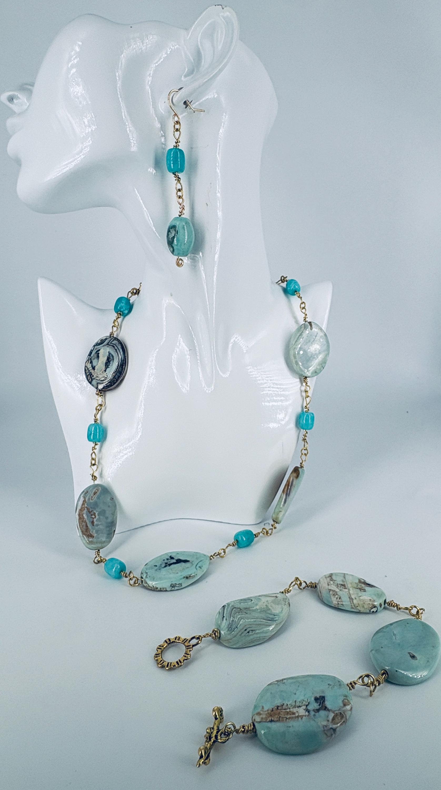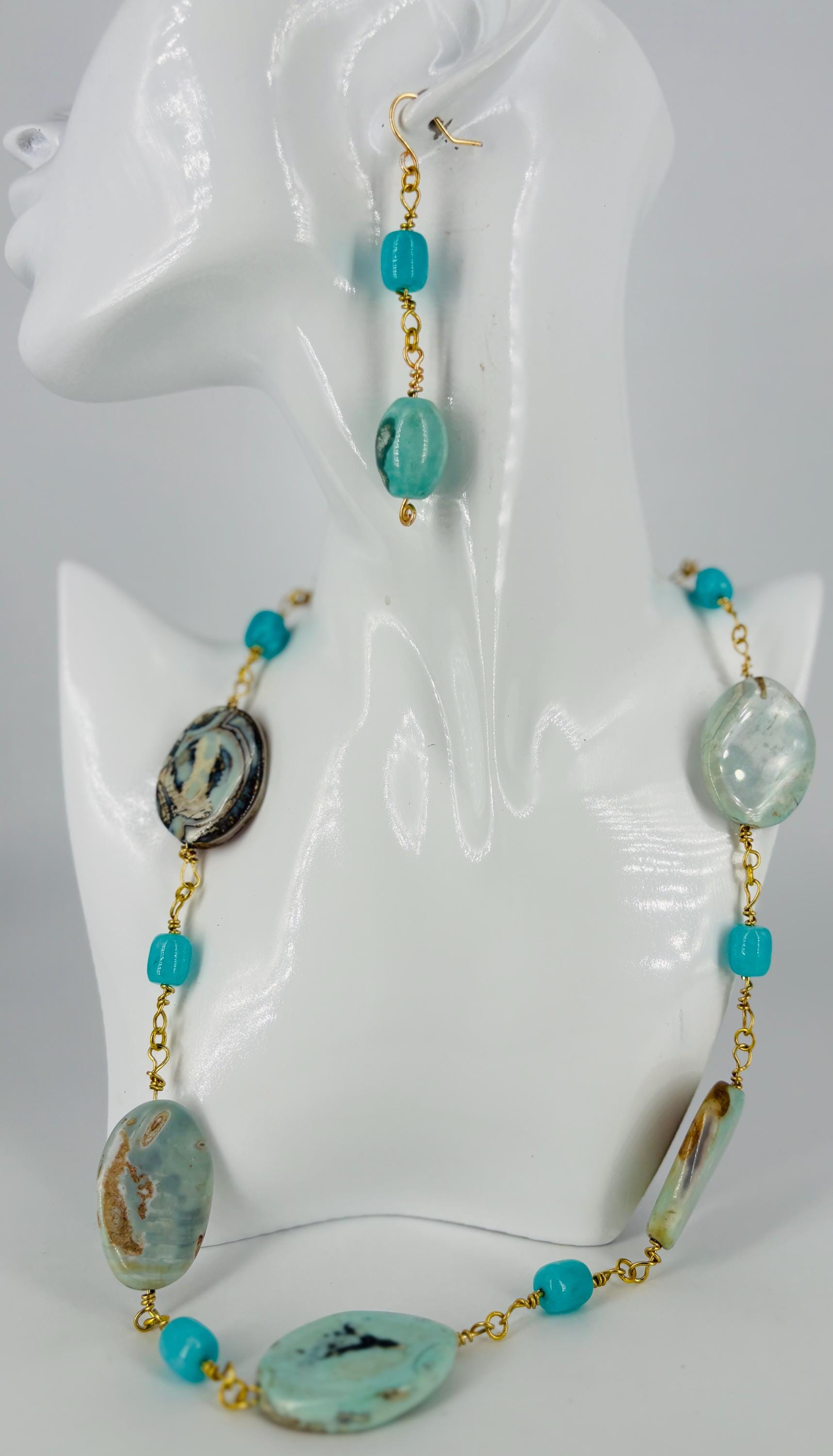 Unique elegant large light turquoise and aqua shell beads linked necklace. Gold plated wire and toggle fastening. 58cm (22.75in) length in total. Matching bracelet listed separately as “Large turquoise Tibetan Agate beads bracelet”.
