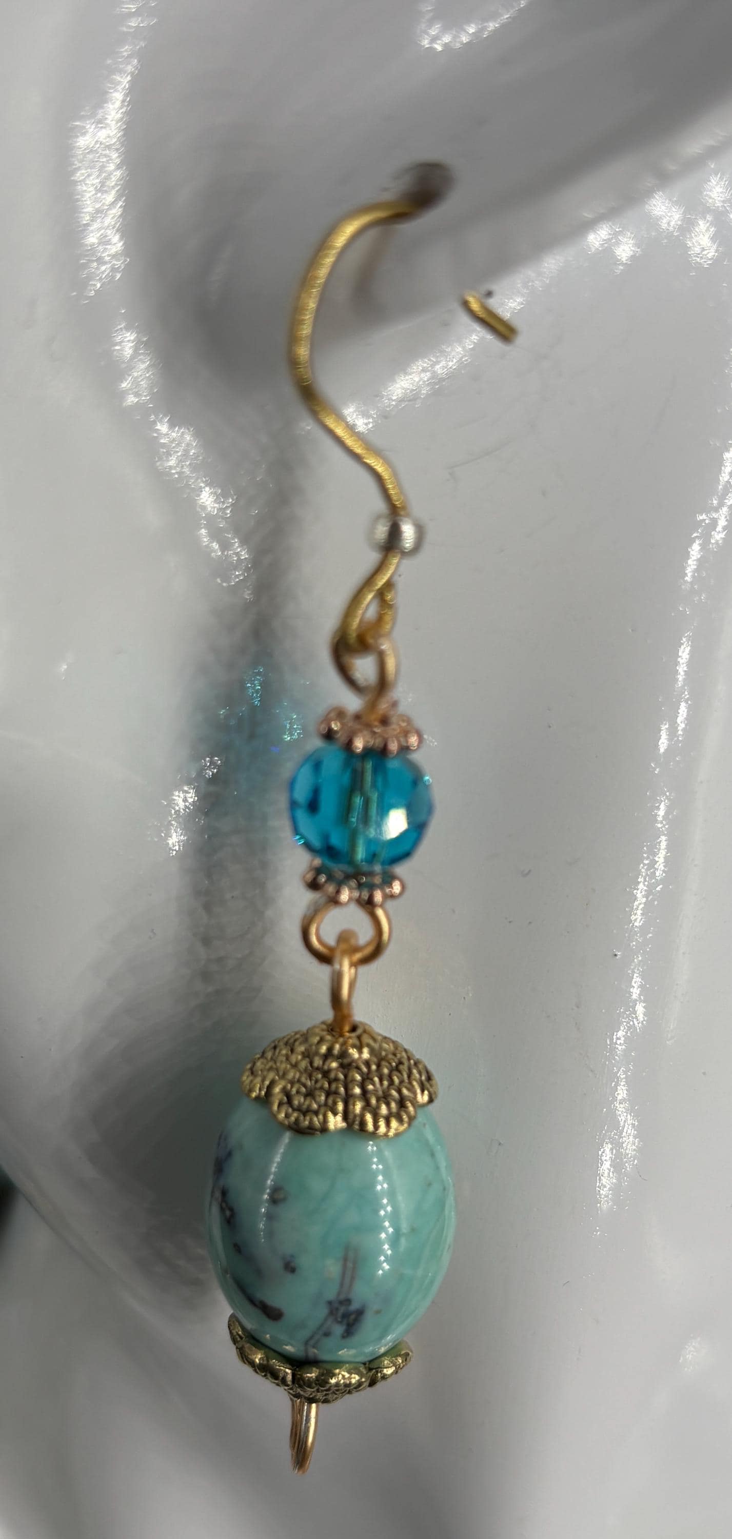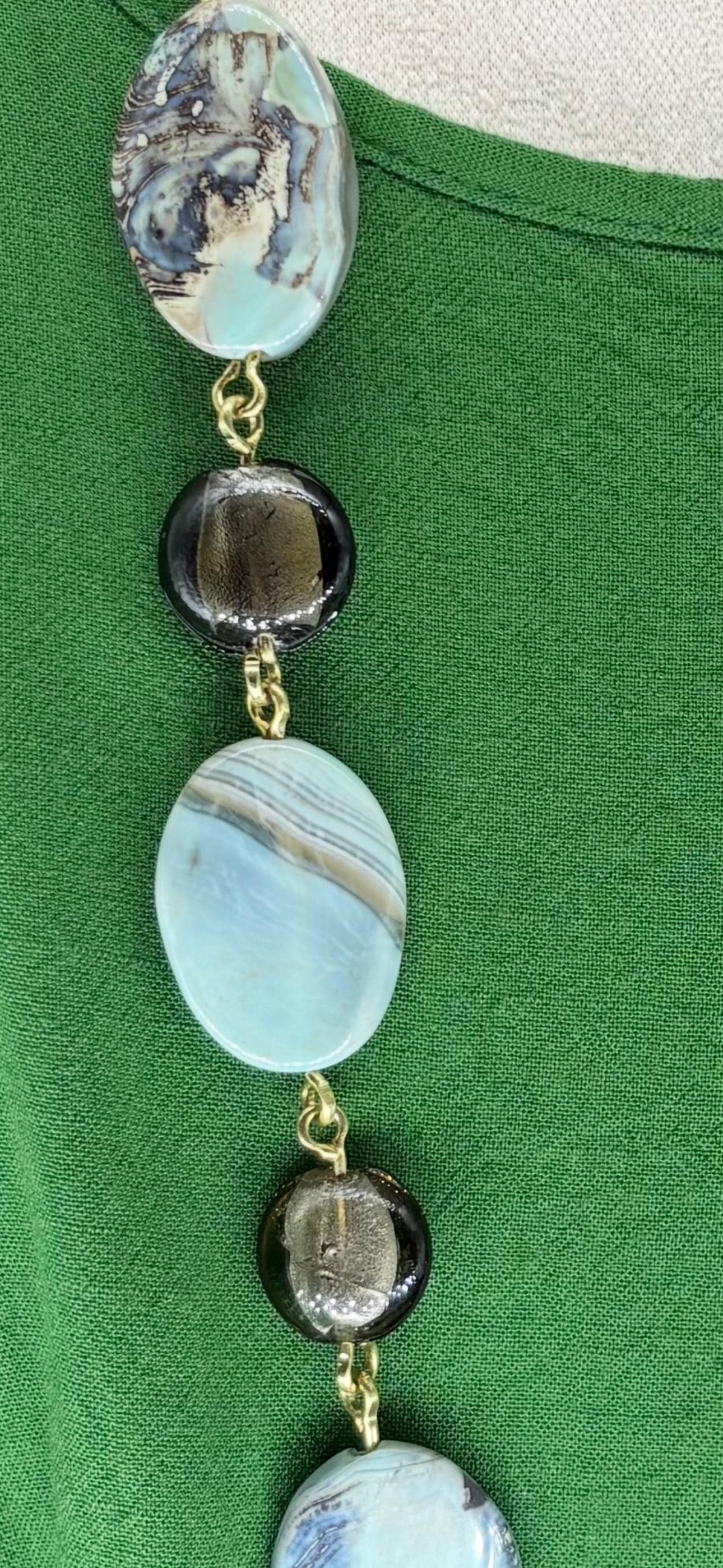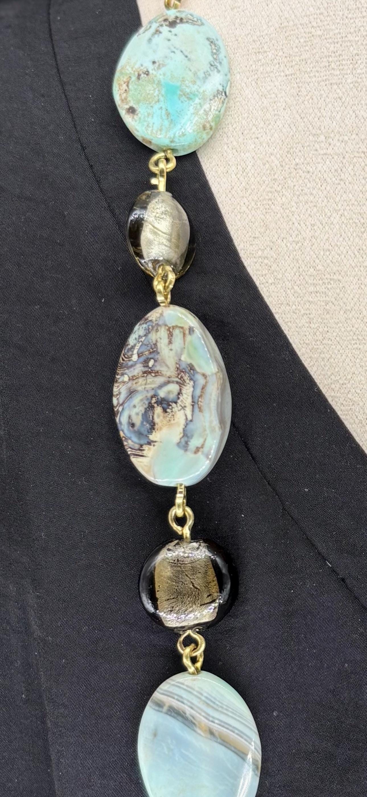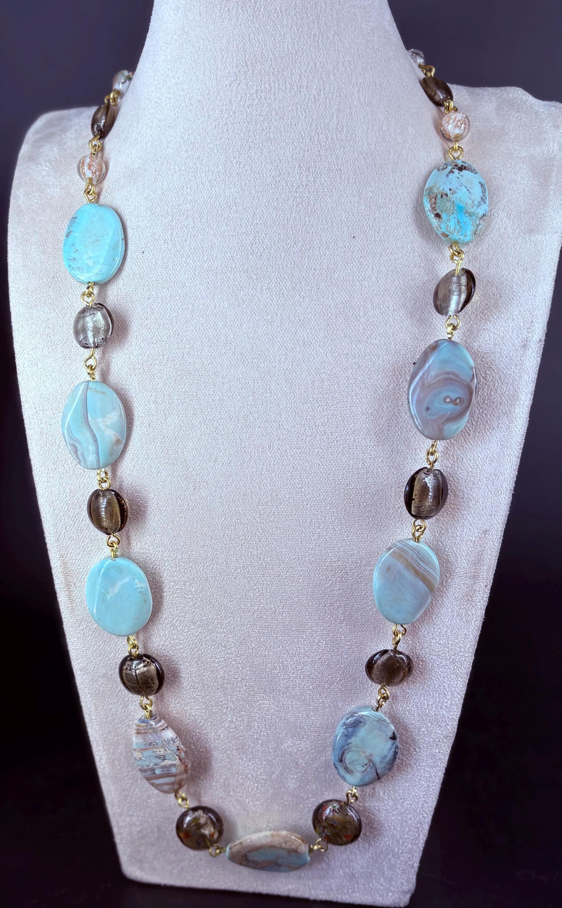 Unique elegant large light turquoise flat oval Tibetan Agate beads and light brown Czech foil lined beaded, linked necklace. Tibetan agate is believed to possess powerful spiritual and protective properties. It is thought to enhance healing, courage & connection between mind, body & spirit.