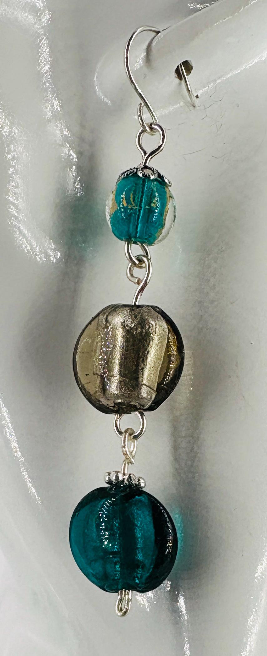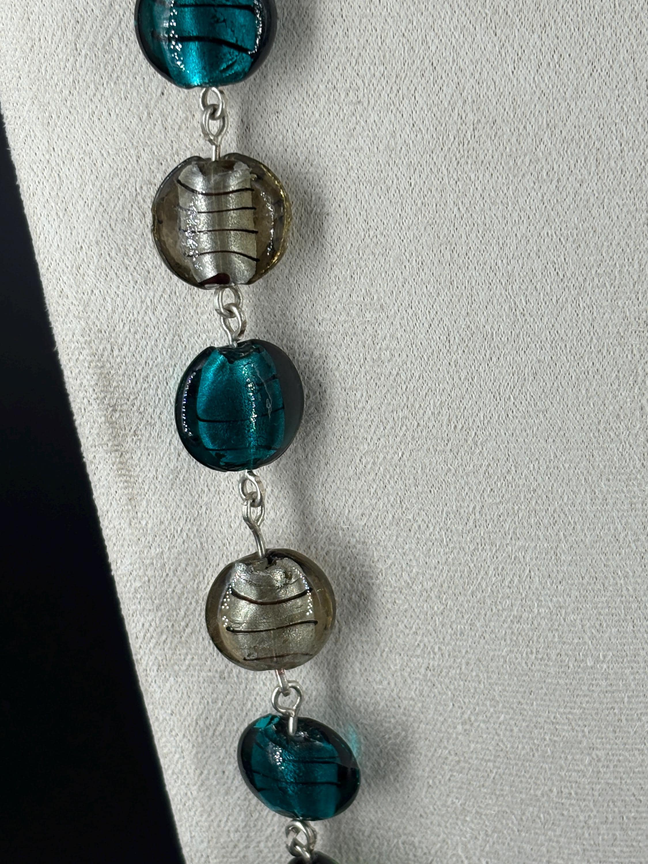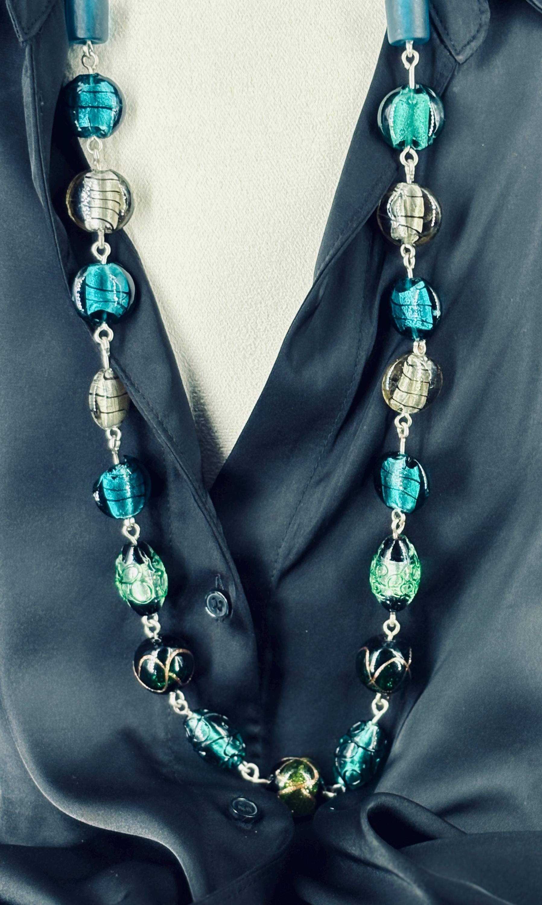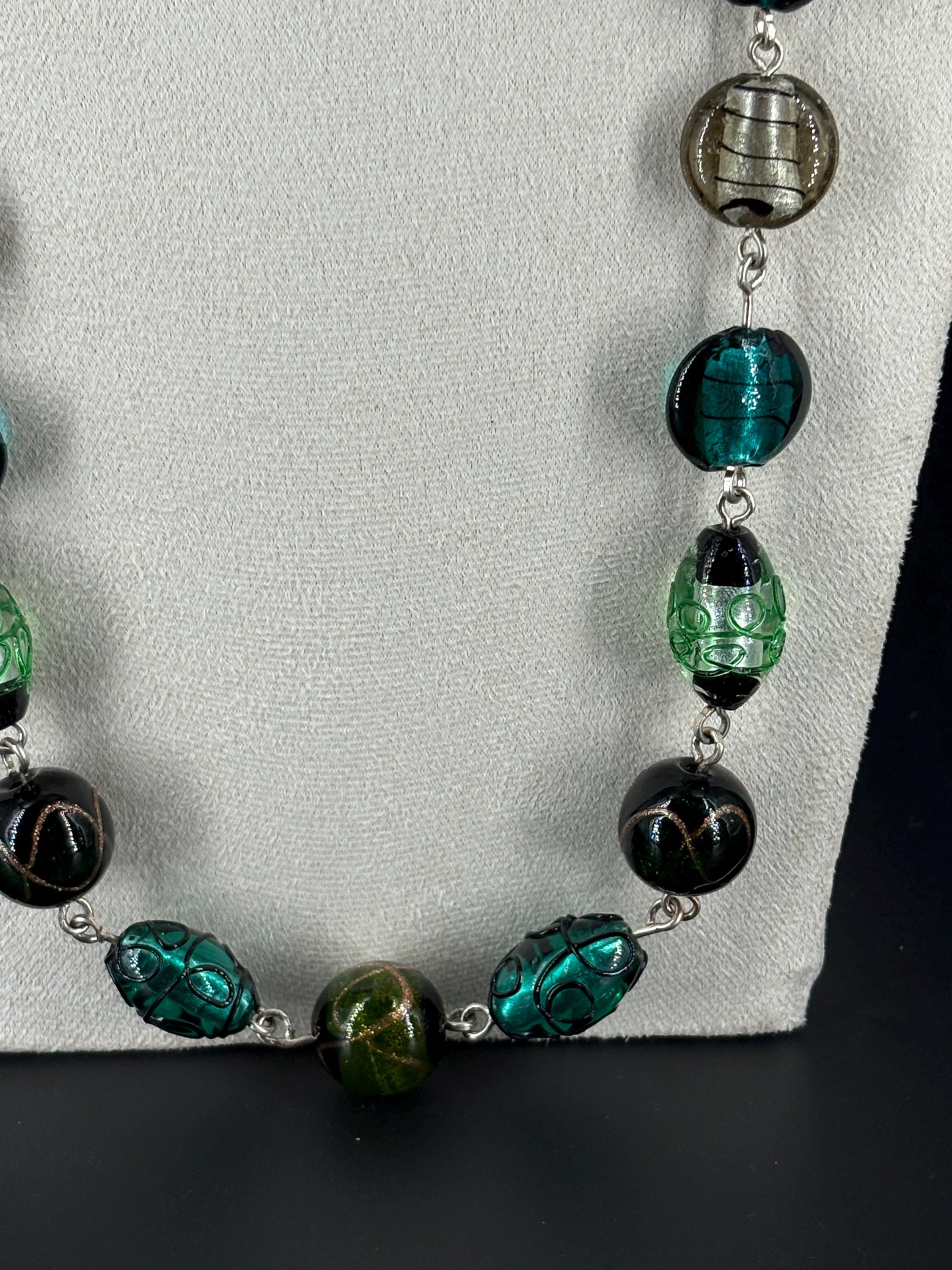 Striking necklace of handmade Czech glass beads. Shades of green, turquoise and silver, linked with 16 gauge silver-dipped copper wire. Czech glass lampwork foil lined beads. Free matching earrings.