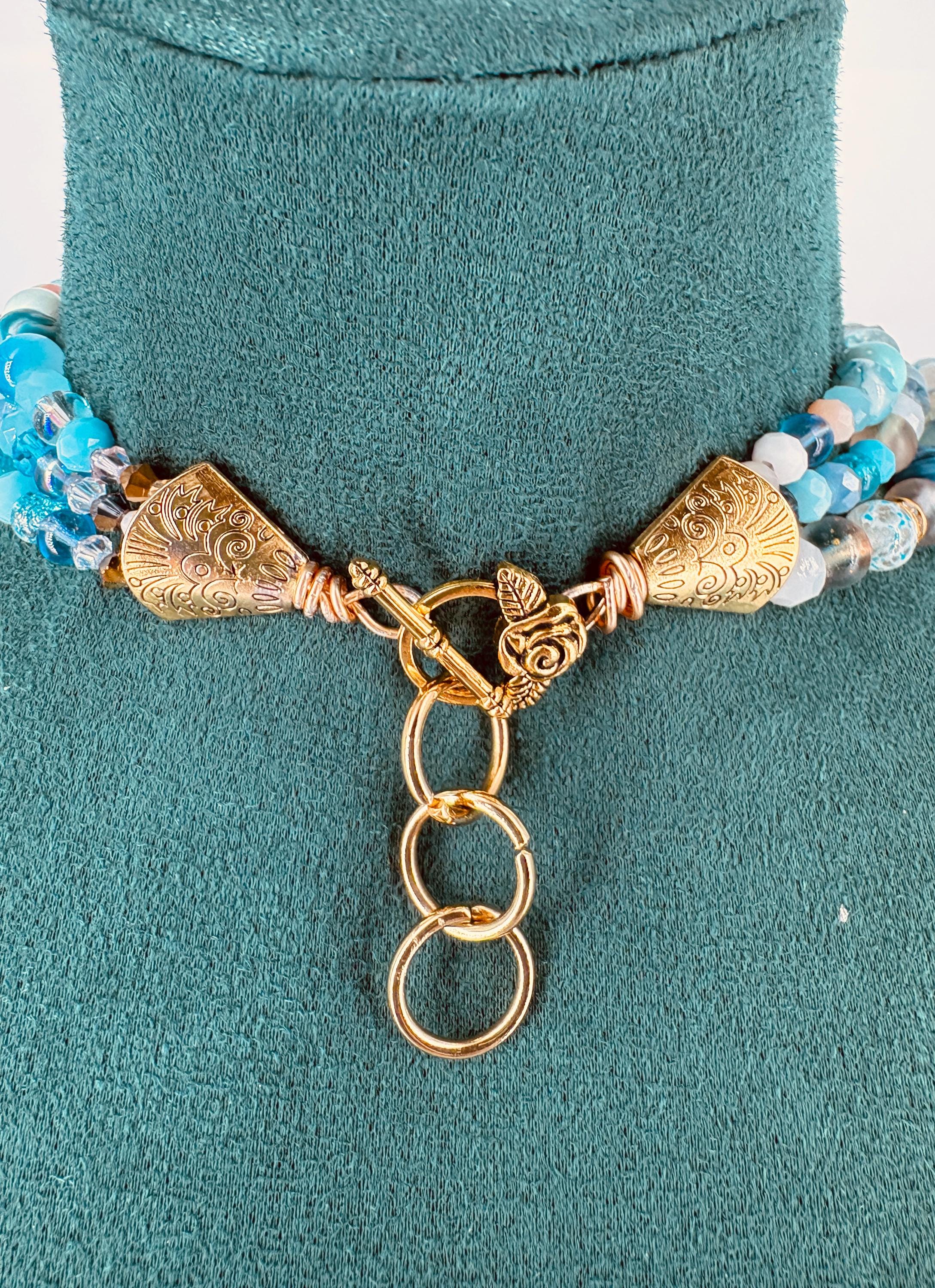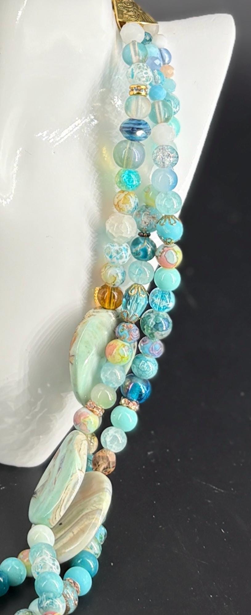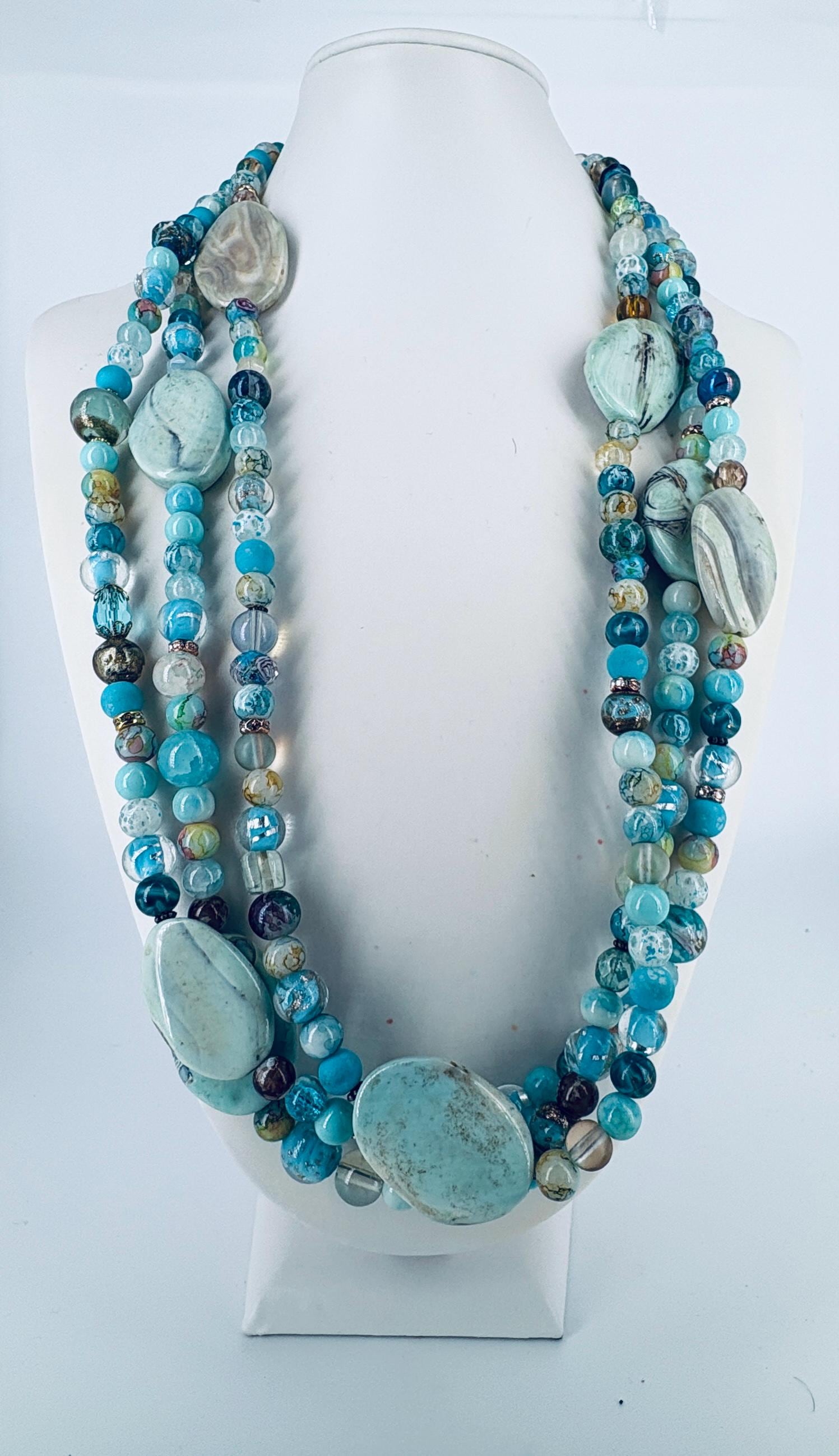 Large Tibetan Agate flat oval beads & glass beads 3 strand necklace; representing the blues of the Australian ocean and beaches. Toggle clasp, 75cm (29.5 inches) extends to 79cm (31 inches).
