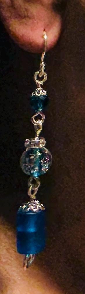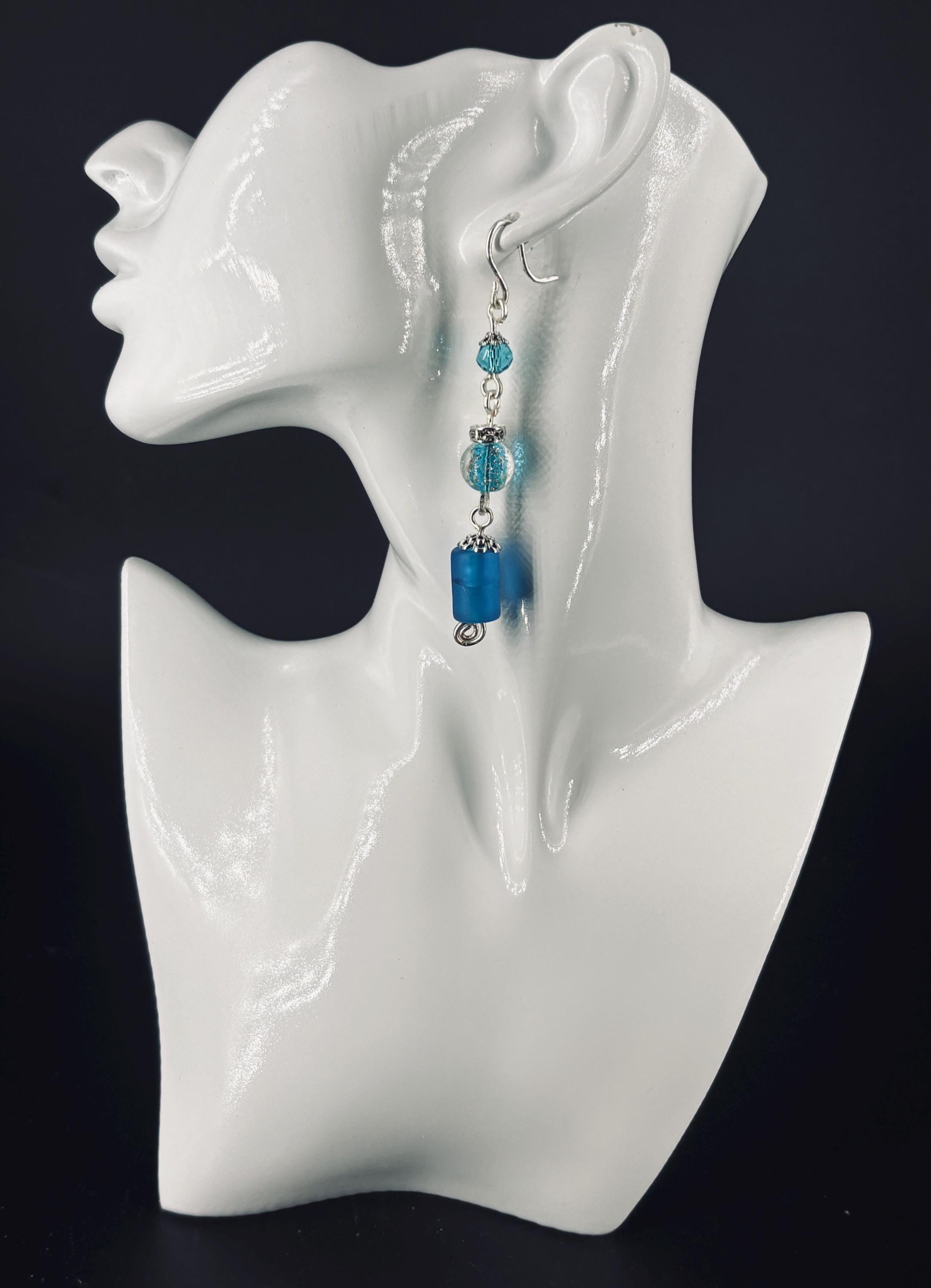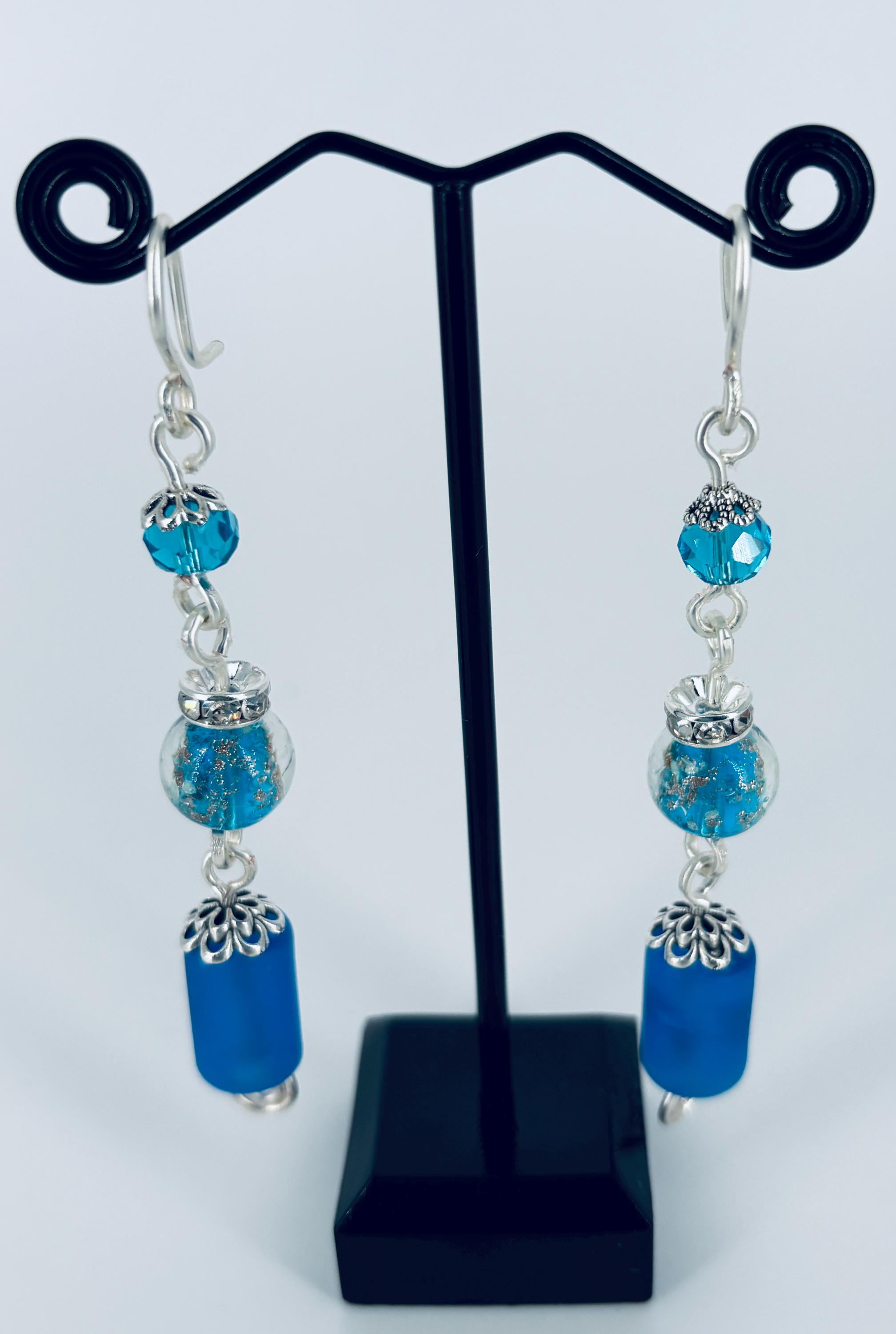 Statement long drop blue and silver earrings. Drop 9cm from ear wires.