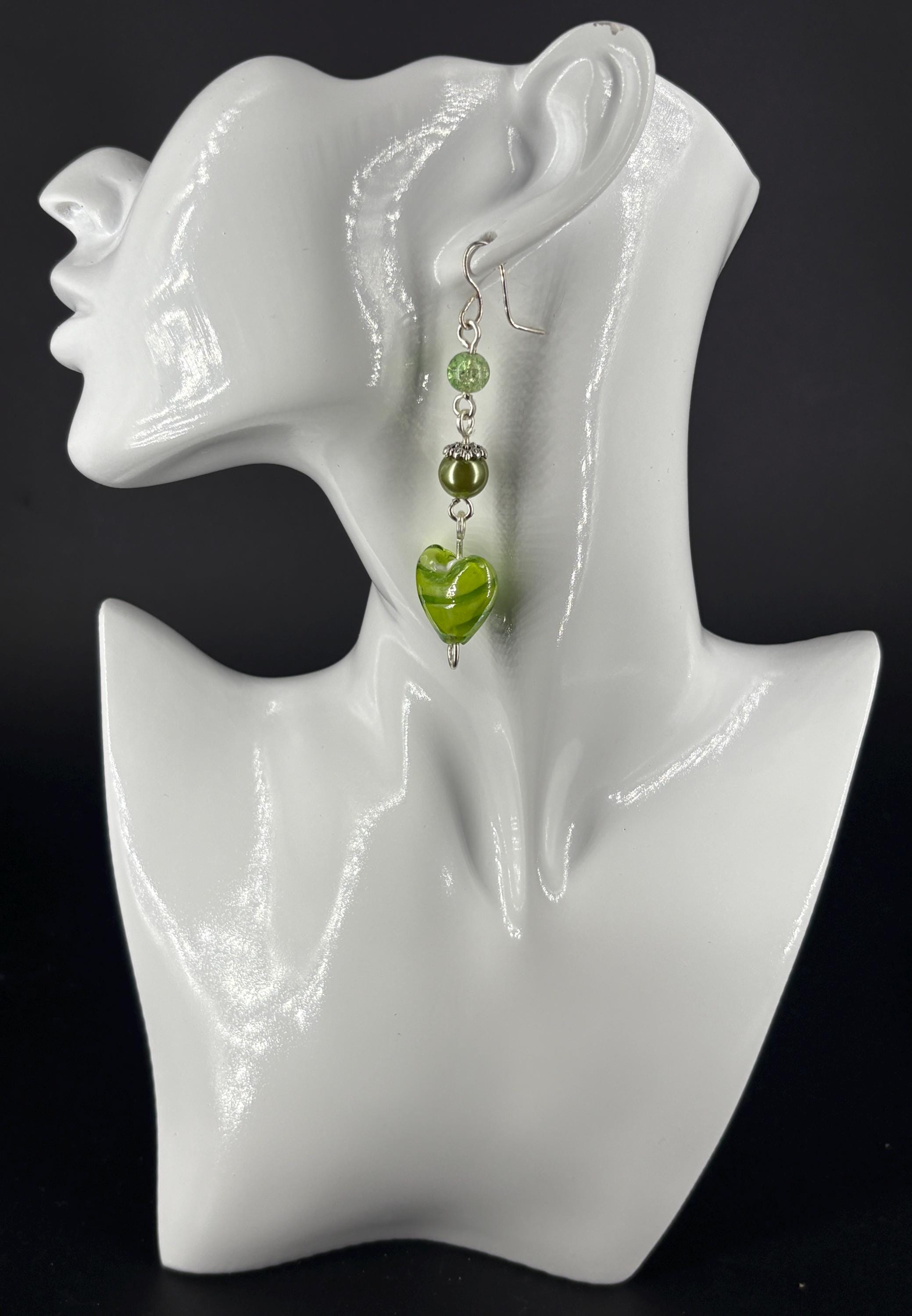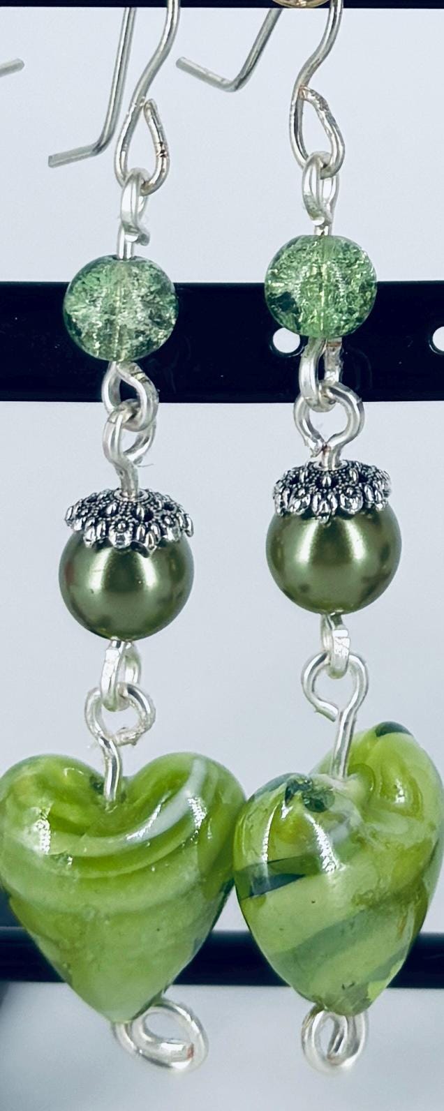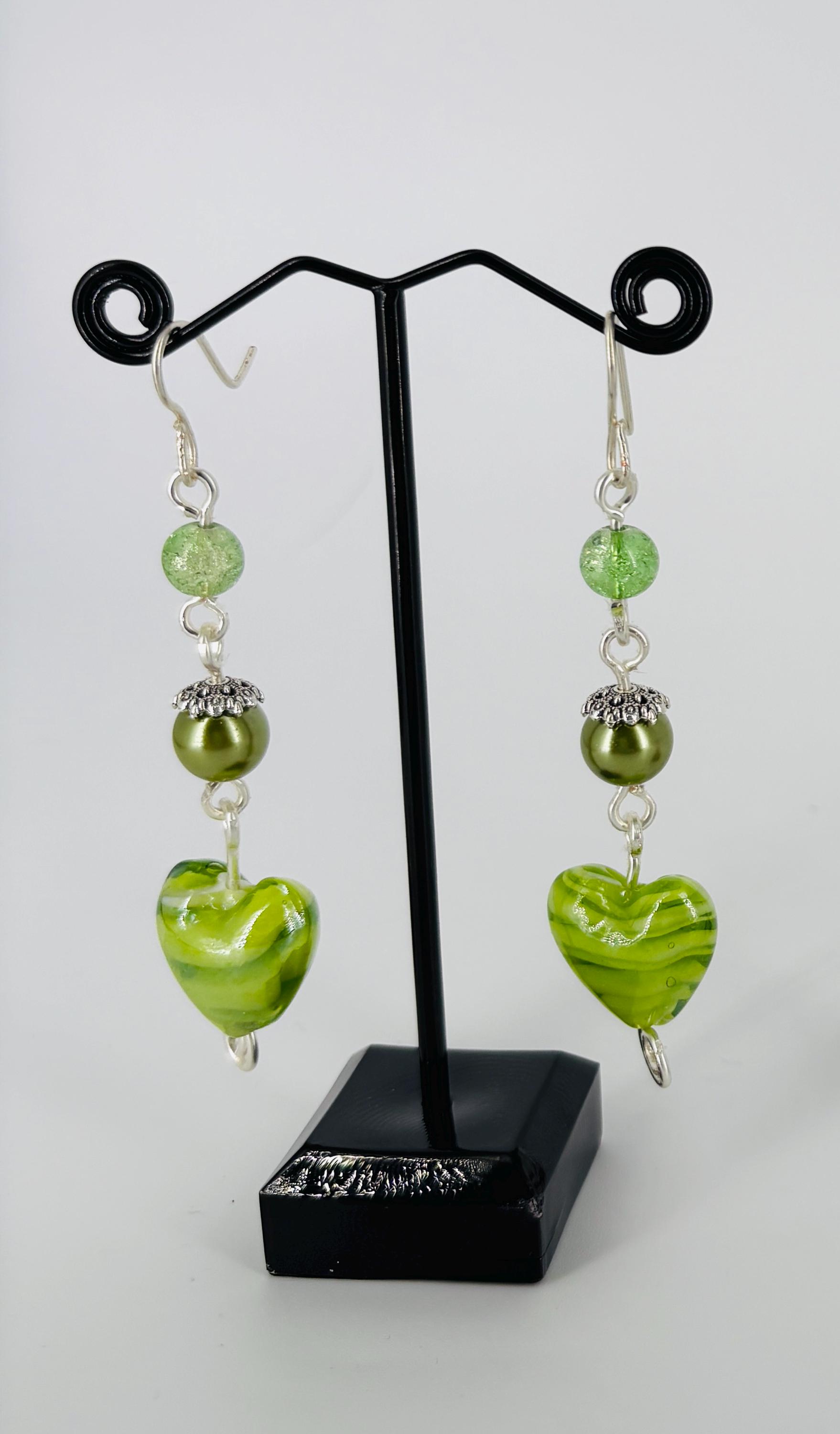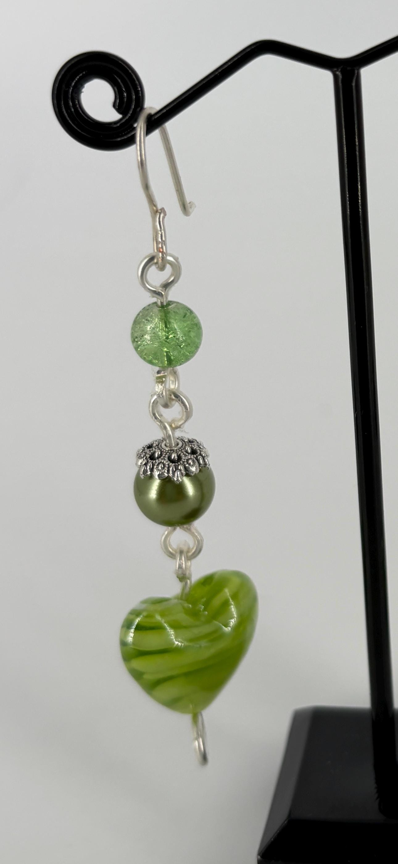 Light green heart shaped bead and spherical bead earrings with silver findings. Drop 8.5cm from ear wire to end.