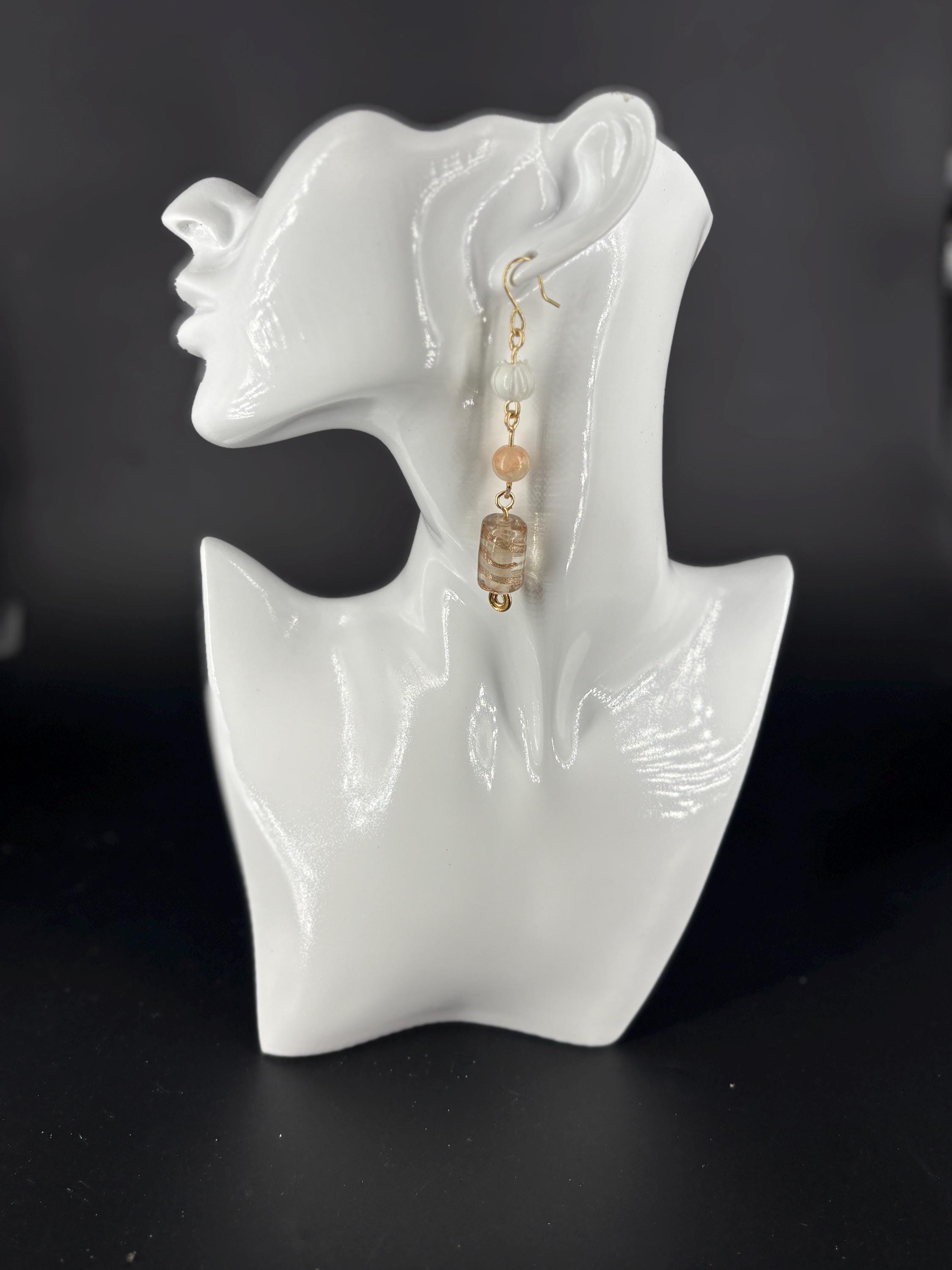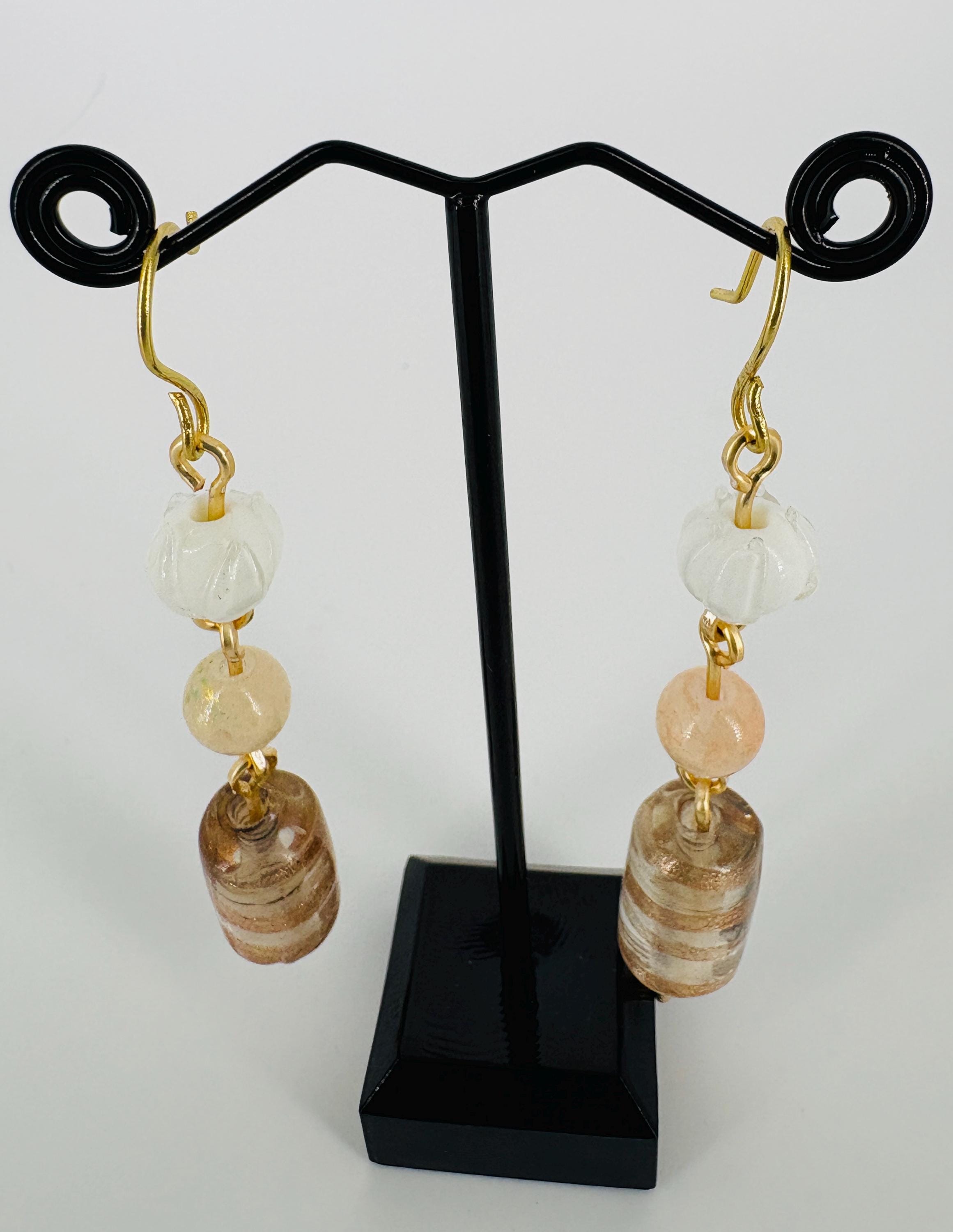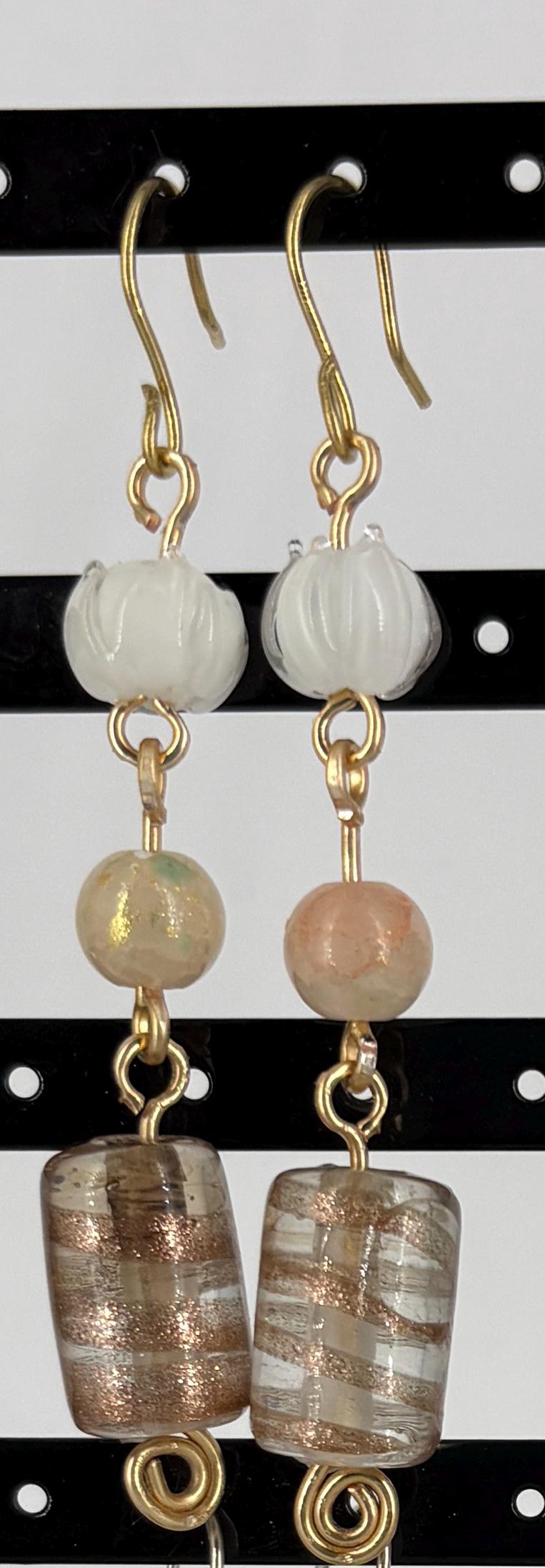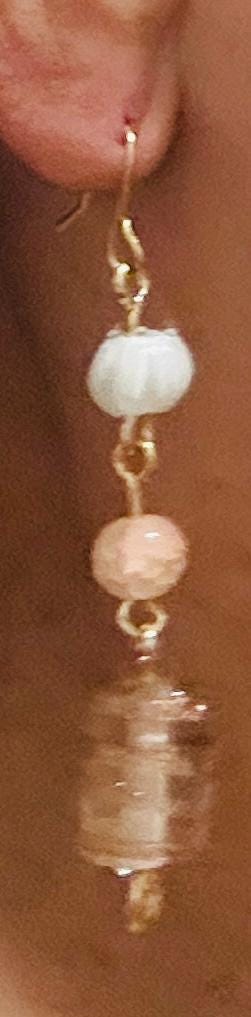 Pale pink, gold and white glass earrings, gold findings, made from Vintage Czech Glass beads. Drop 9cm from ear wire to end.