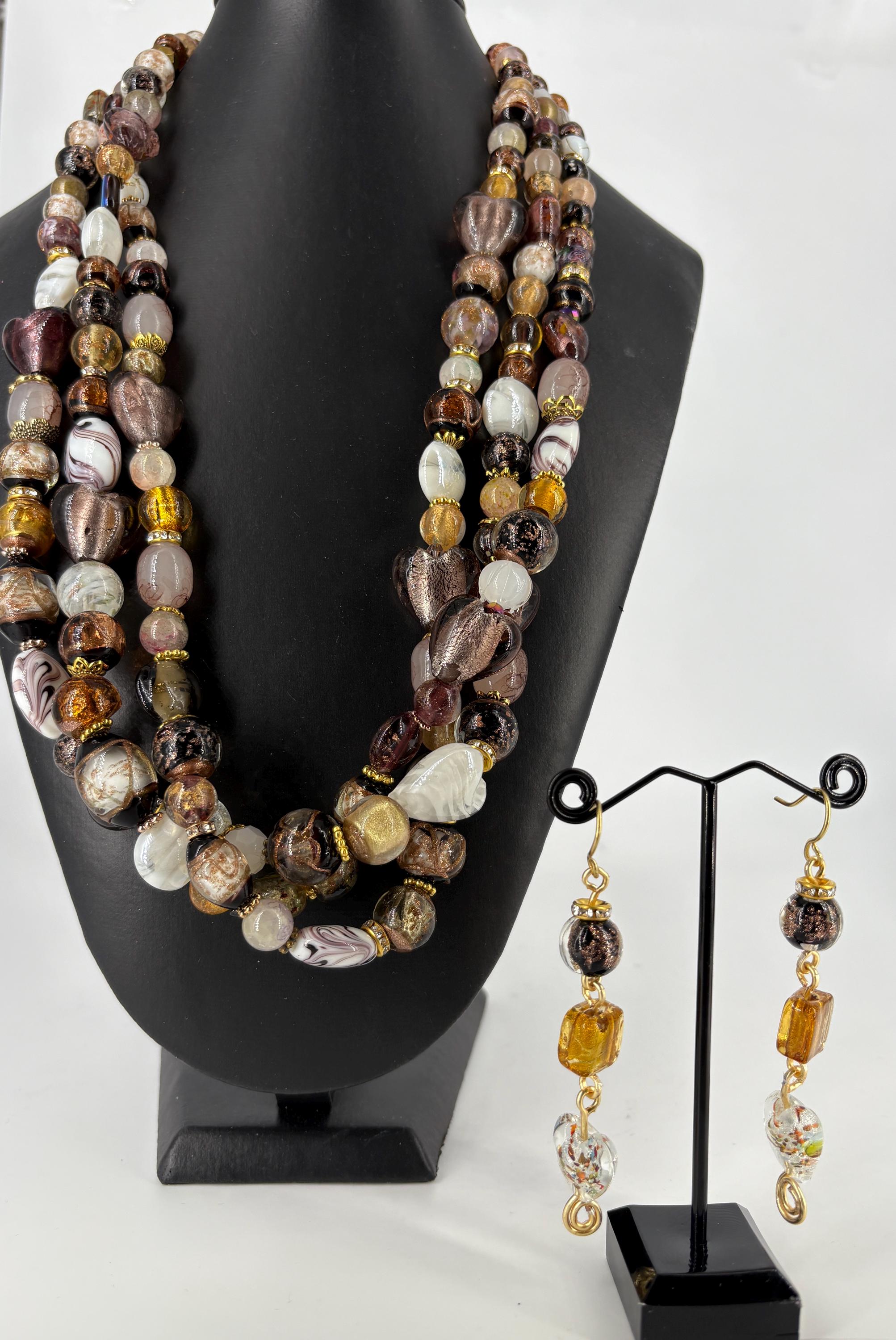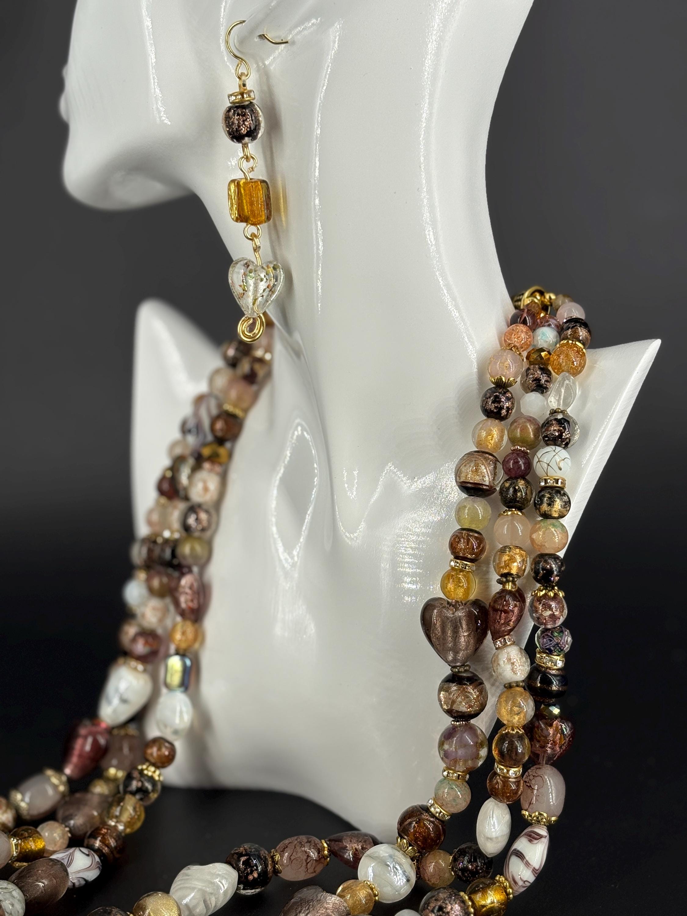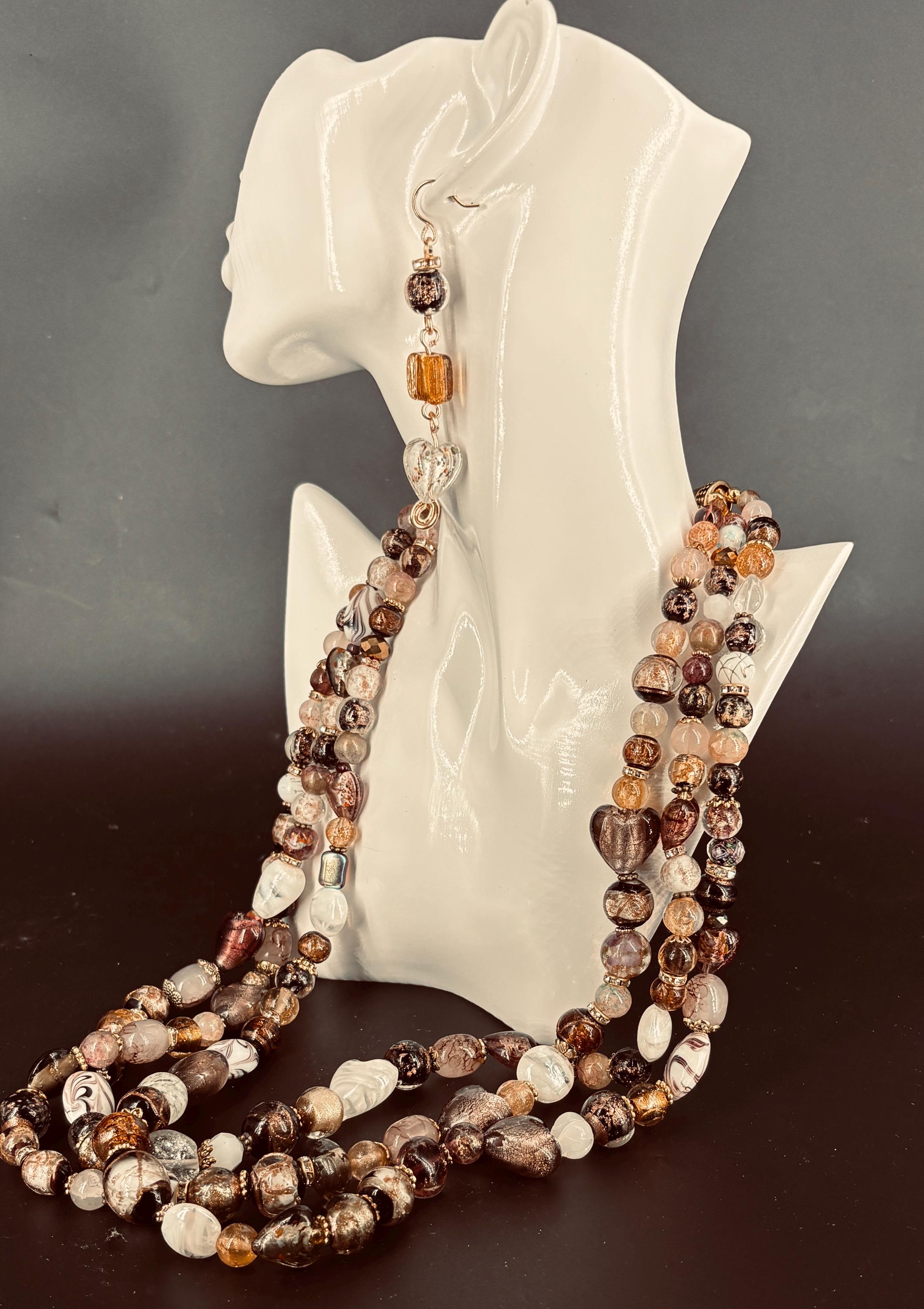 Biggest fashion jewellery trends for 2026 - big and loud. Big beads, bright colours. Classy brown, gold and white three strand statement necklace with matching 3 tier earrings.