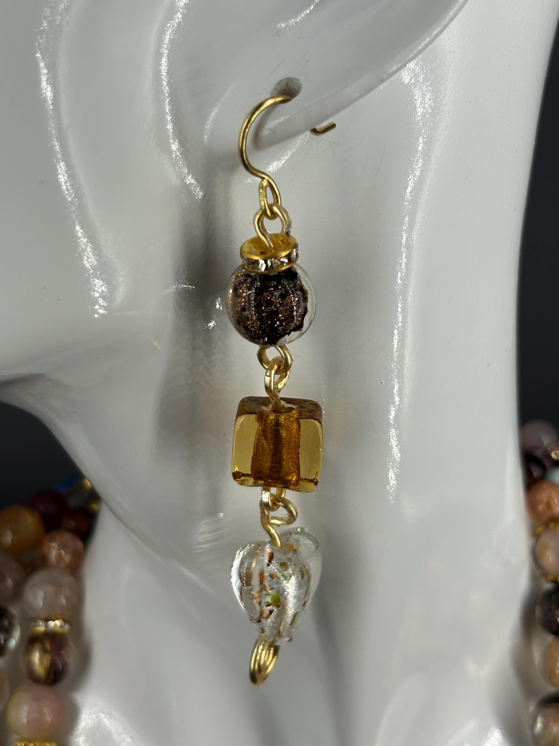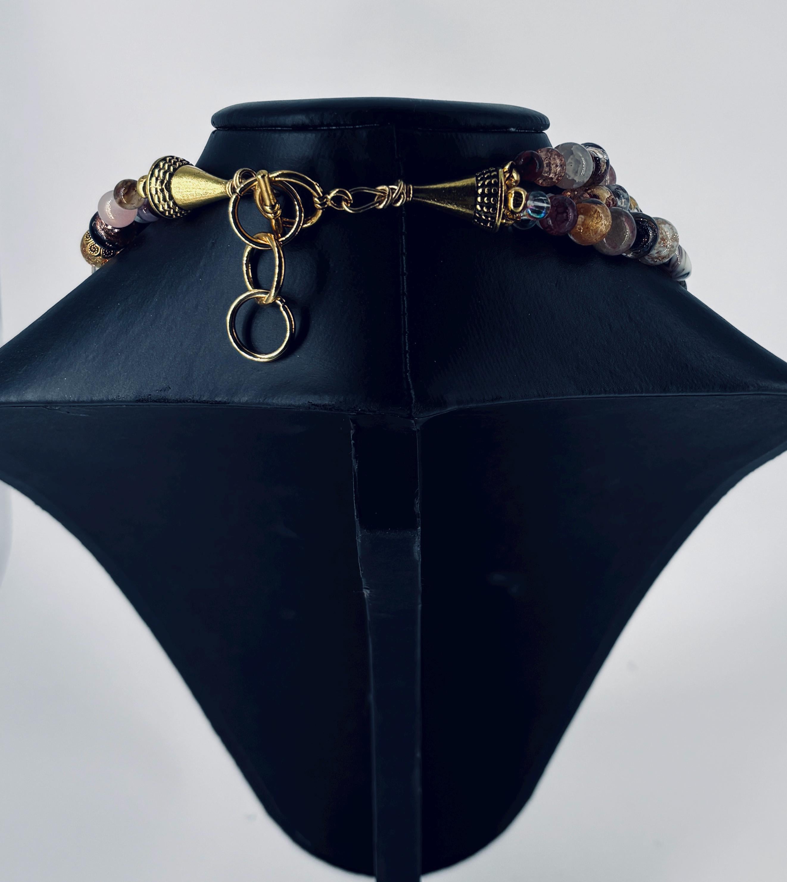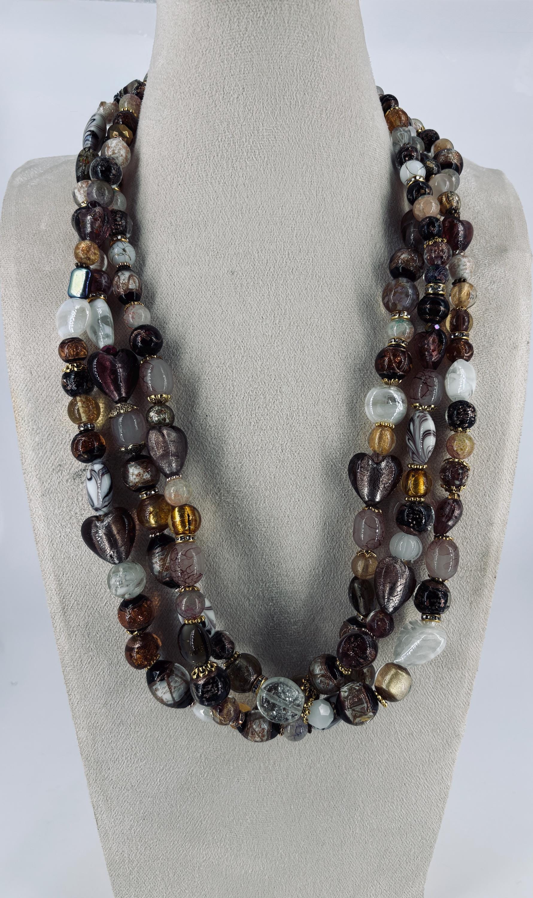 Biggest fashion jewellery trends for 2026 - big and loud. Big beads, bright colours. Classy brown, gold and white three strand statement necklace with matching 3 tier earrings.