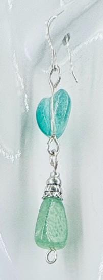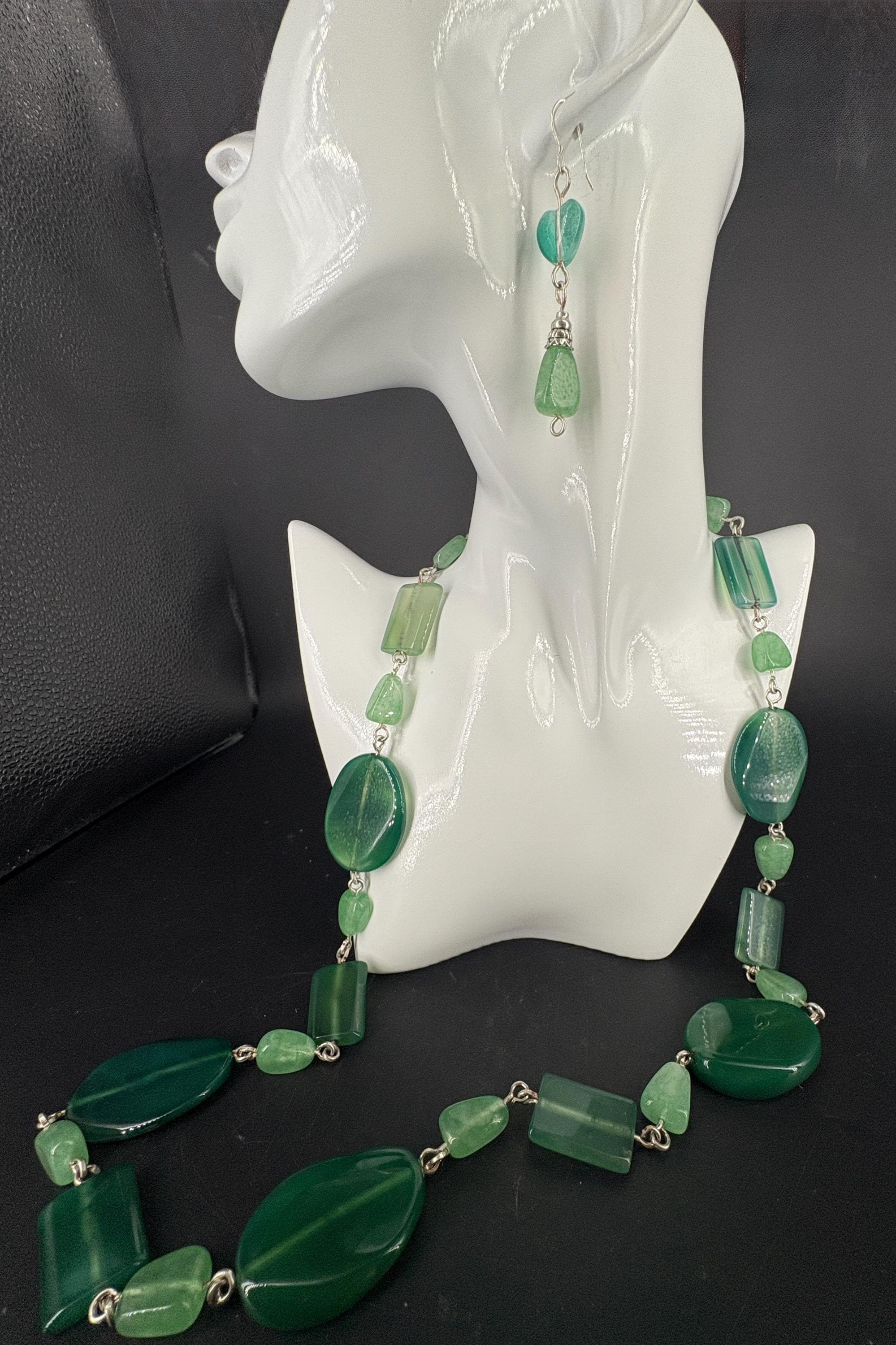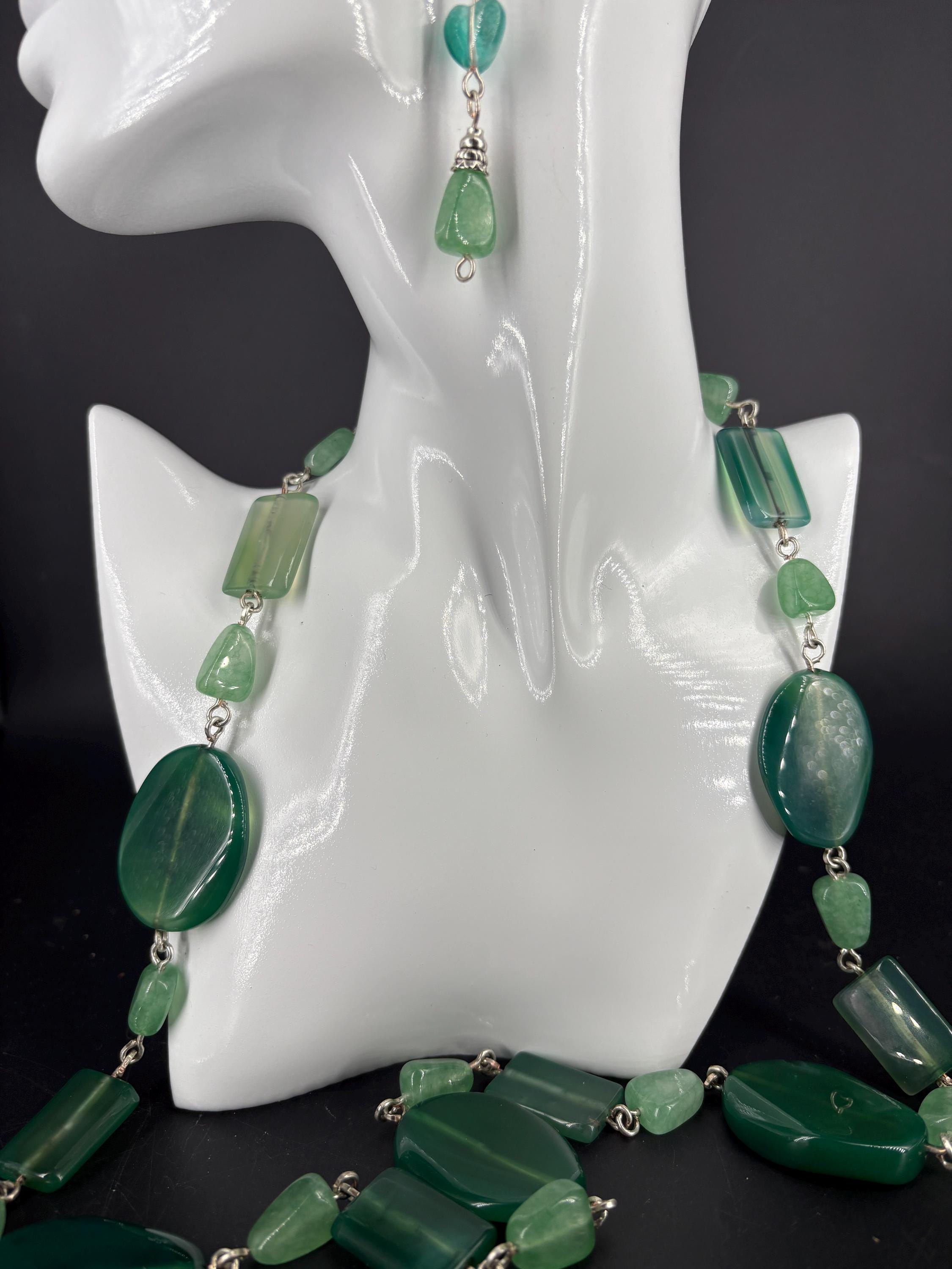 Chunky but elegant statement necklace of large green agate flat oval beads, medium sized rectangle agate beads and smaller green stone beads linked with silver plated chain. Earrings can be worn together with necklace or on their own. Or given as a gift. One length 95cm in total.