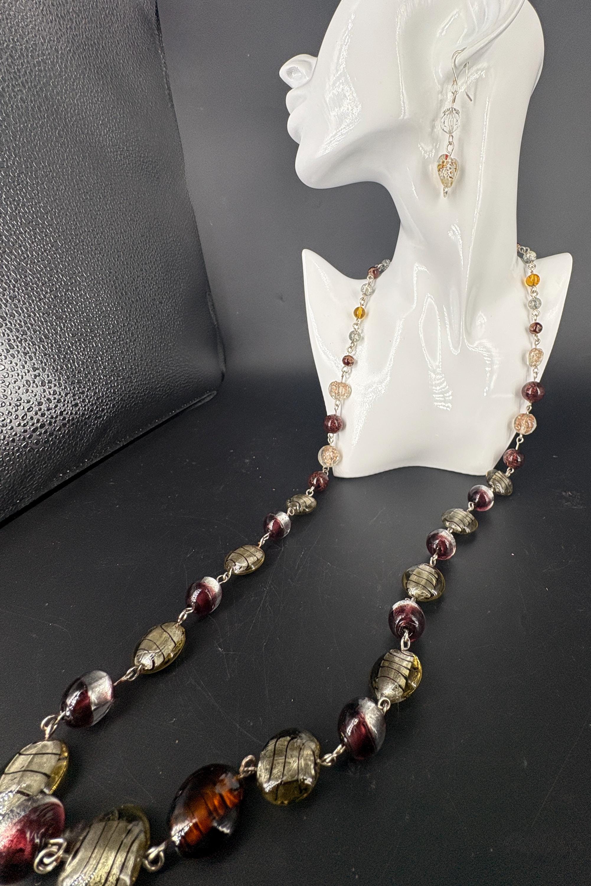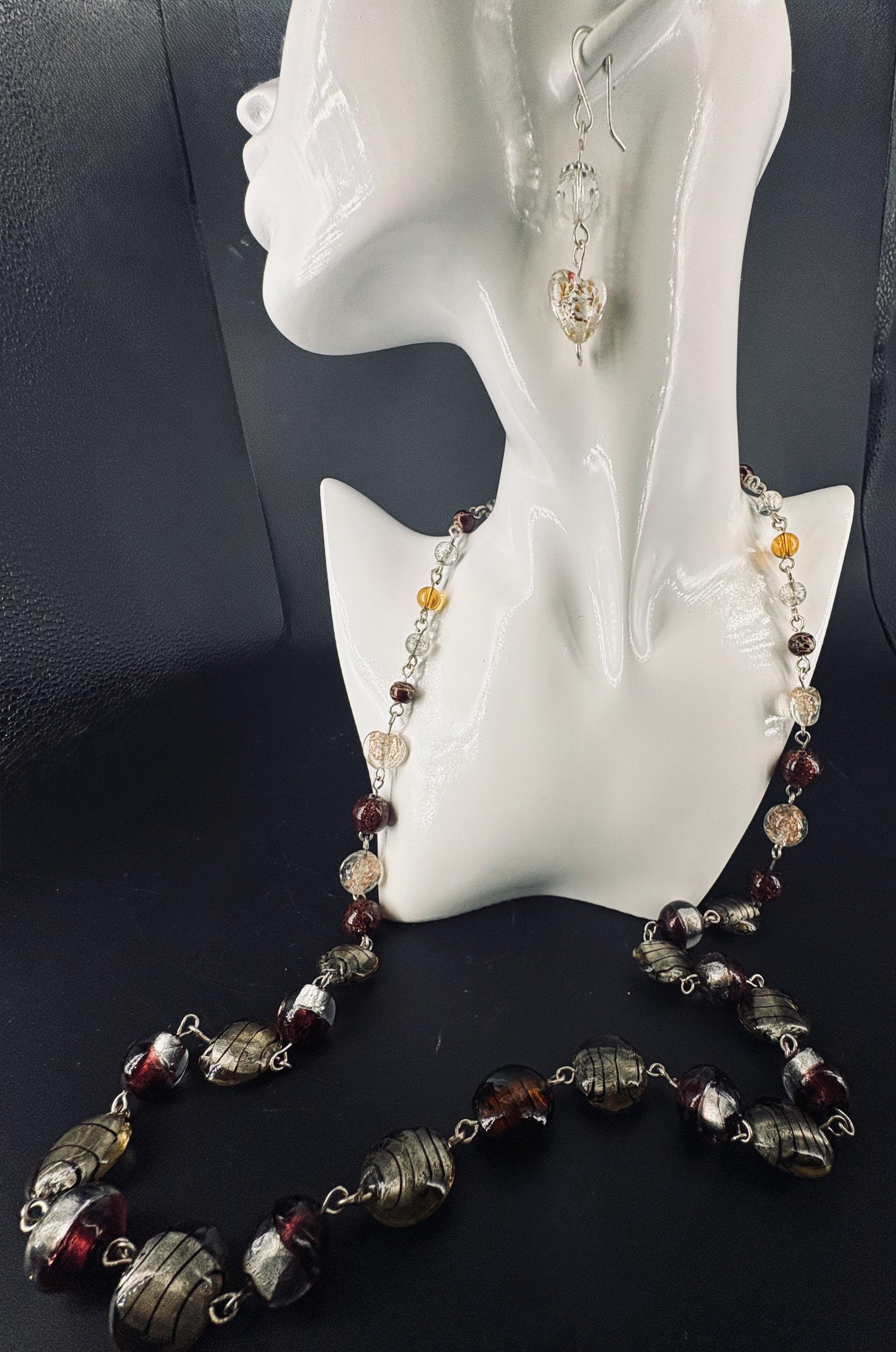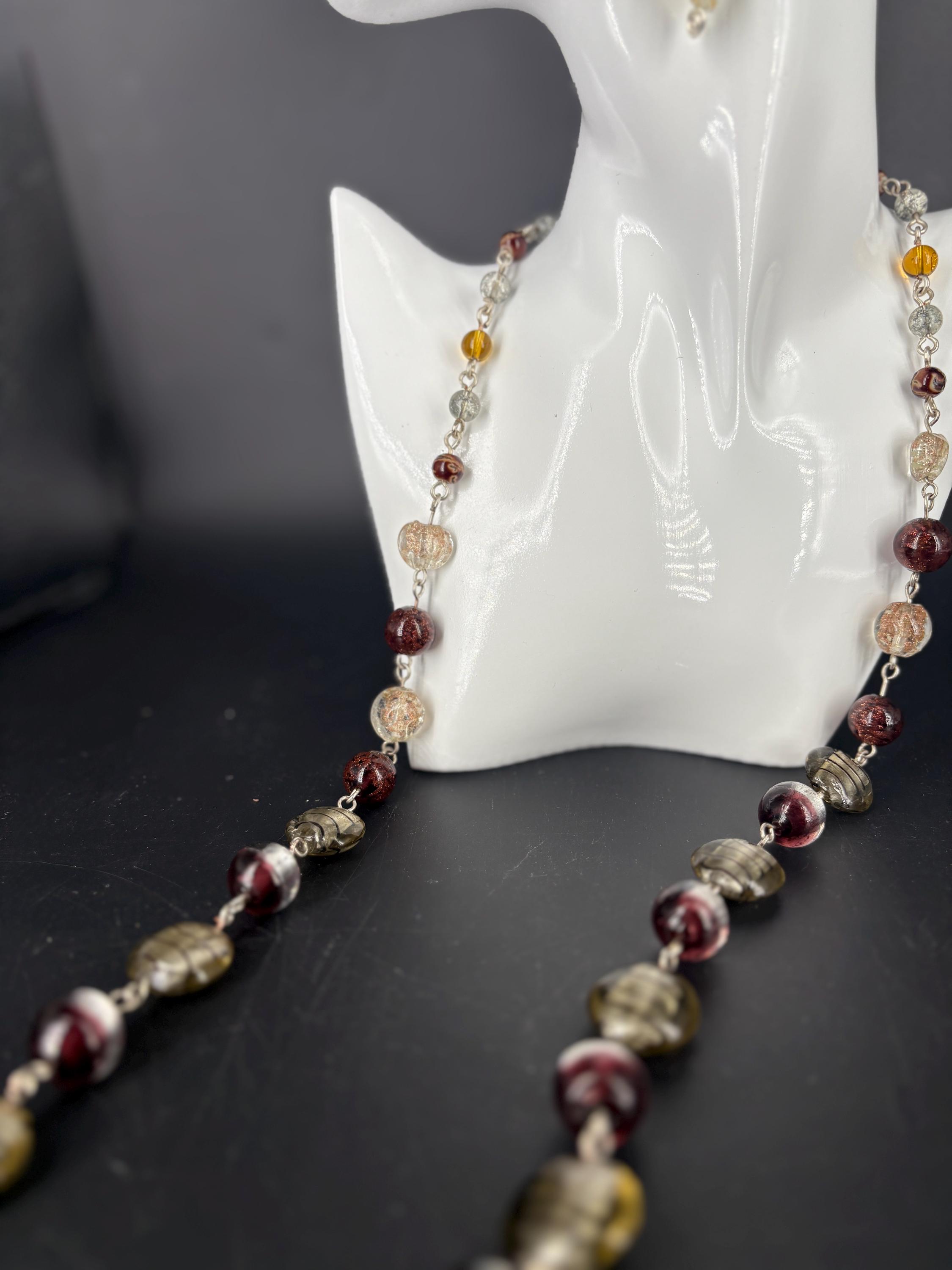 Biggest fashion jewellery trends in 2026 are for big, bright, colourful statement pieces. Czech glass, lampwork & foil lined beads, linked with silver plated copper wire. Chocolate brown, silver and light gold coloured beads.