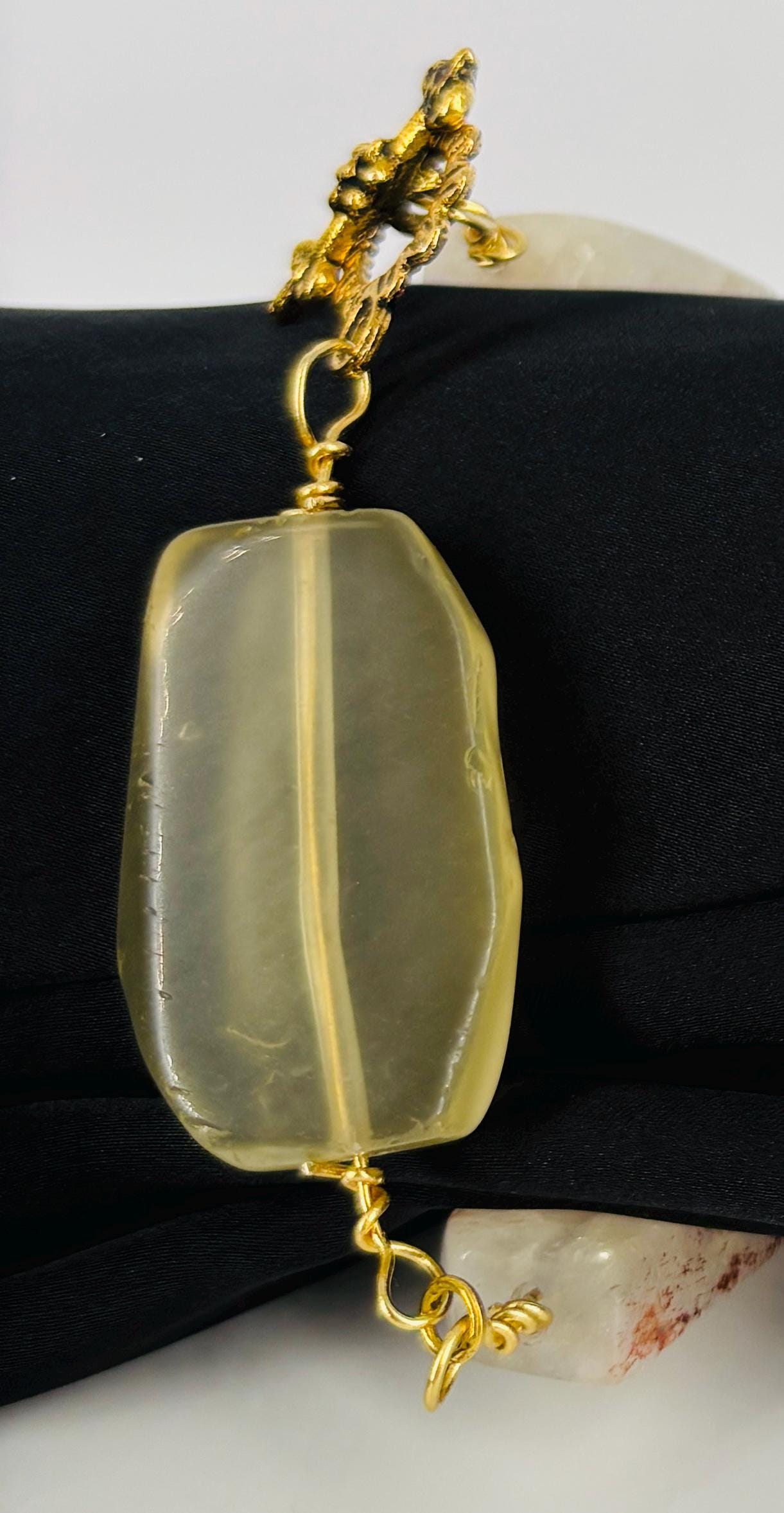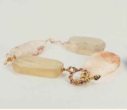 Statement bracelet inspired by European catwalk trends for 2026. Bold and chunky in colours of light lemon/citrine with gold colour links. Gold plated wire and toggle clasp. Bracelet size large 27cm(10.5in).