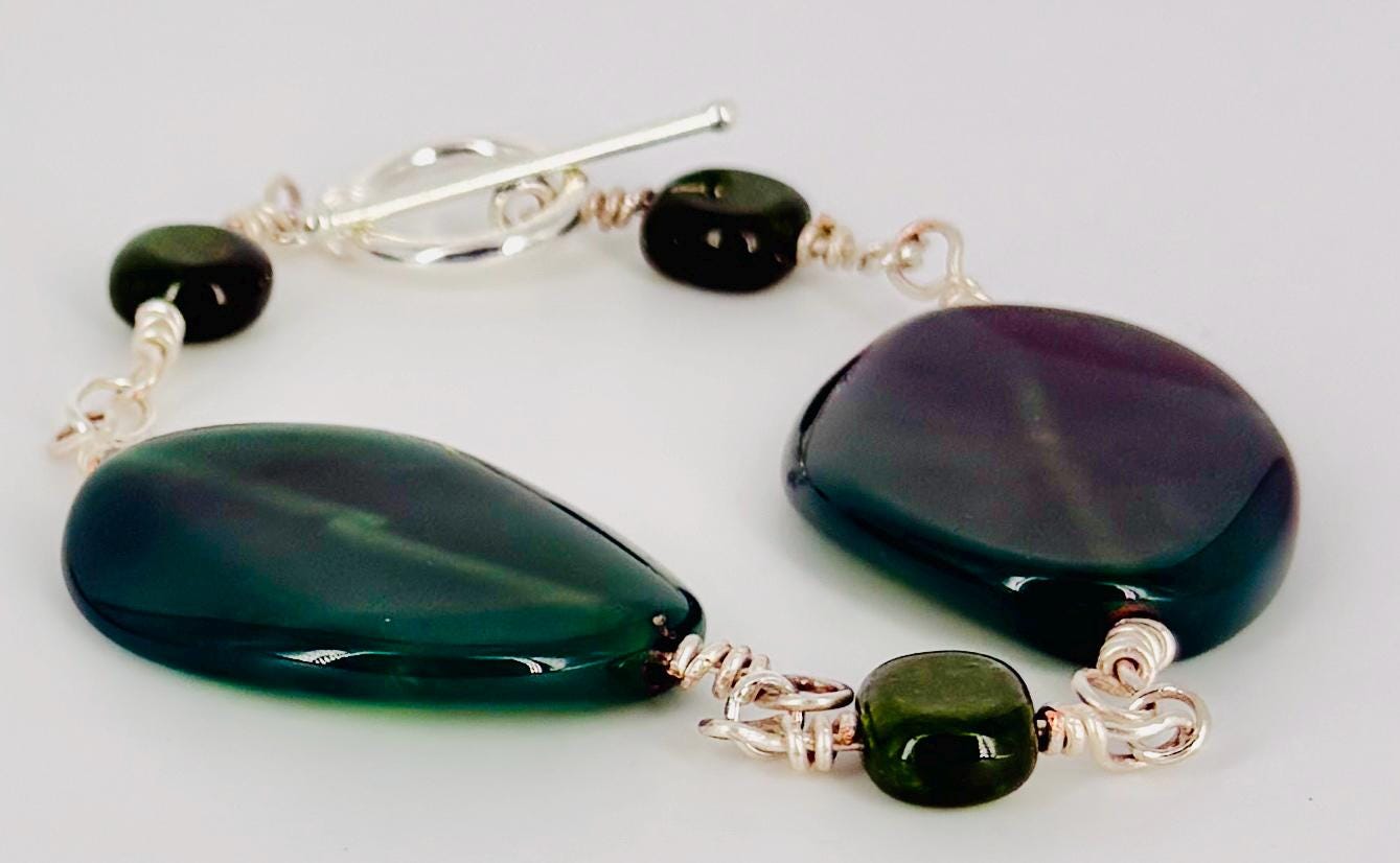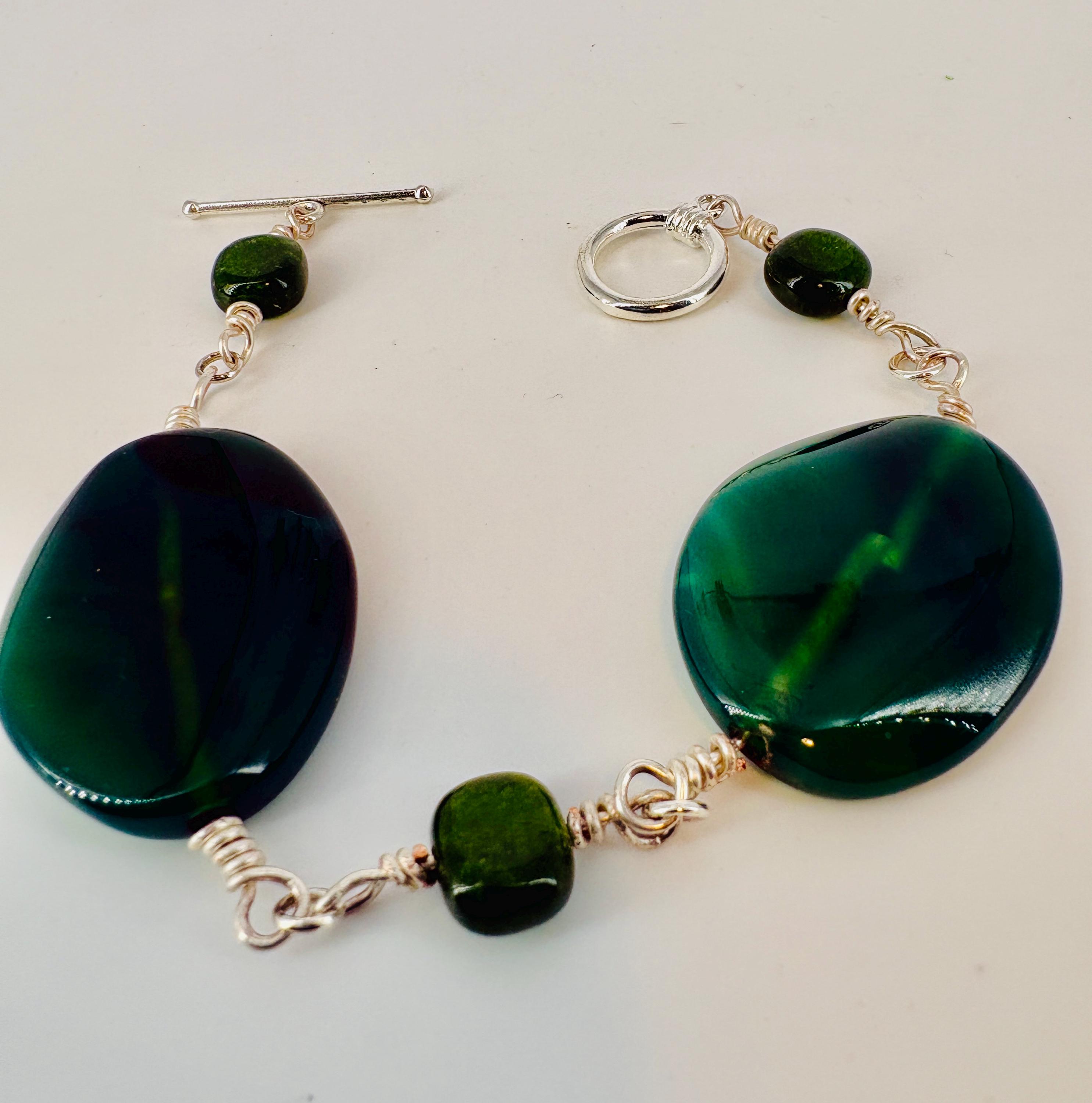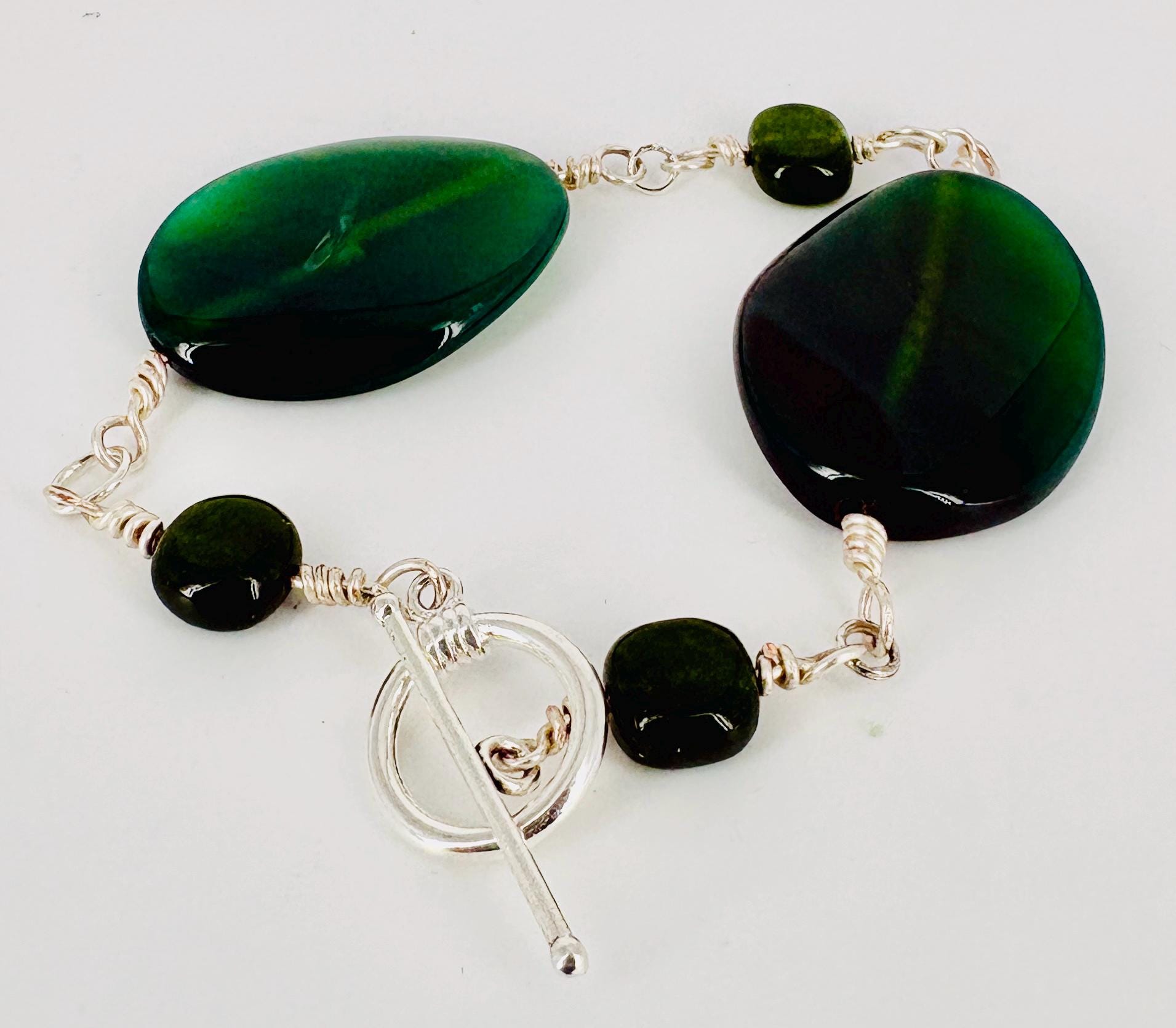 Chunky, dark green statement bracelet of very large - and small - smooth, flat oval beads. 22cm (8.75in) in length. Silver plated wire and large toggle fastener. European catwalk-inspired design by biggest fashion jewellery trends for 2026.