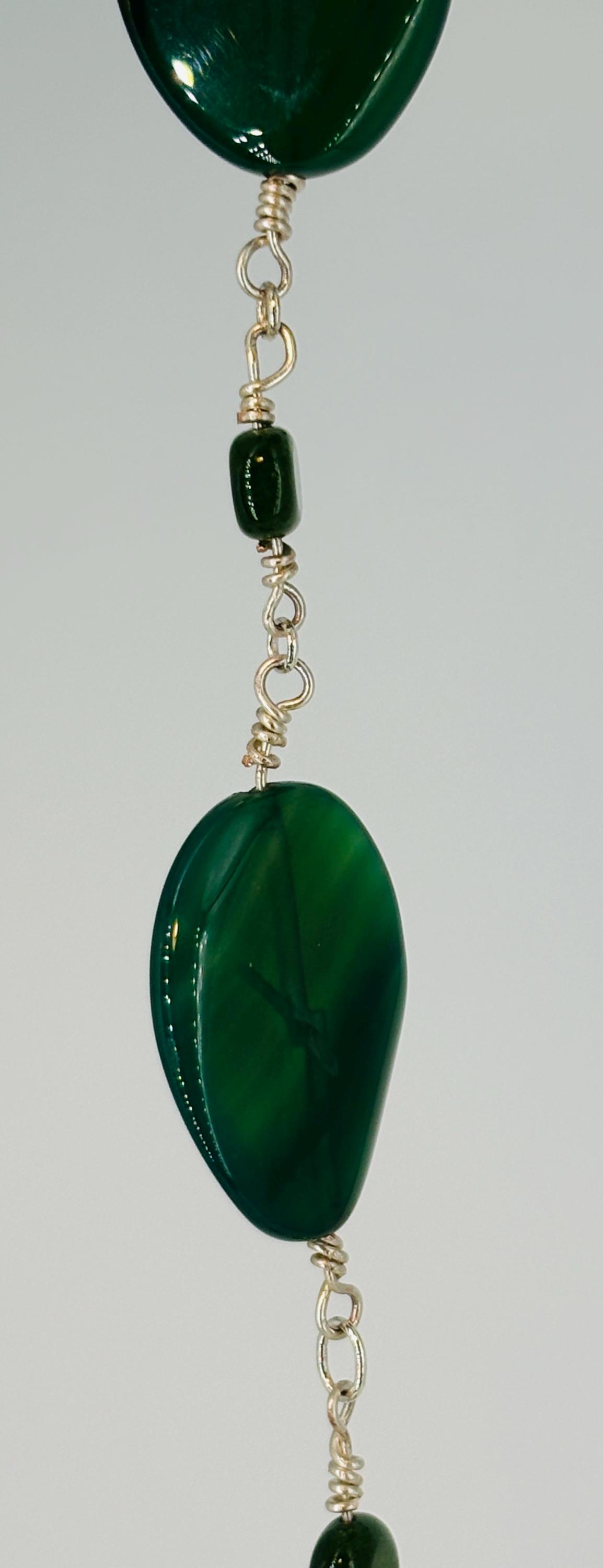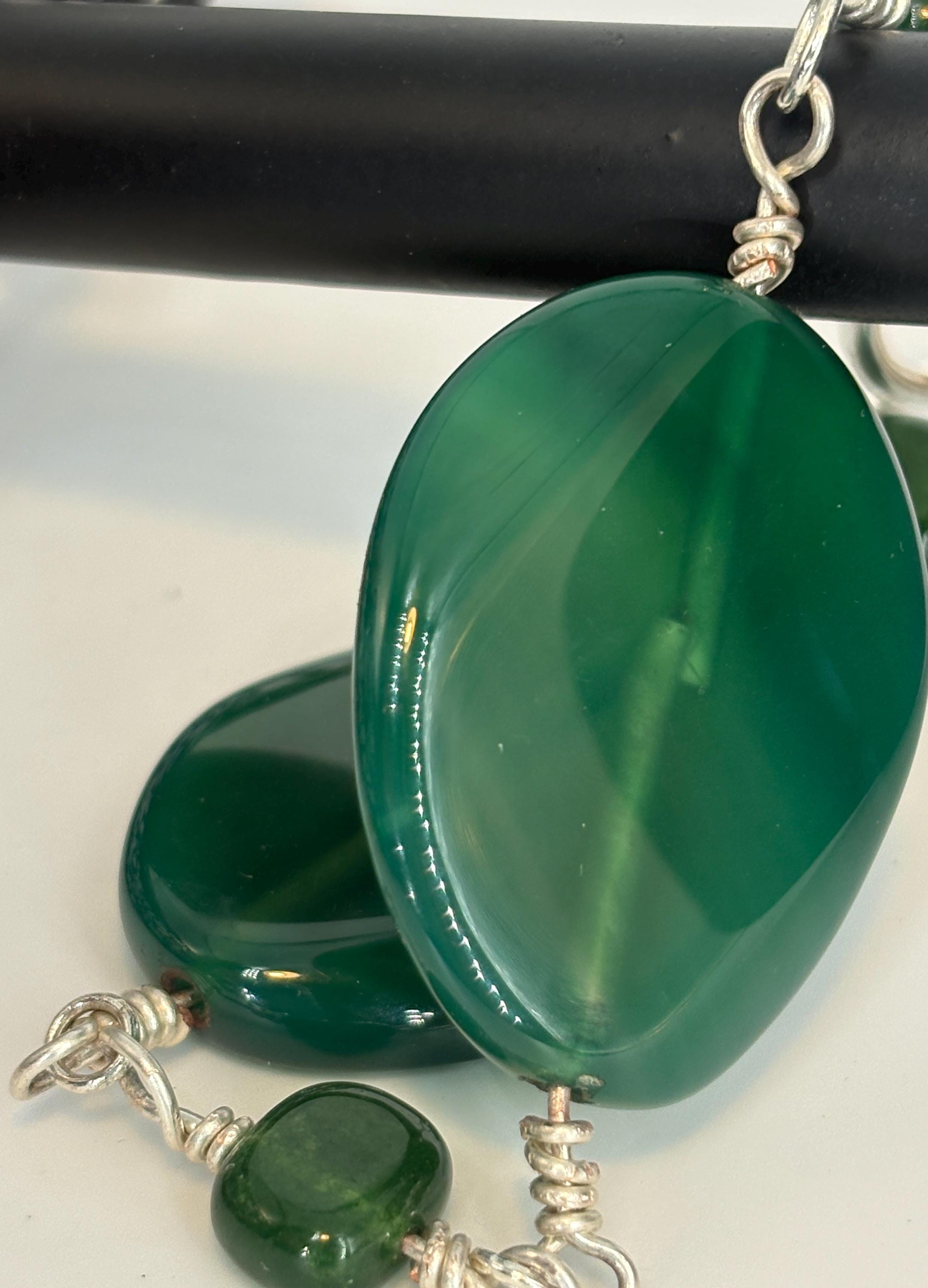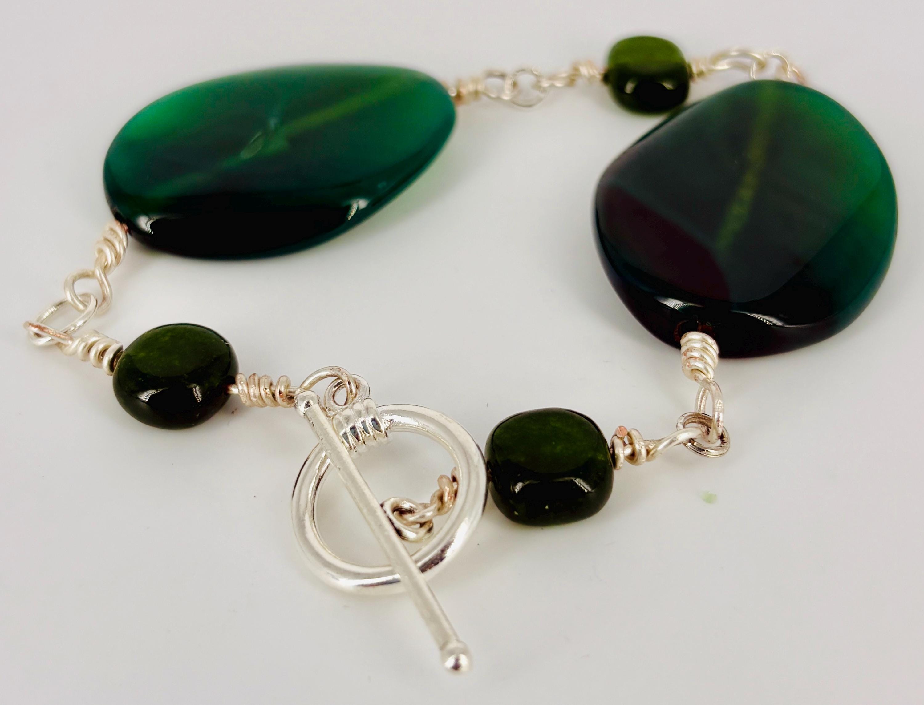 Chunky, dark green statement bracelet of very large - and small - smooth, flat oval beads. 22cm (8.75in) in length. Silver plated wire and large toggle fastener. European catwalk-inspired design by biggest fashion jewellery trends for 2026.