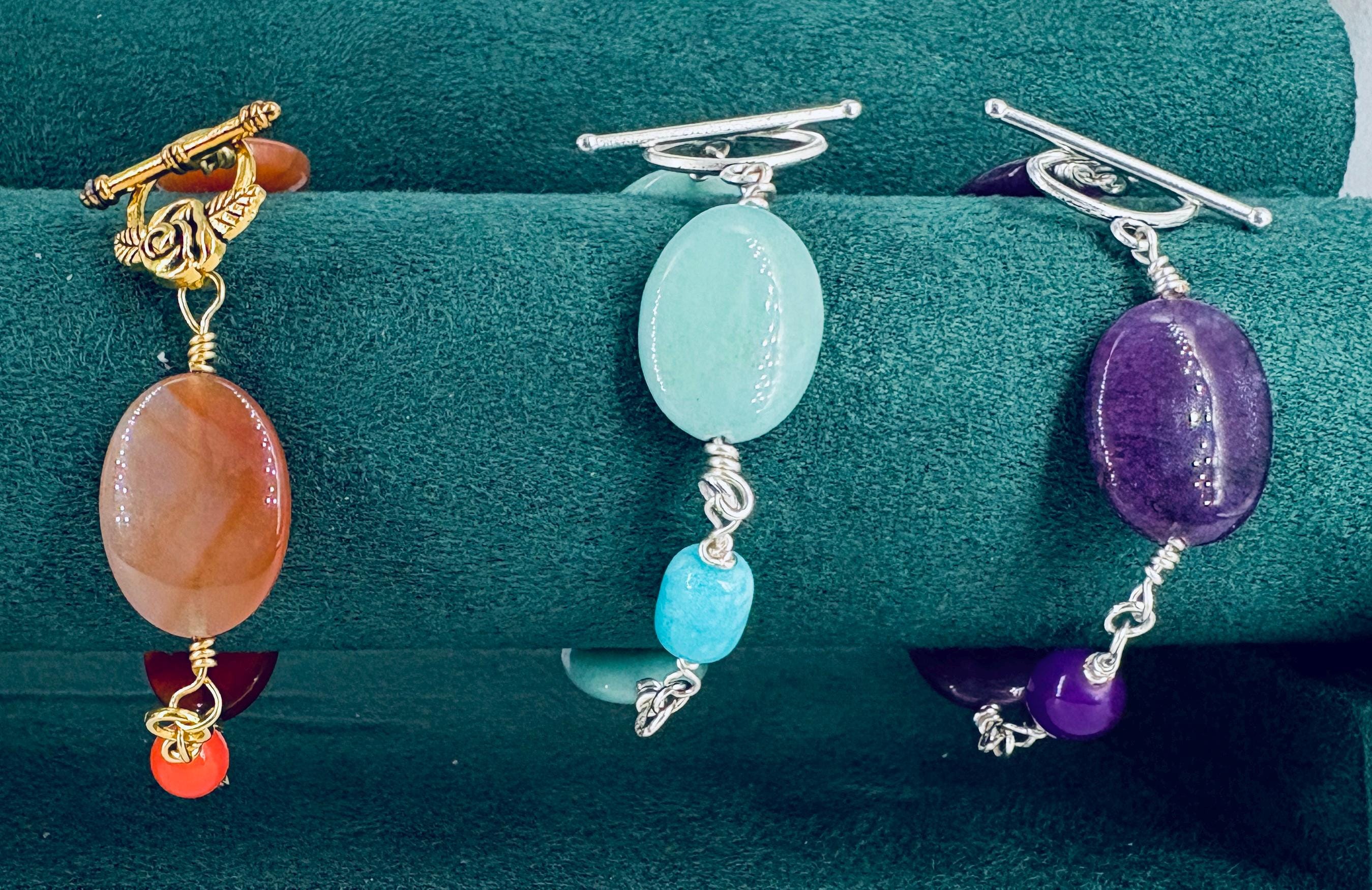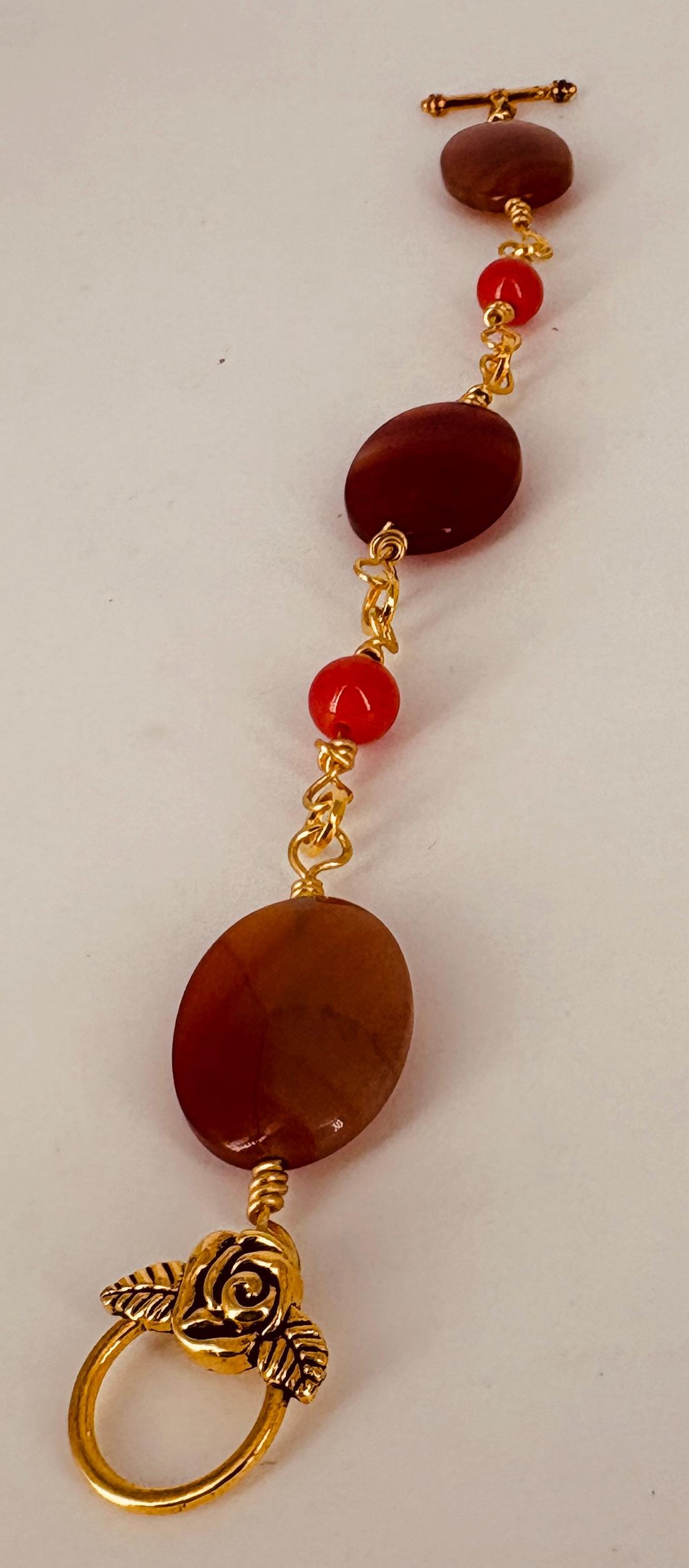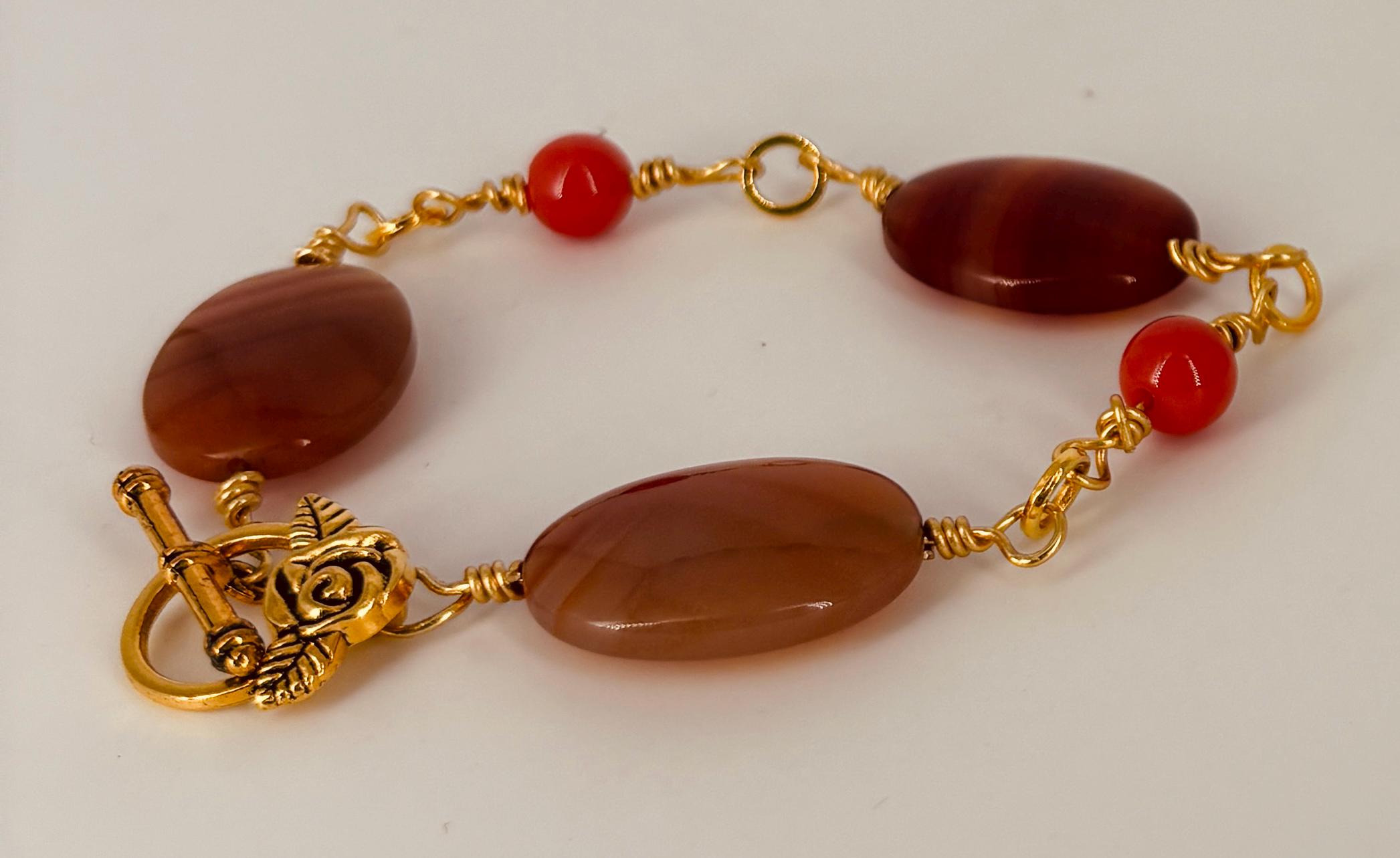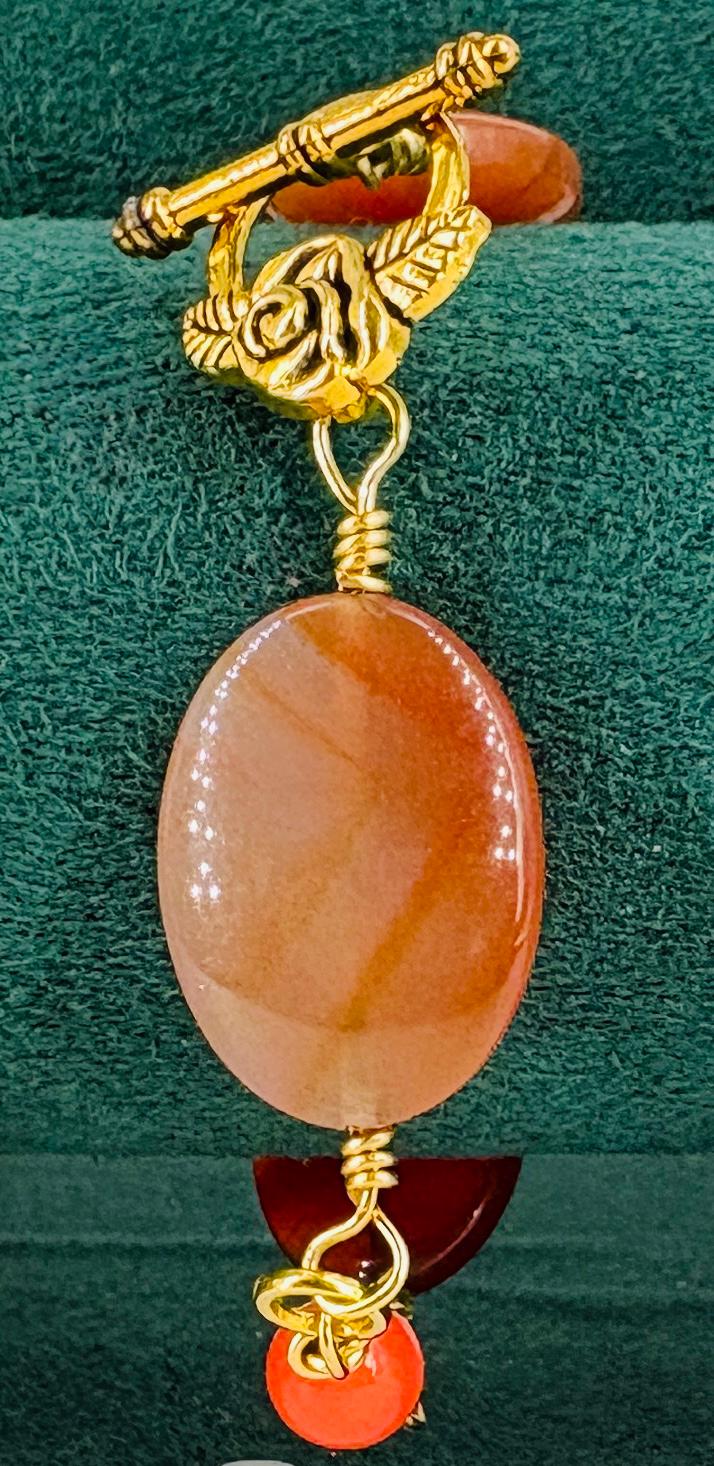 Agate bracelet large oval beads 25mm and 8mm glass beads. ‘Red’ Agate is an amber/copper colour, with striations of lighter caramel and cream. 21cm length. Available in 2 other colours/stones. See individual listings for details.