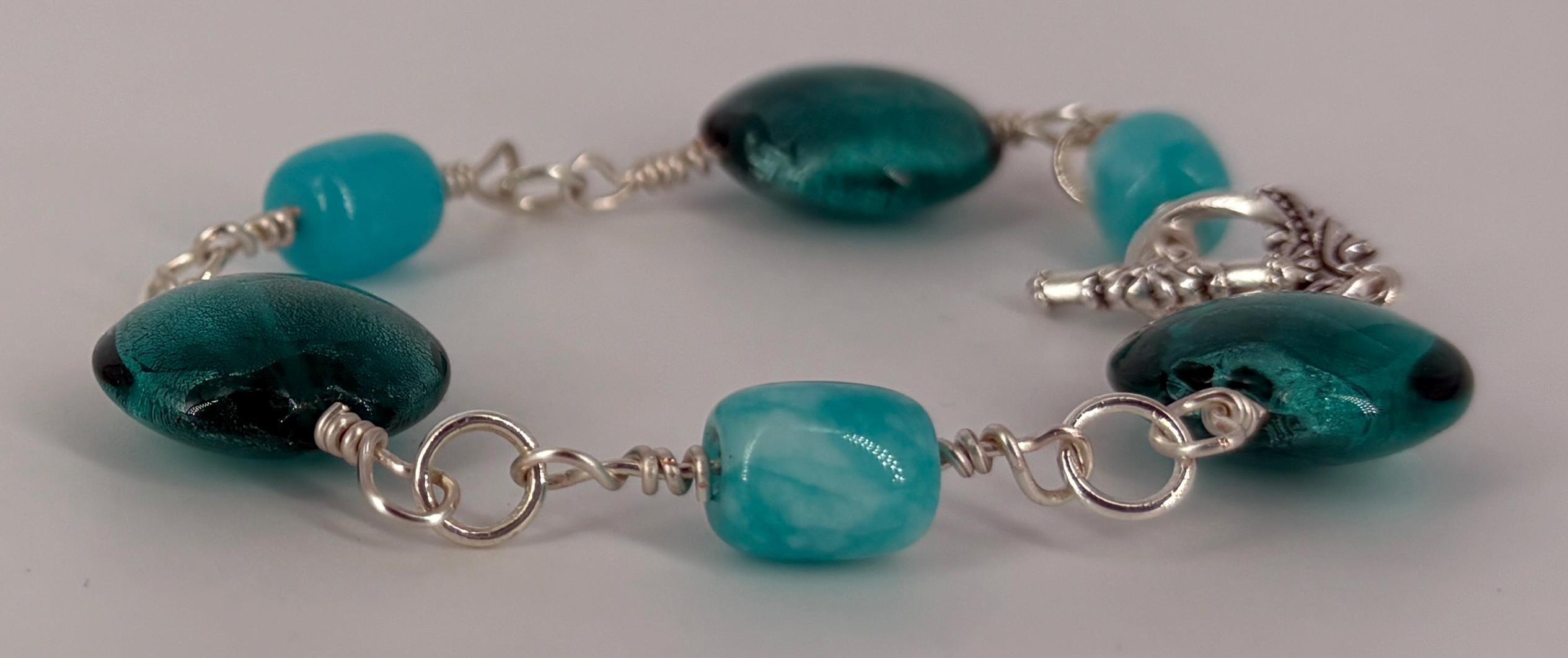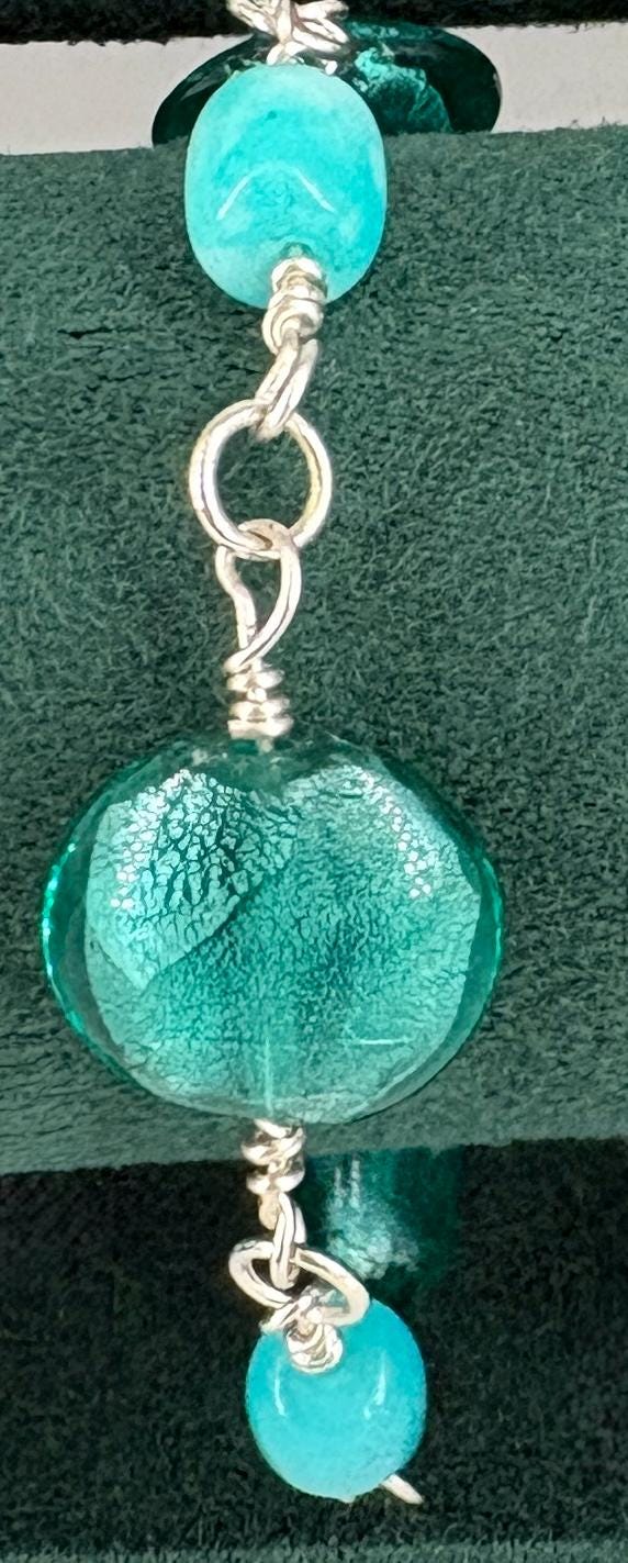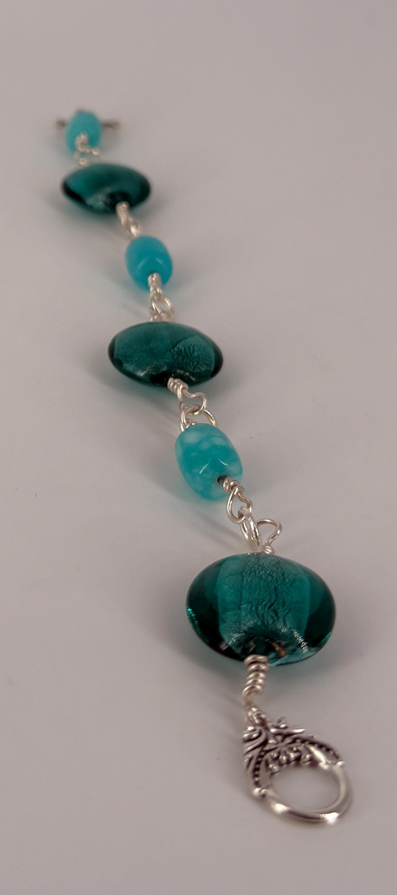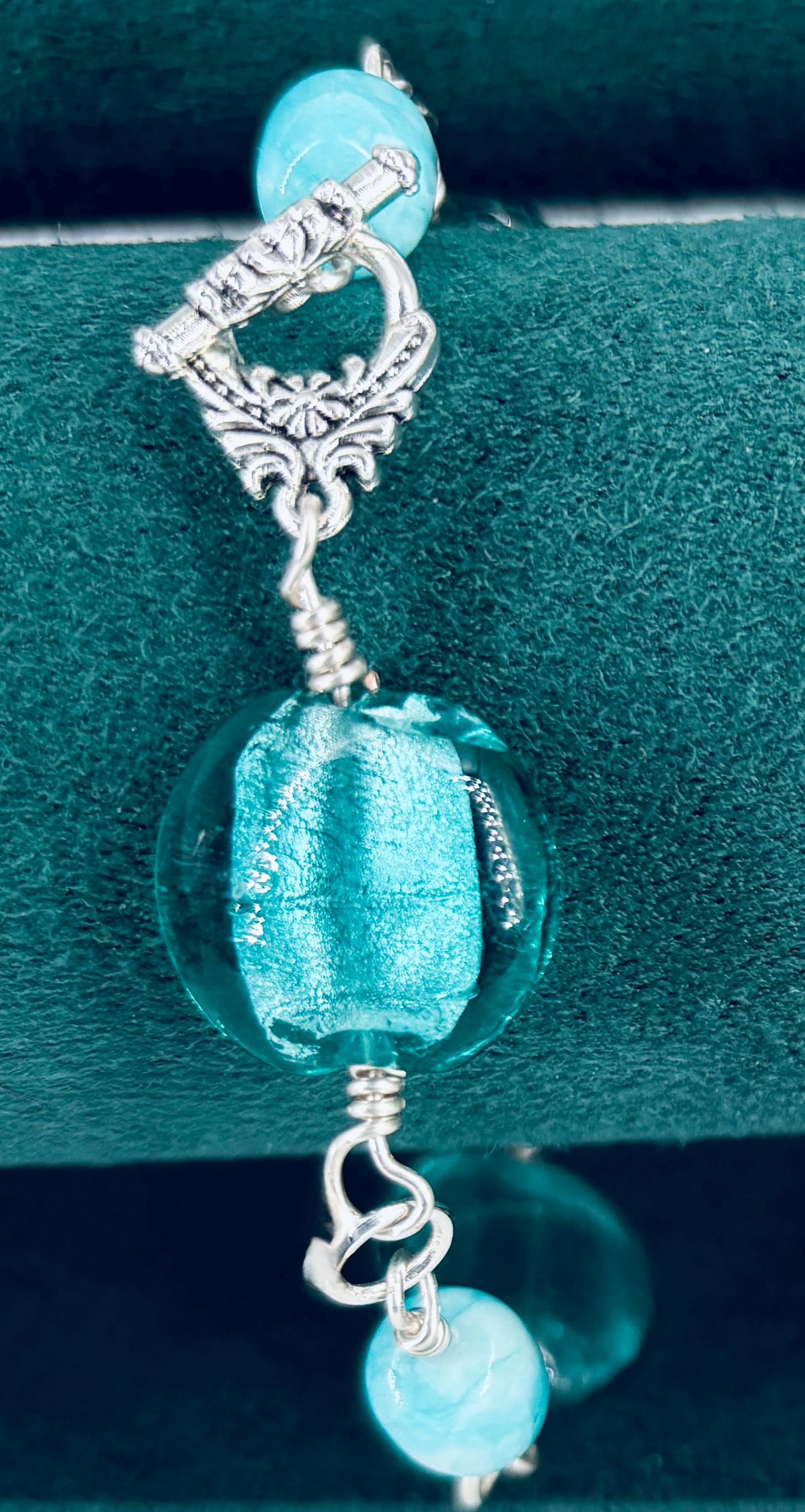 Statement bracelet Czech foil glass beads and shell beads in colours of aquamarine and turquoise. Length 22.5cm. Silver plated toggle clasp and wire.