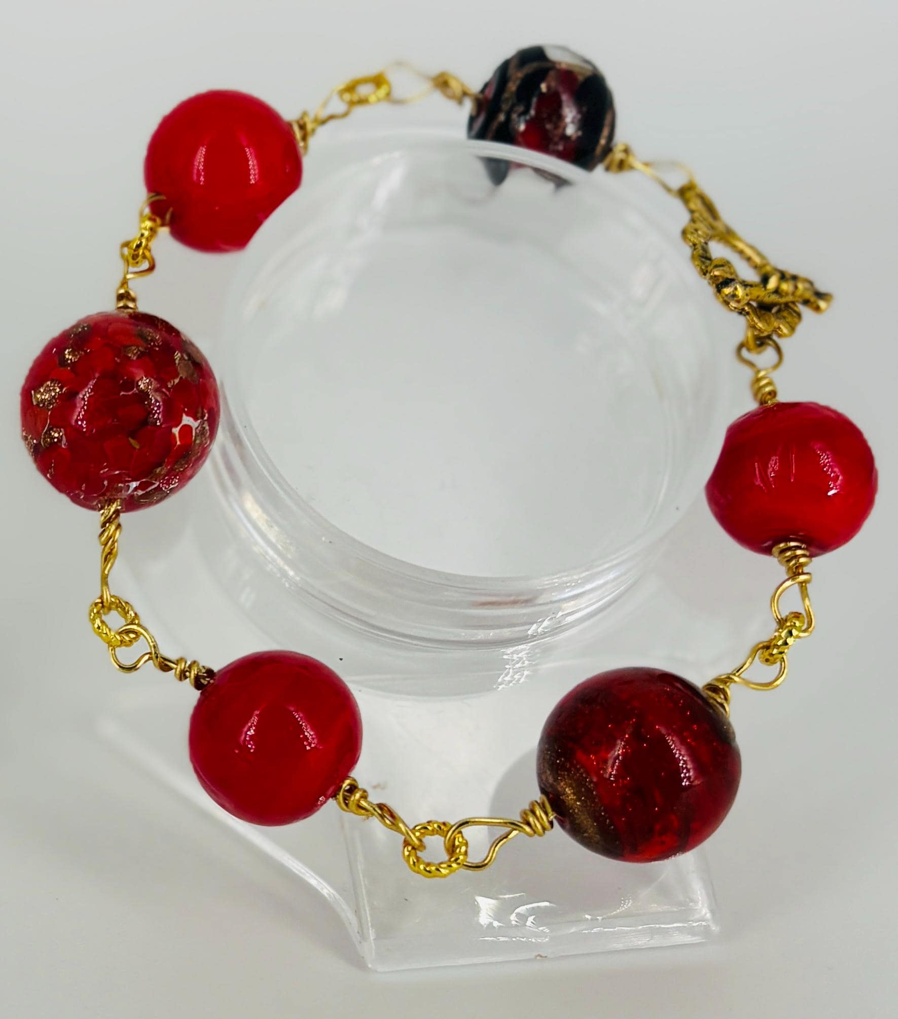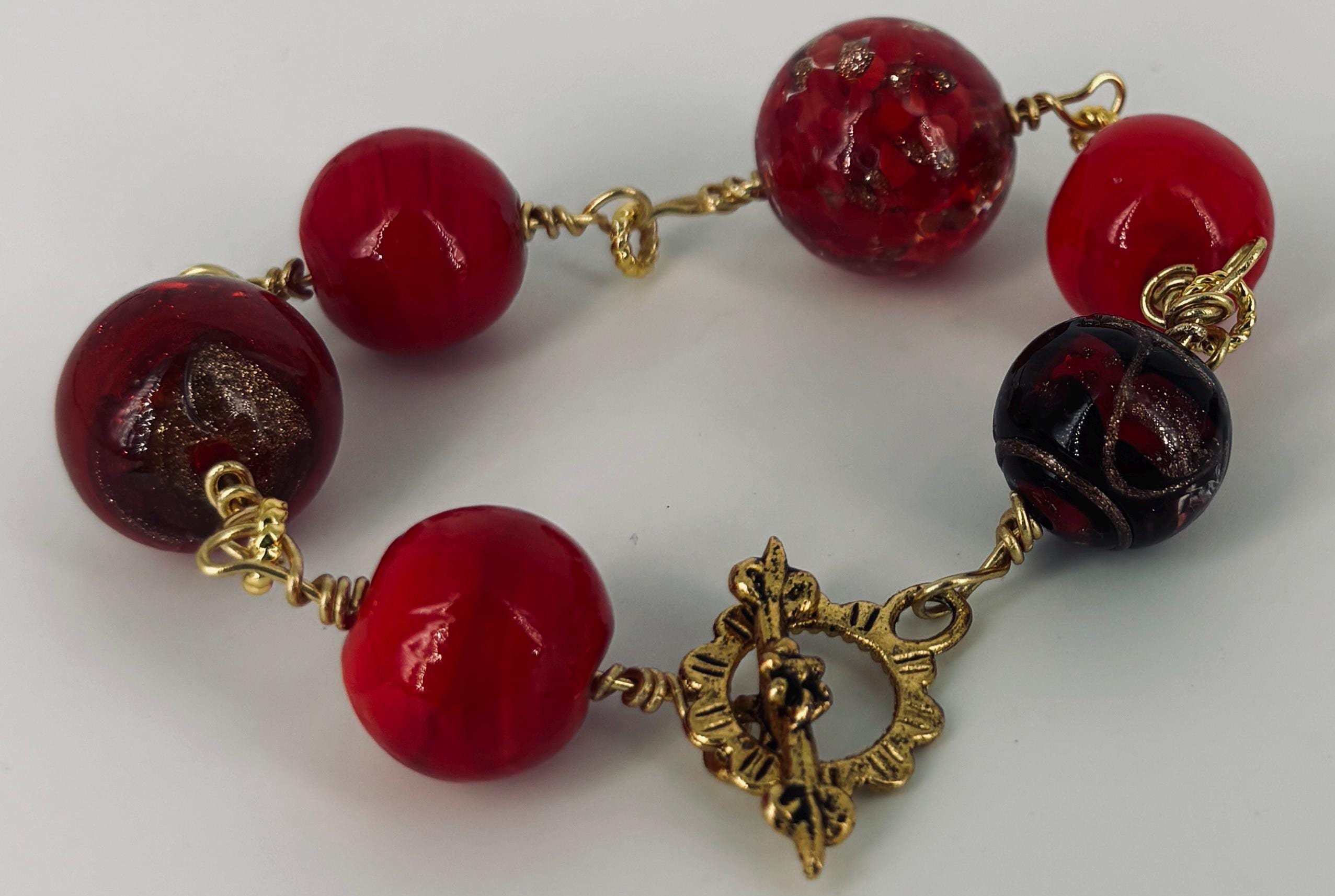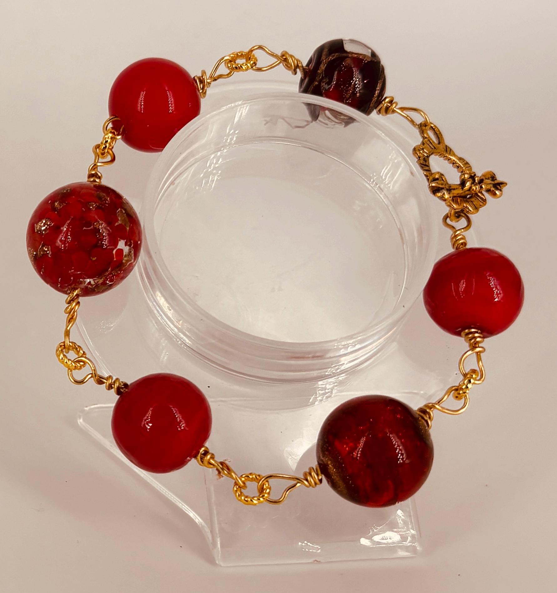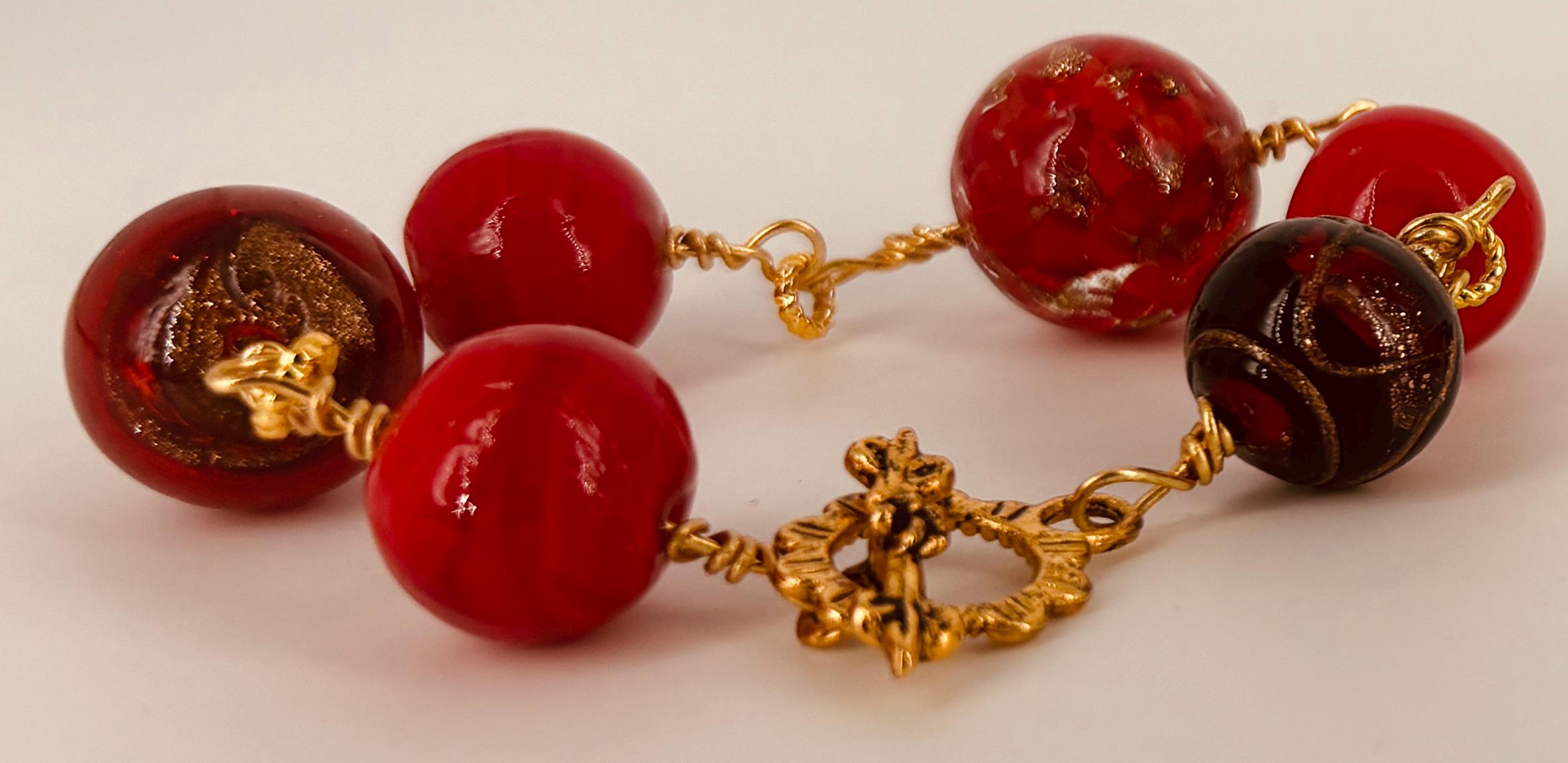 Large red glass beads bracelet 23cm (9in) long. Gold wire and toggle fastener.