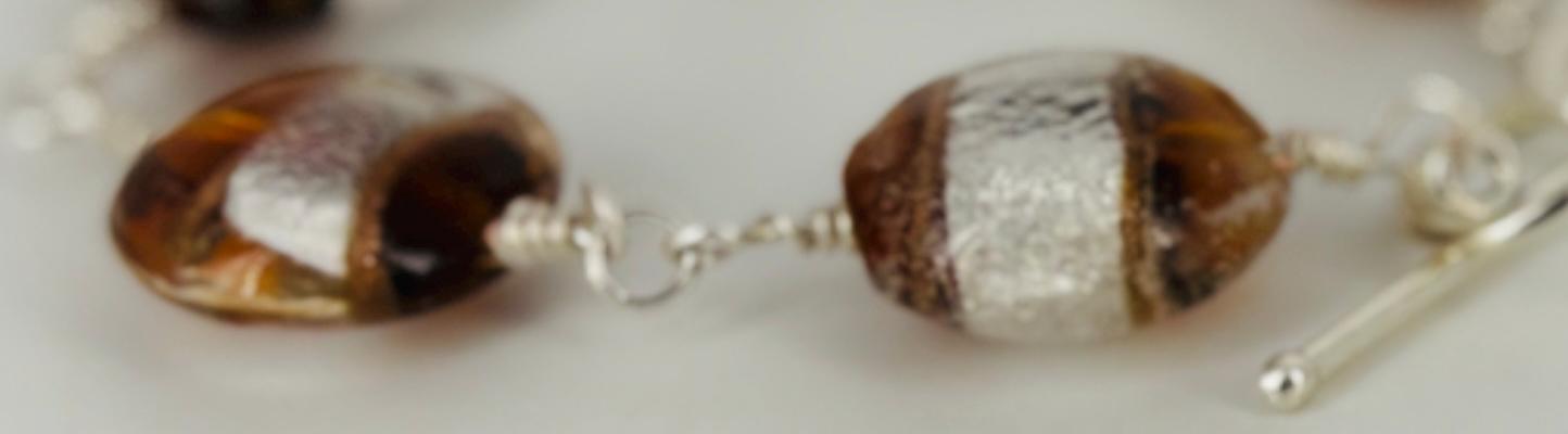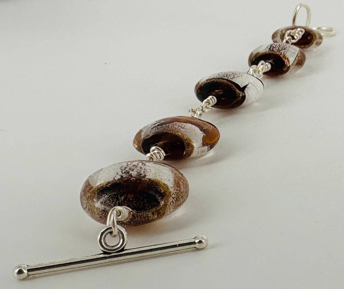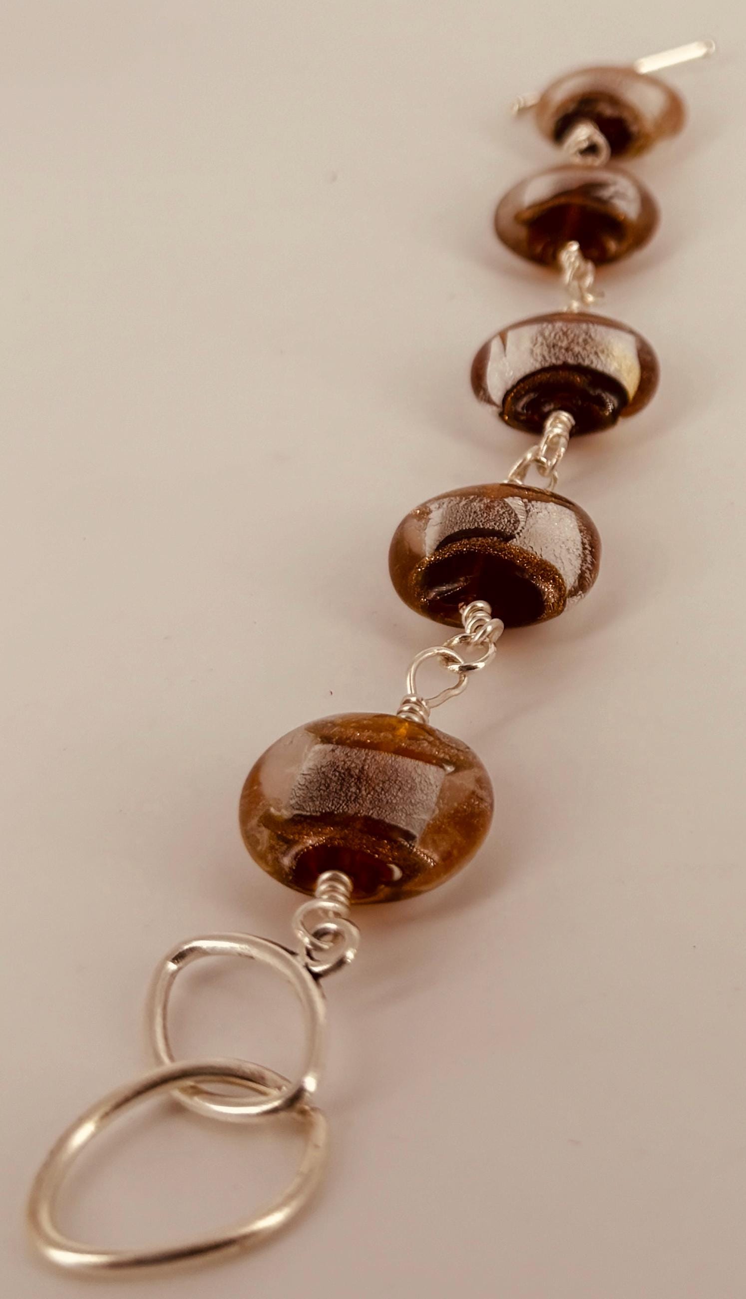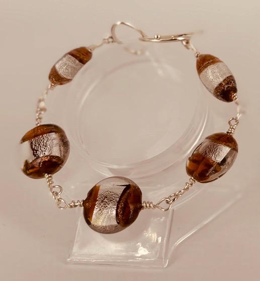 Large Czech glass foil lined beads bracelet. Silver & brown coloured beads with silver toggle fastener. Length 20cm(8in) extends to 21cm (8.5in).