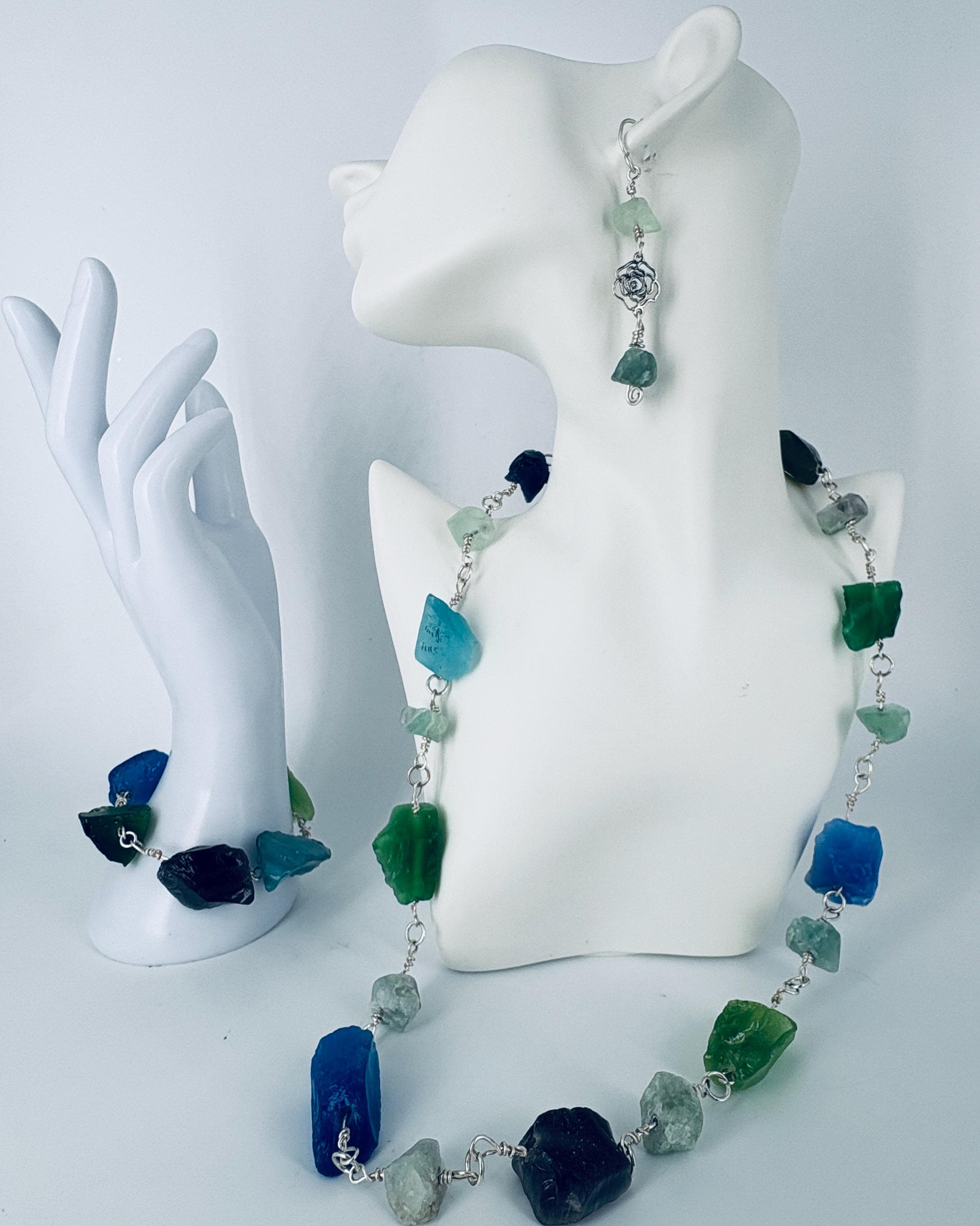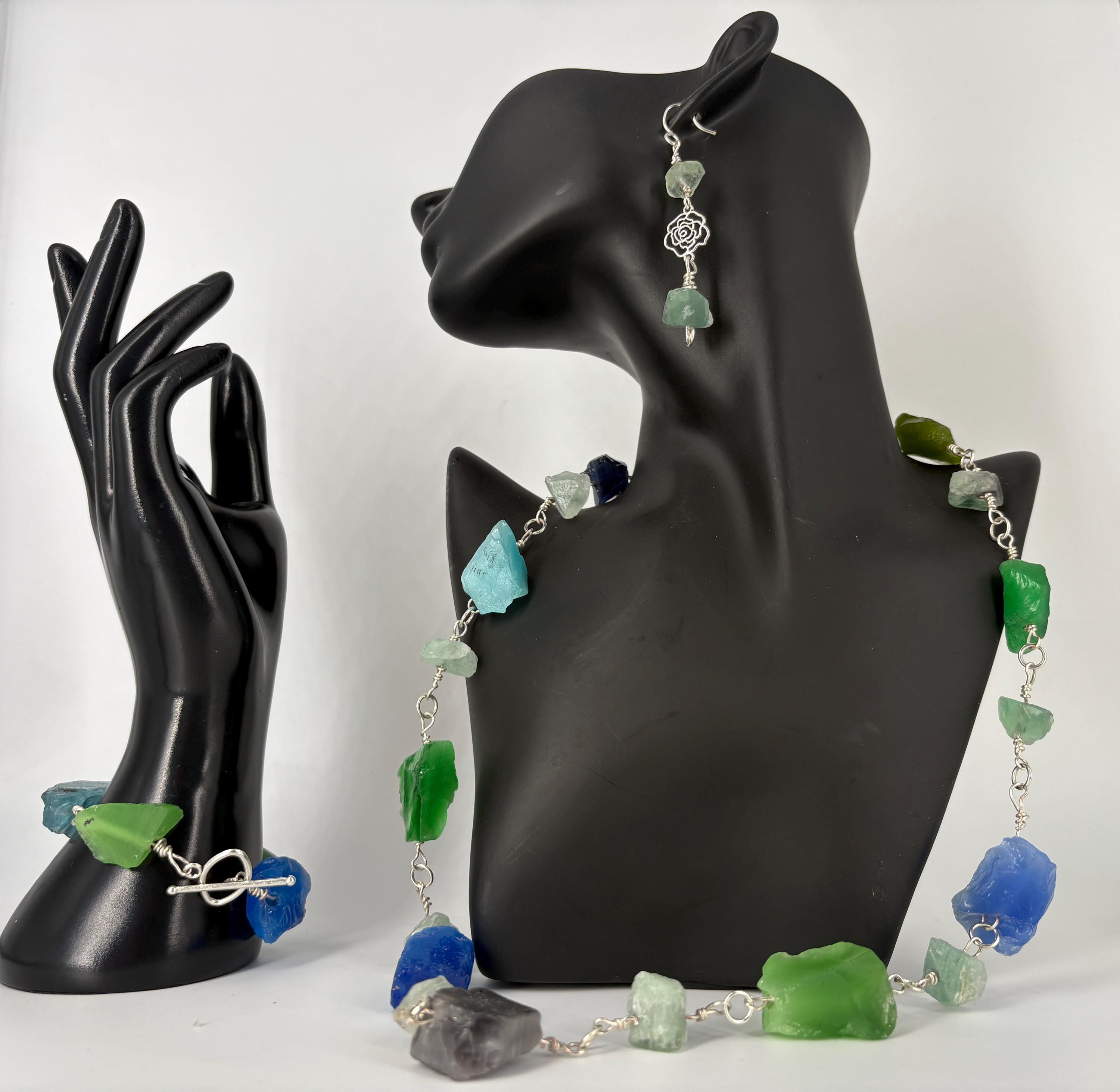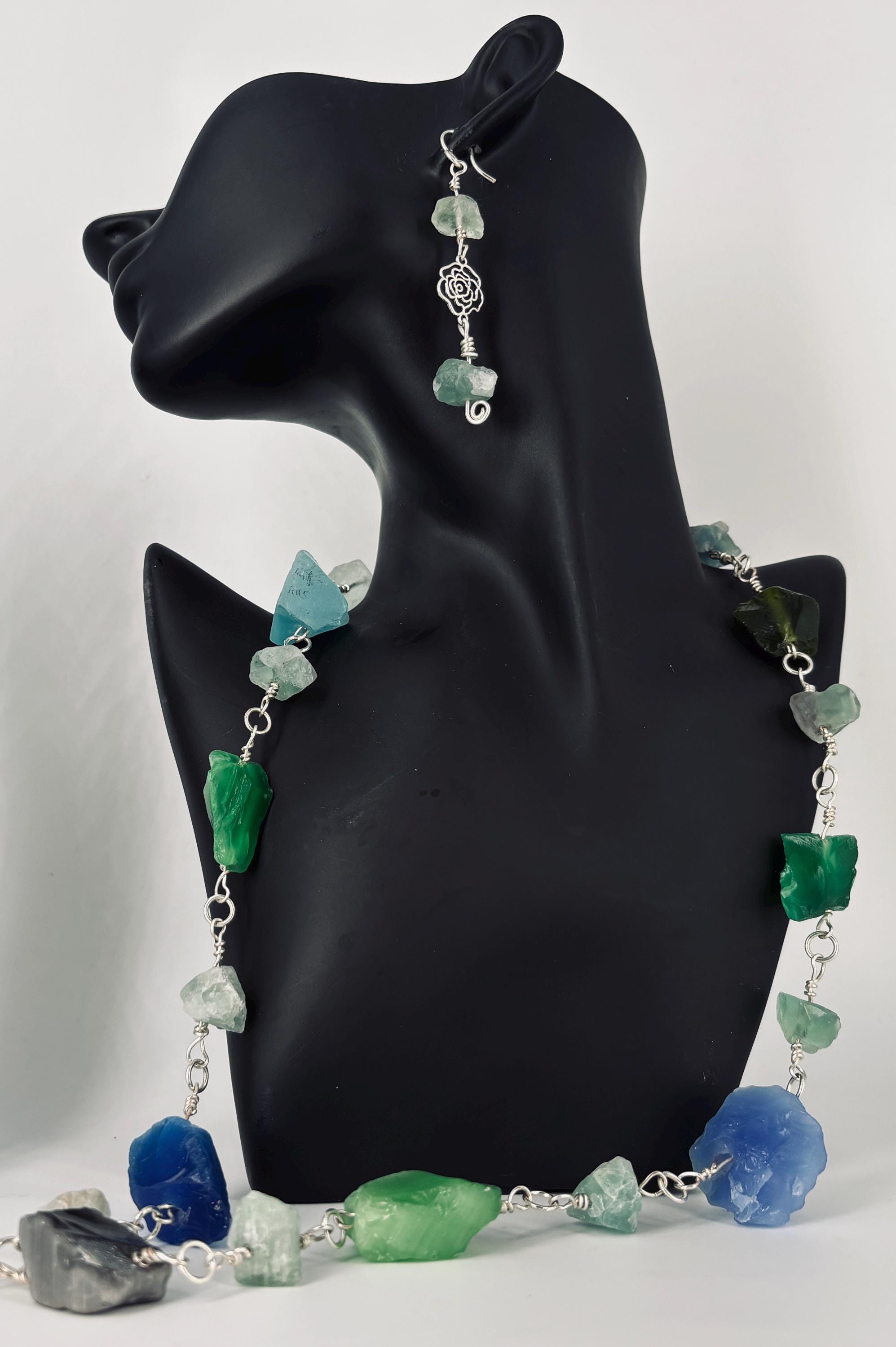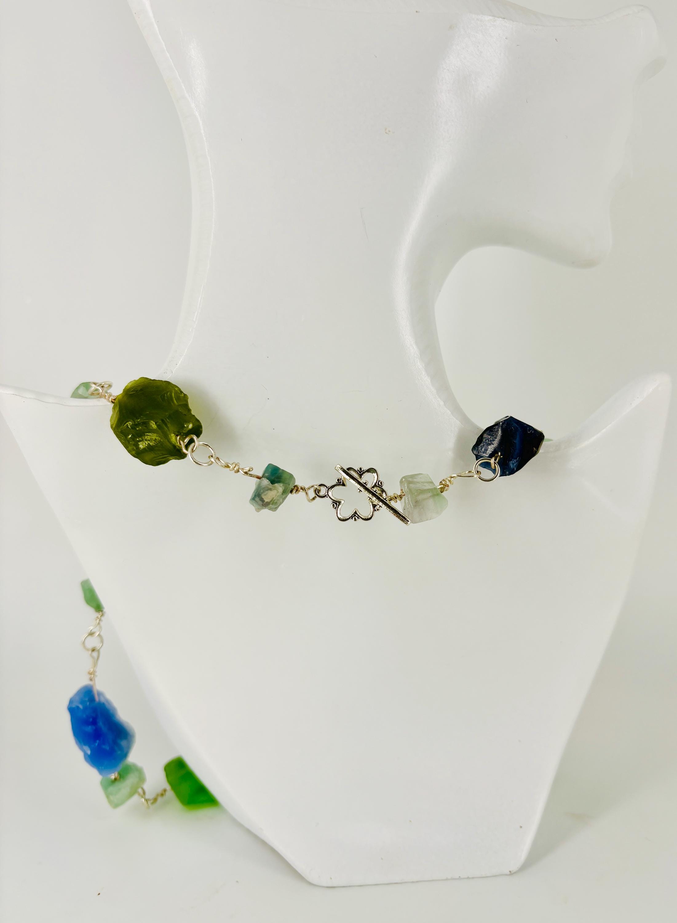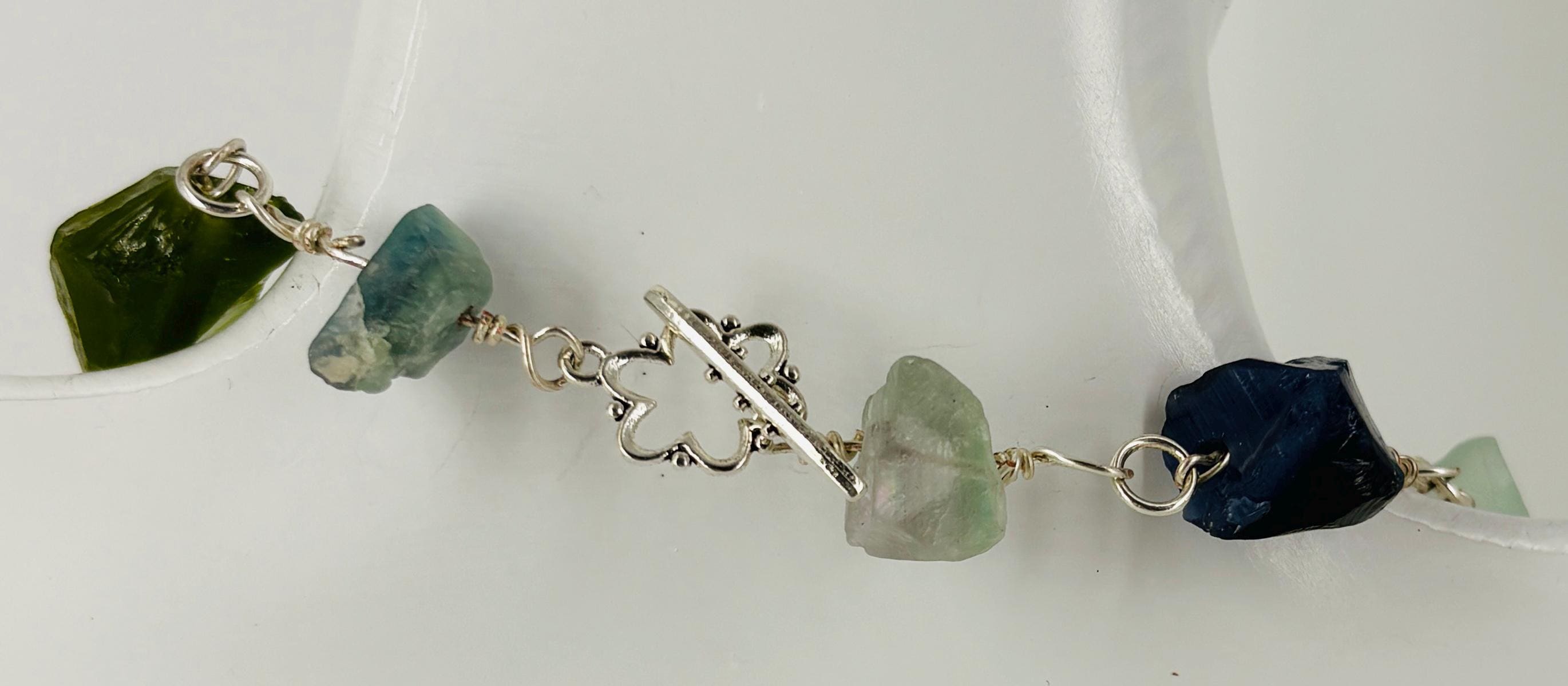 Cats Eye stone nuggets (large) and Flourite nuggets (small) Rock Necklace. Silver plated wire and clasp. Matching bracelet sold separately - see other listing.