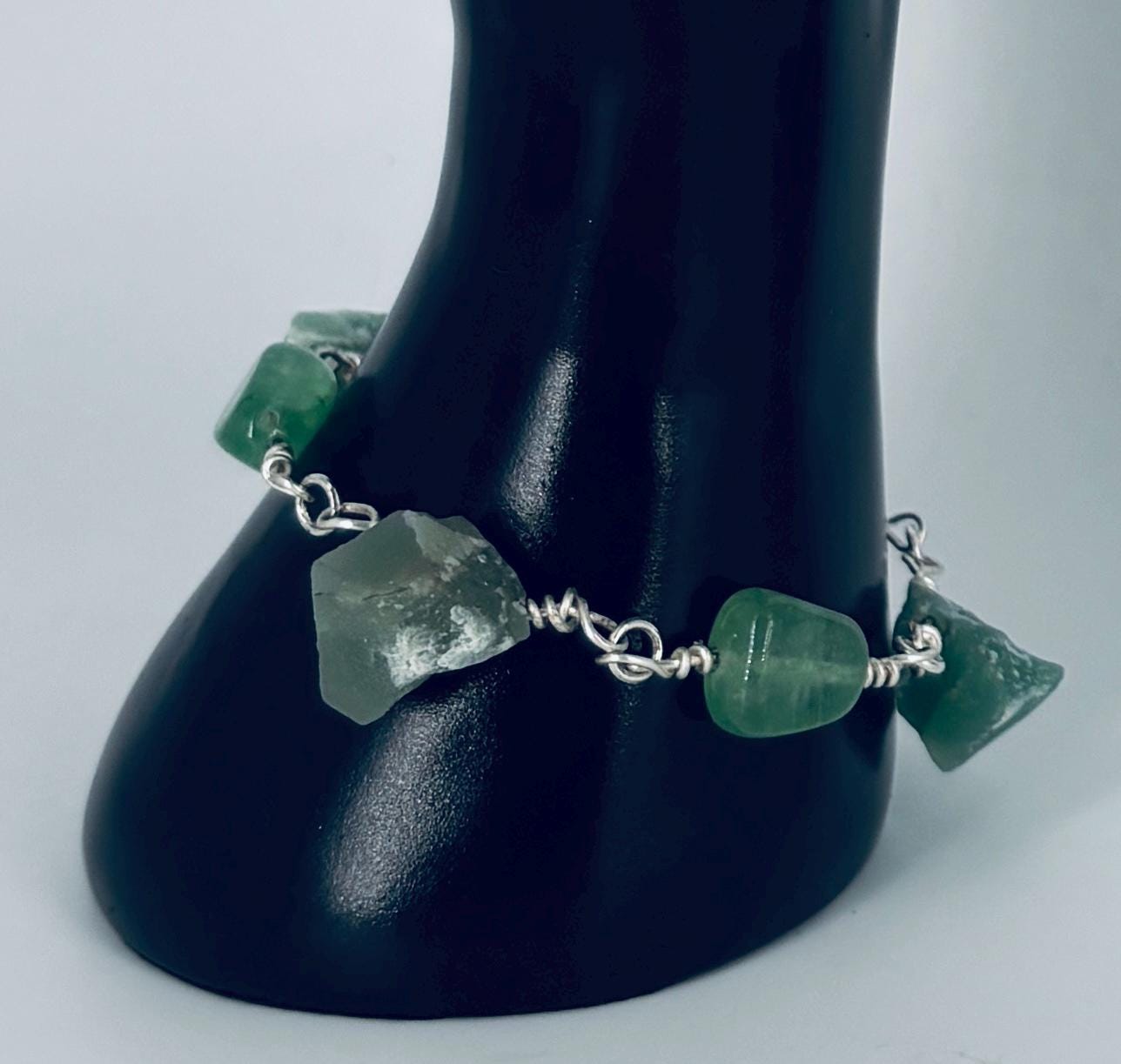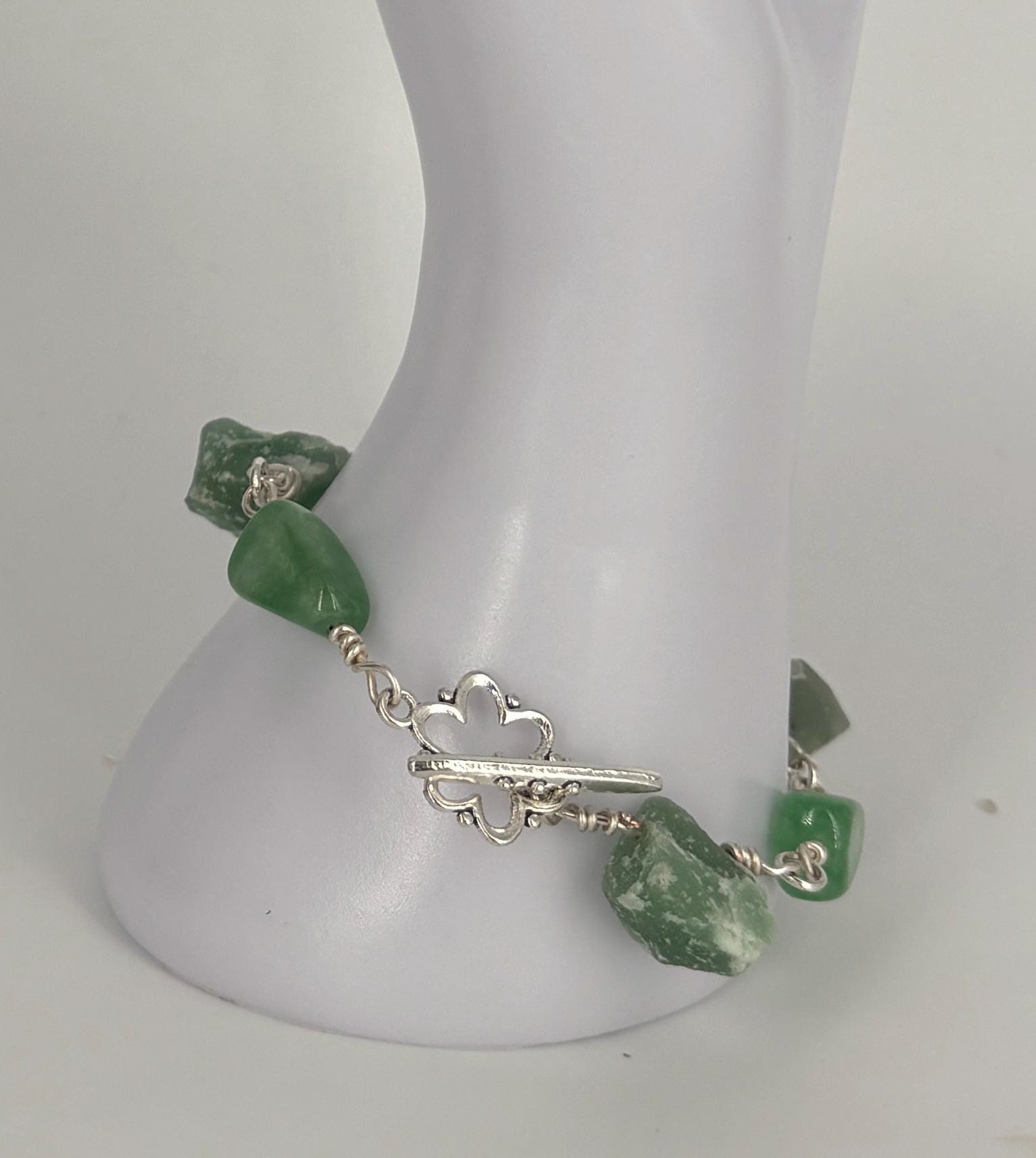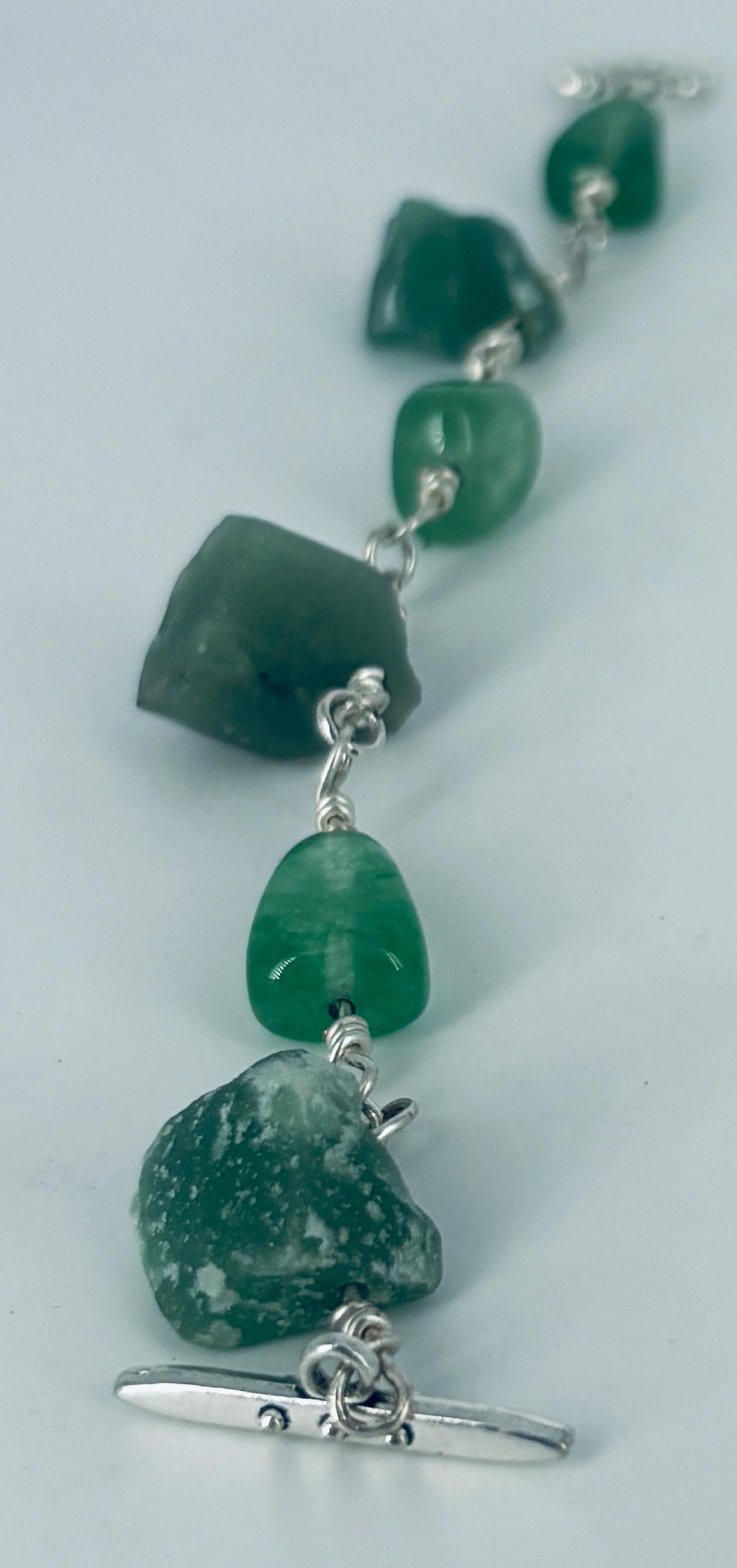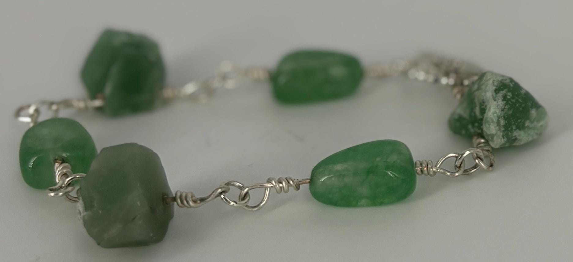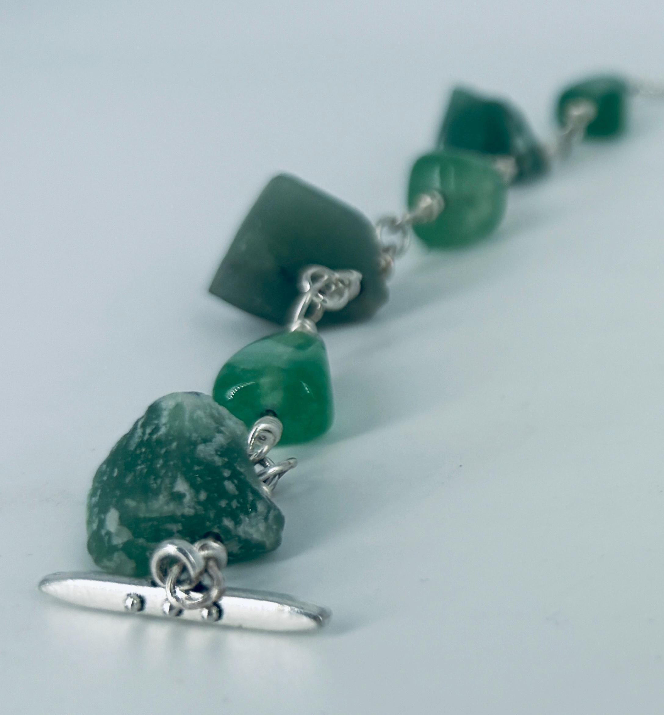 Green Adventurine nuggets and beads linked bracelet with silver wire and clasp.