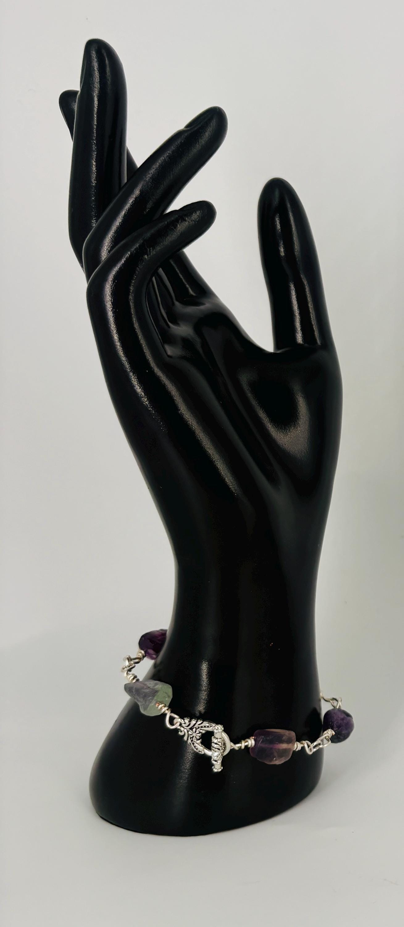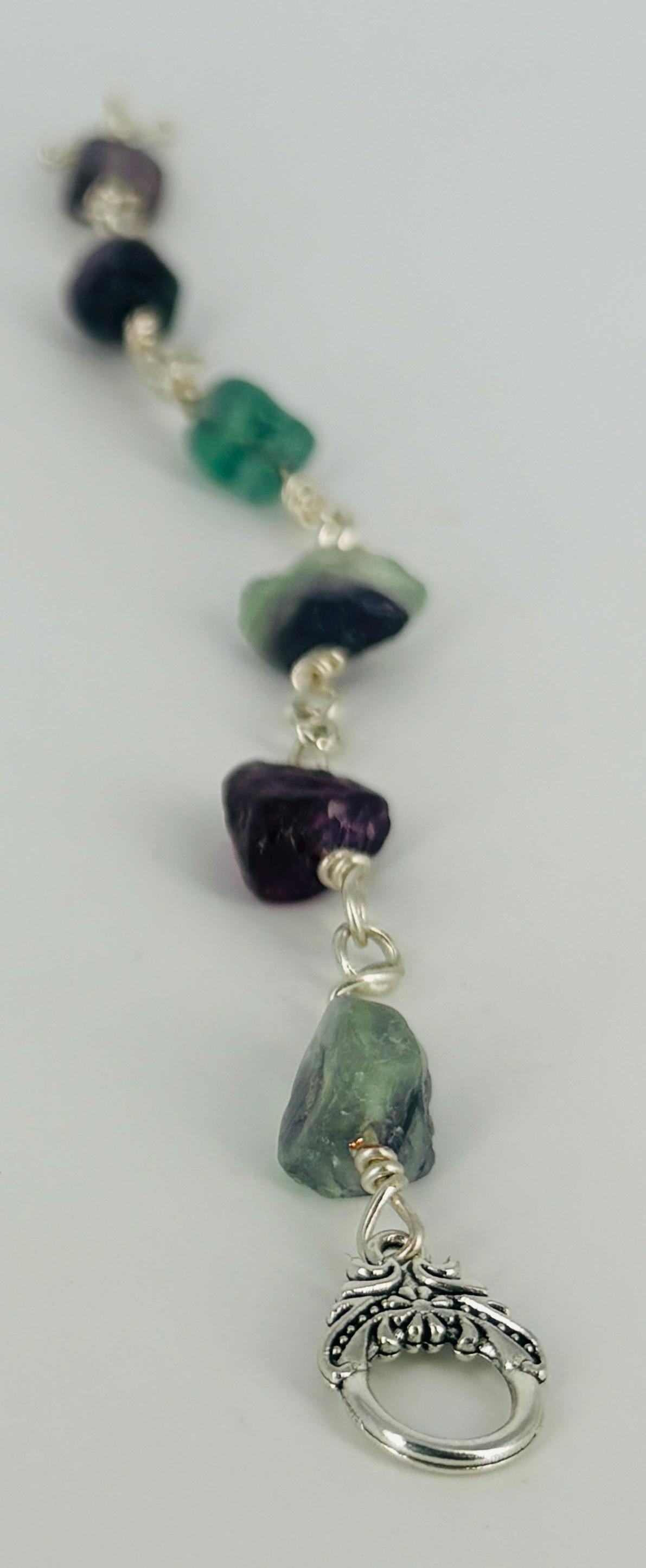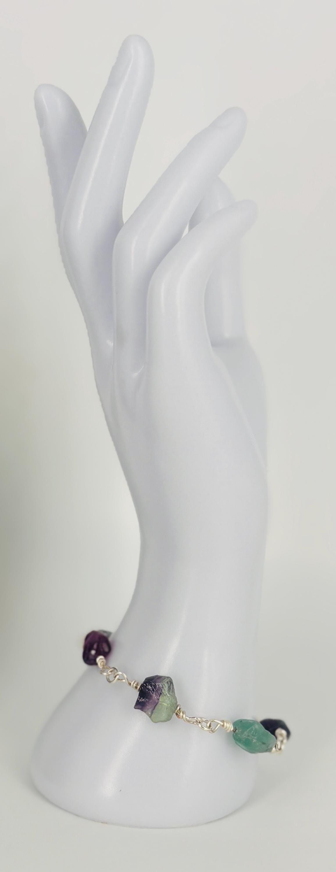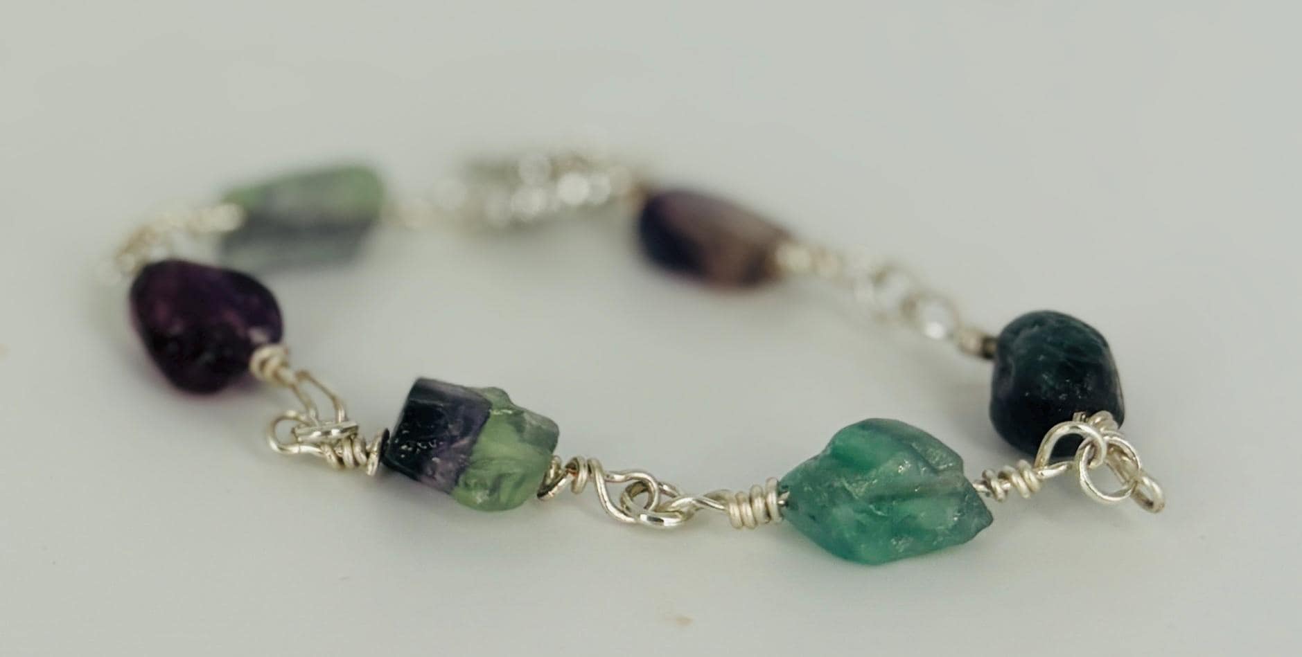 Natural Fluorite very small nugget beads linked bracelet with silver wire and clasp. In shades from purple to blue to green.
