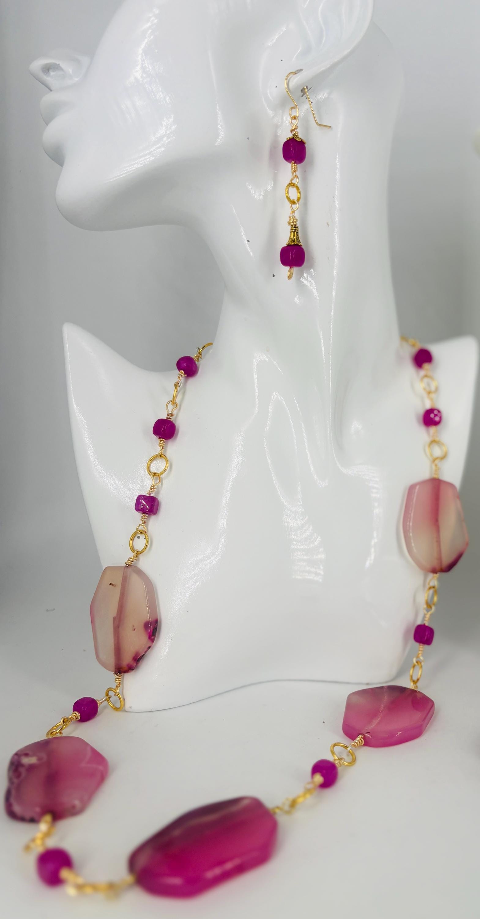 Stunning large transparent flat oval Agate ‘slice’ beads in light purple/pink with small Agate beads necklace. Joined by small Agate beads in purply-pink and gold plated wire links. Sold separately without bracelet. See other listing.