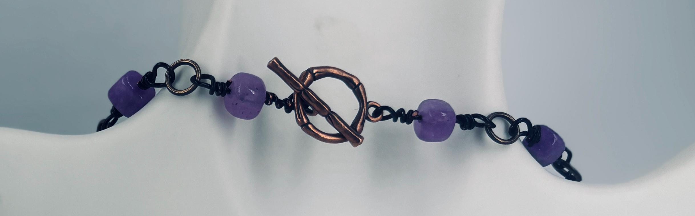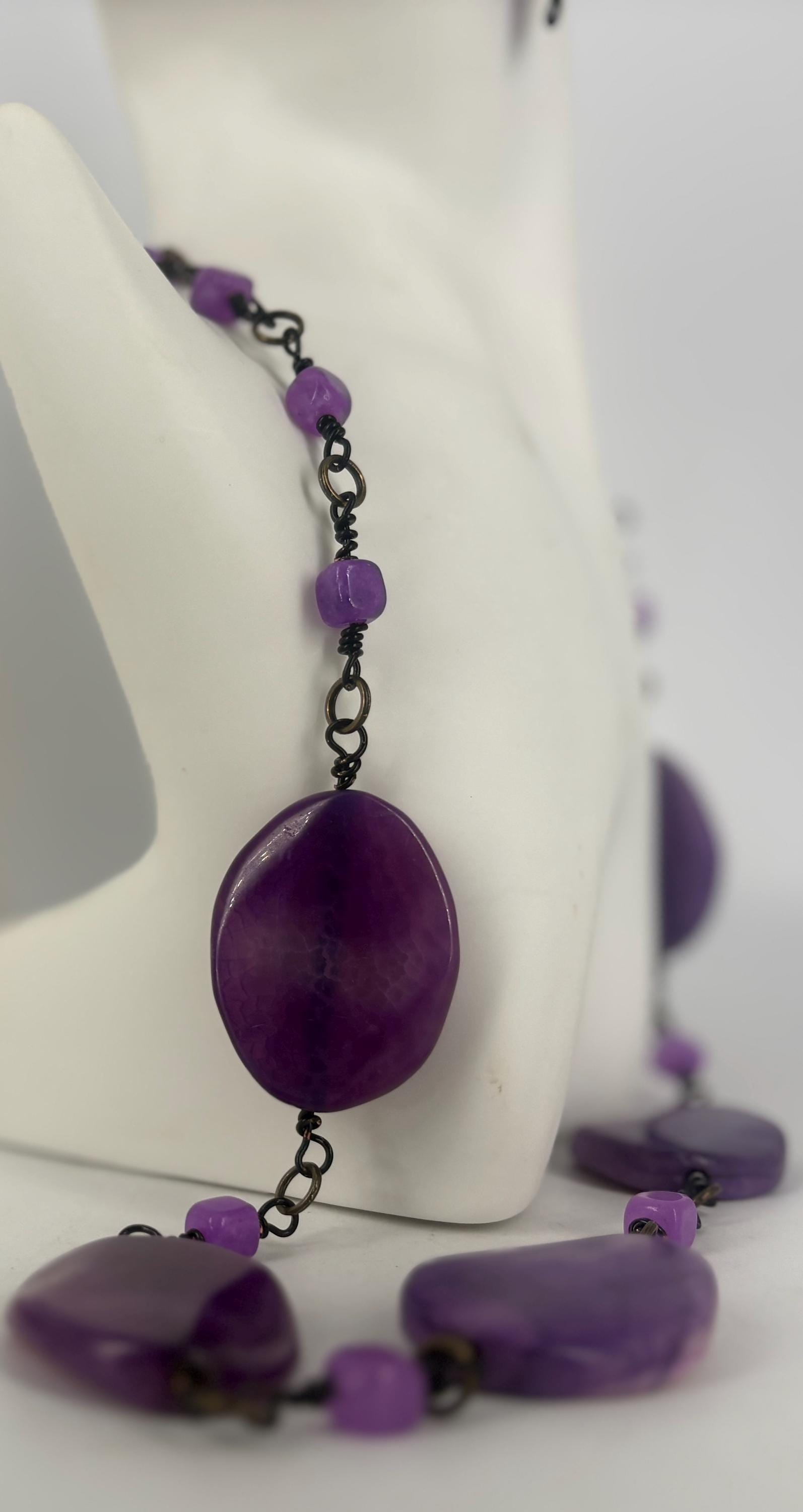 Stunning large flat purple coloured oval Agate beads with small Agate beads necklace & matching earrings. Joined by small Agate beads in purple and black coated copper wire links.