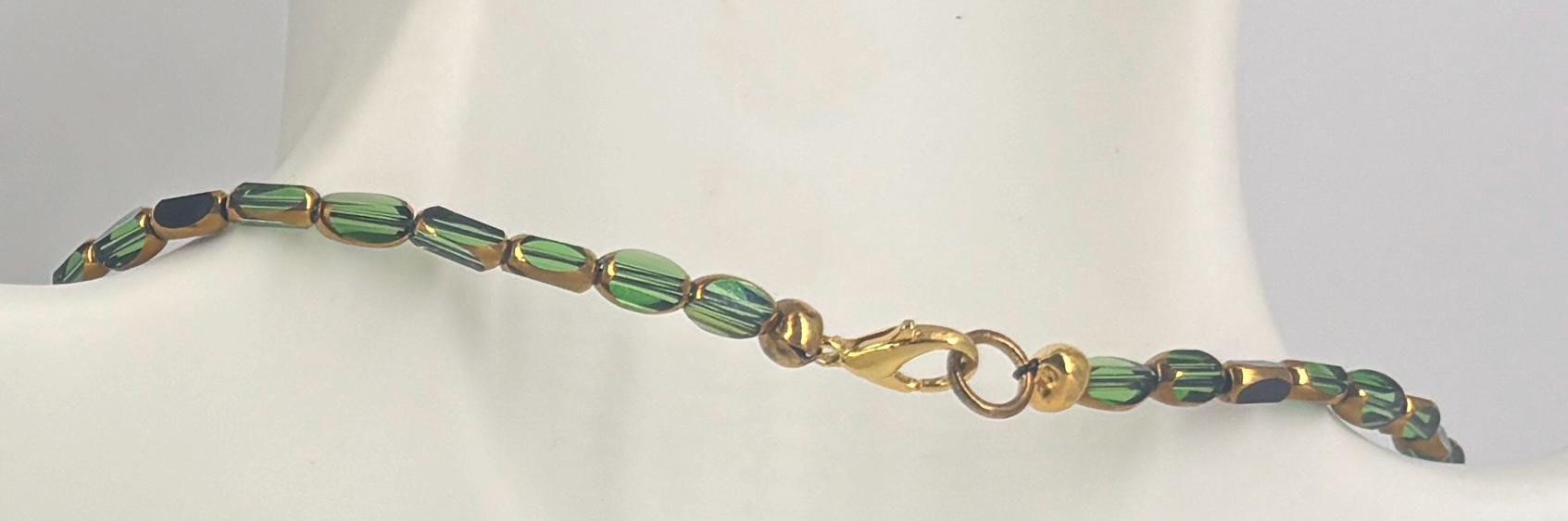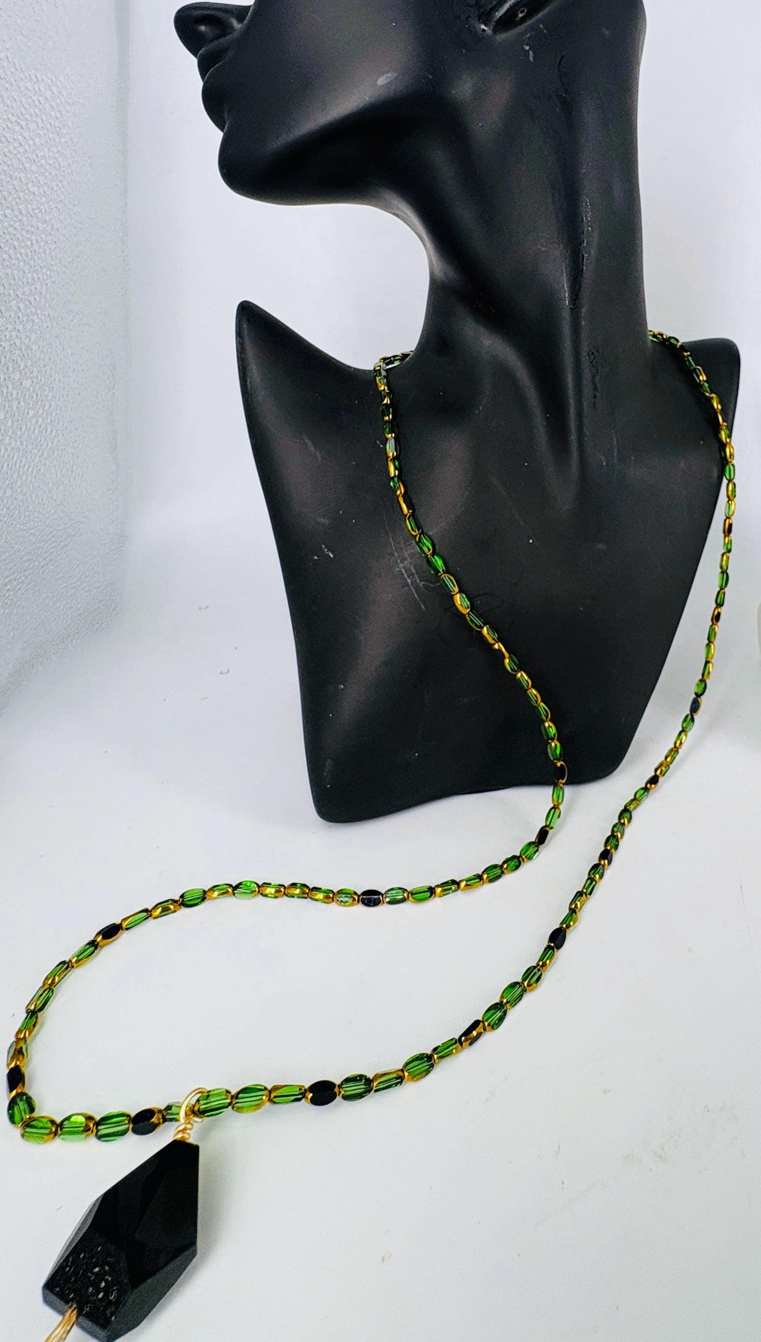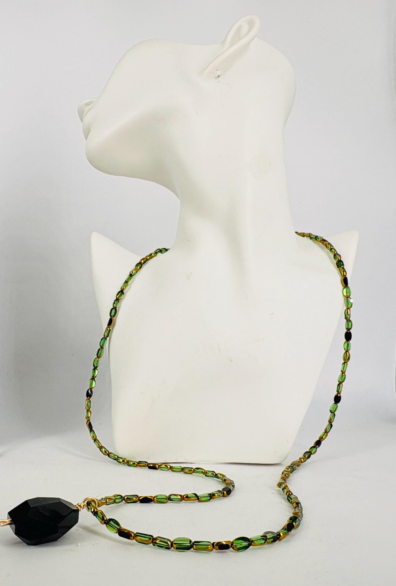 Long pendant necklace of small green Czech glass beads, large black bead pendant. Length 84cm, drop 42cm + 2.5cm pendant bead.