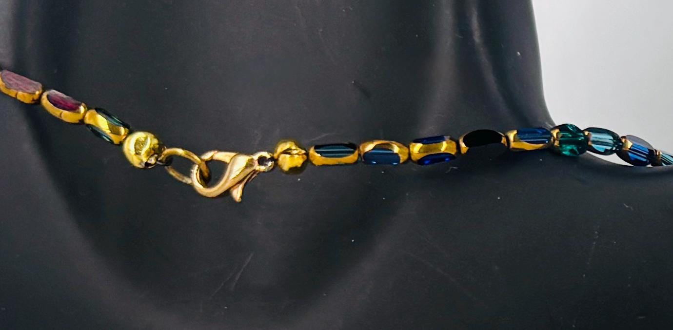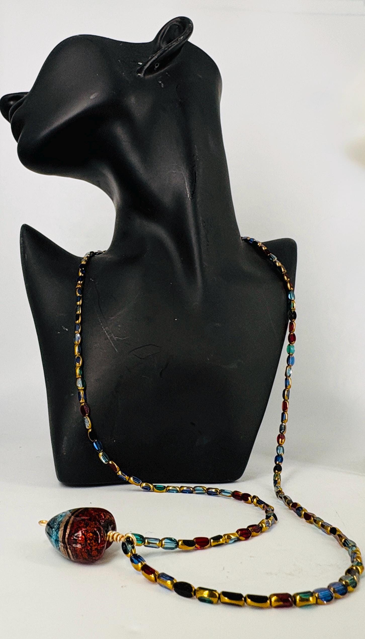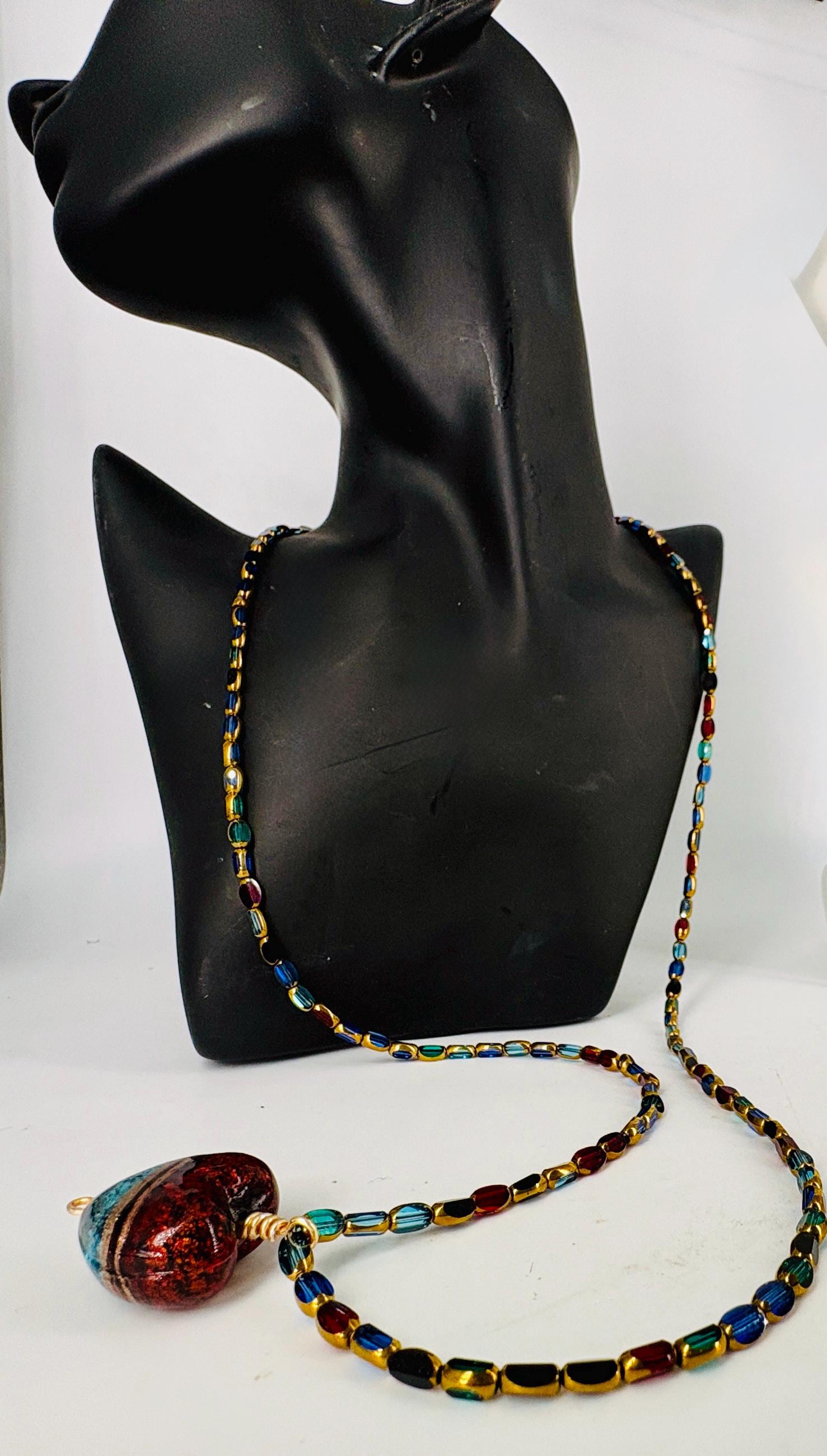 Long pendant necklace of small blue, red and black Czech glass beads, large red and blue heart bead pendant. Necklace full length 84cm, drop 42cm plus heart bead 3cm.